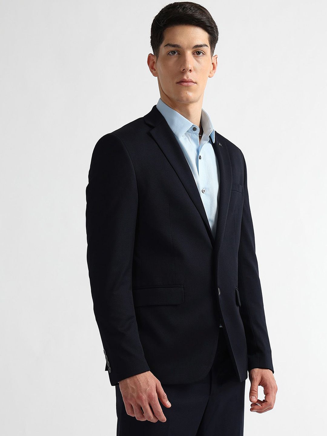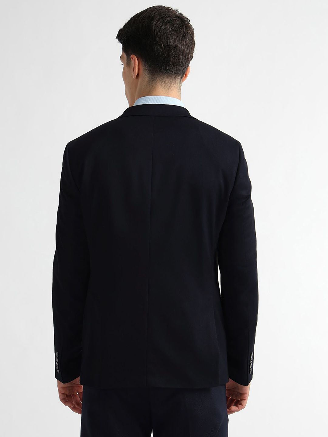 Black solid trailered fit single-breasted blazer, has a notched lapel collar, long sleeves, double vent, button closure with curved hem & three pockets
