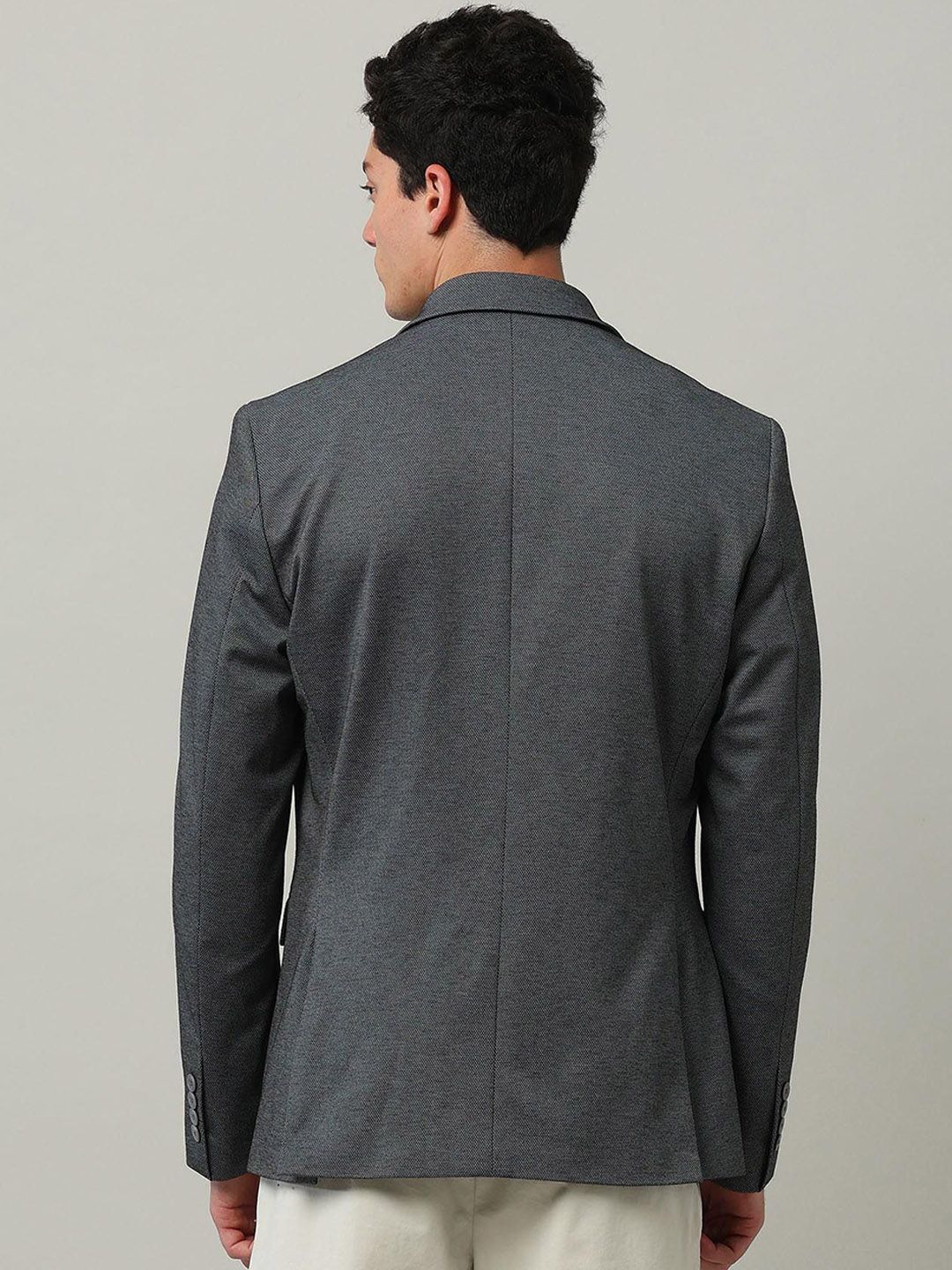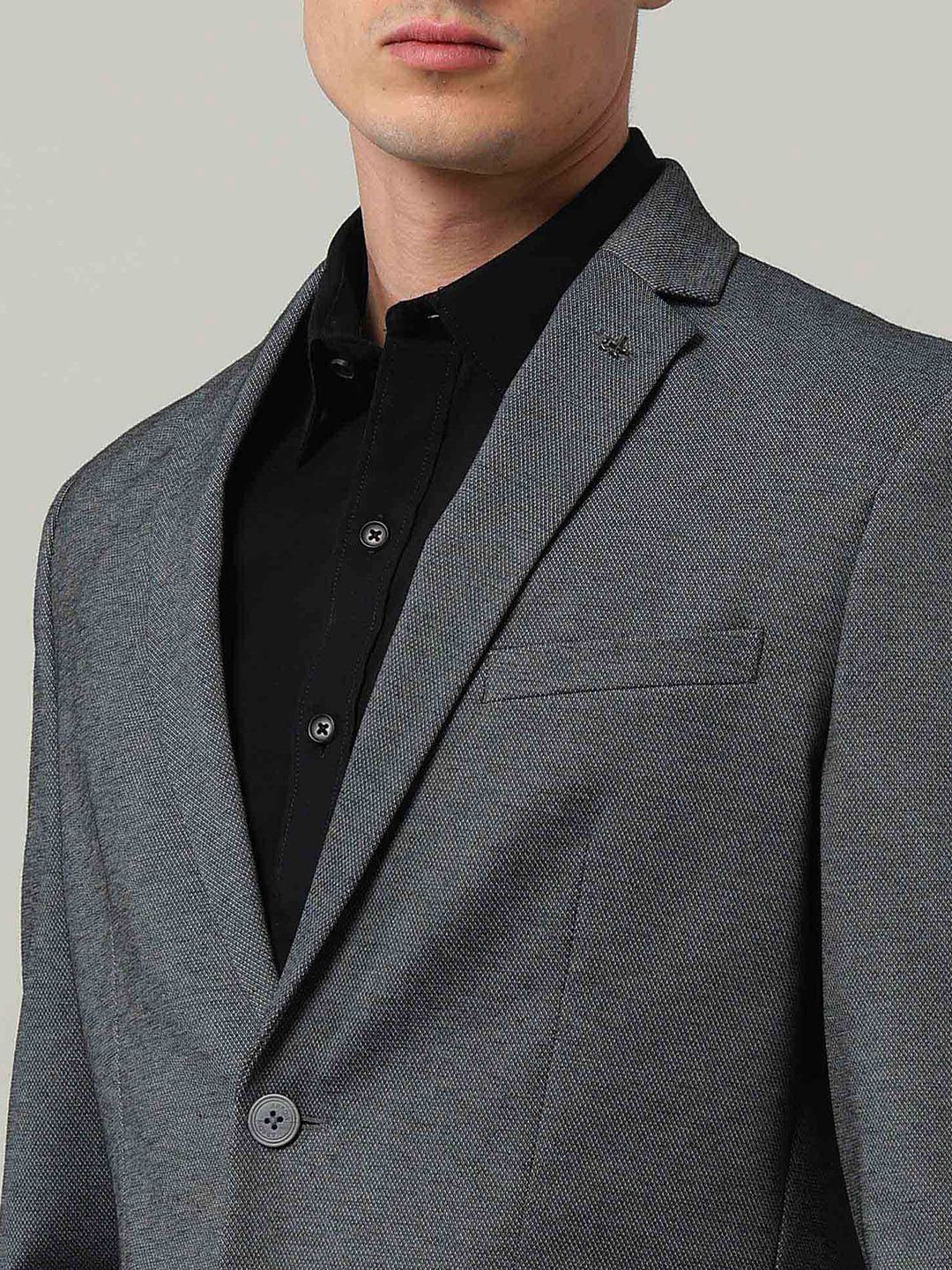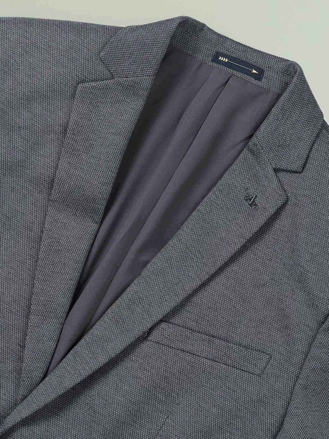 Grey self design slim-fit smart-casual blazer, has a notched lapel, long sleeves, single-breasted with double button closure, two flap pockets, one welt pocket and a single-vented back hem
