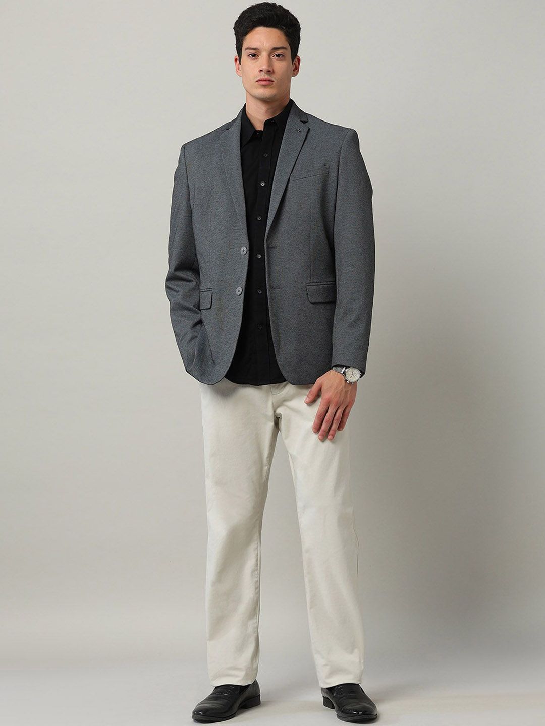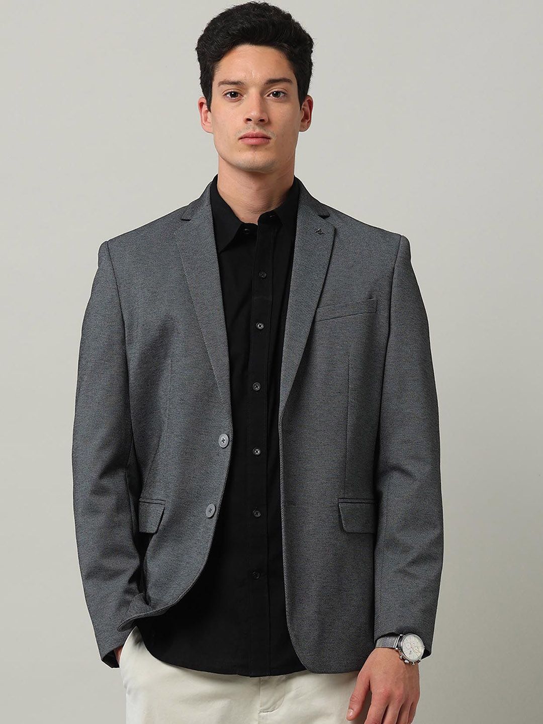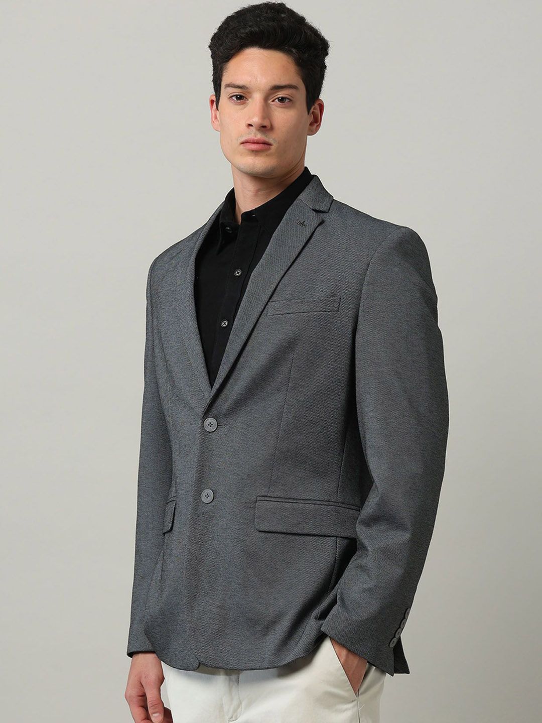 Grey self design slim-fit smart-casual blazer, has a notched lapel, long sleeves, single-breasted with double button closure, two flap pockets, one welt pocket and a single-vented back hem