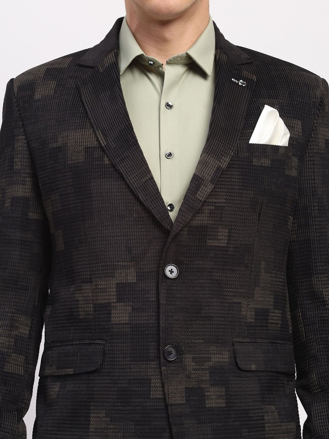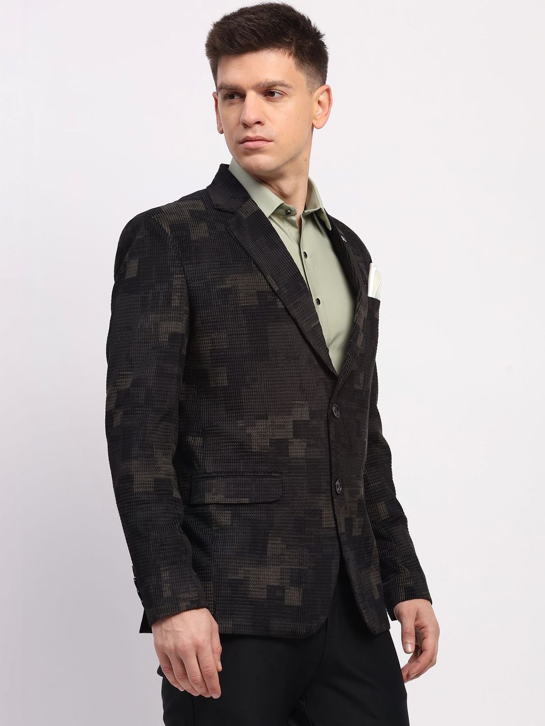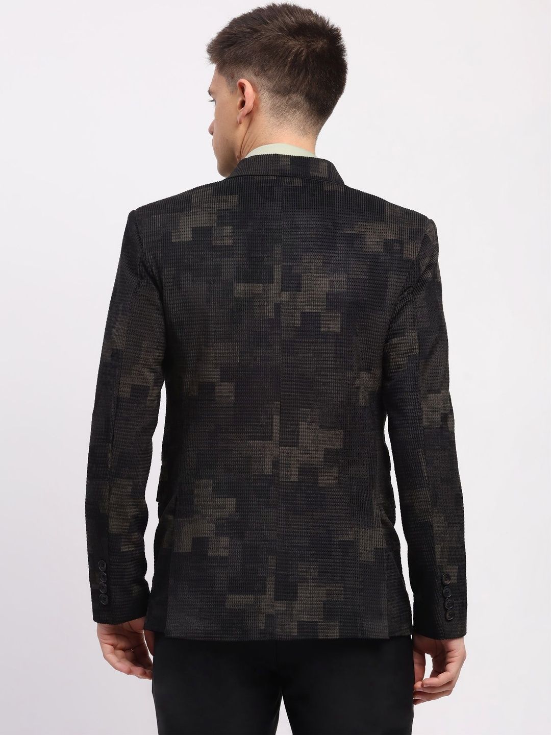 Black printed regular-fit casual blazer, has a notched lapel, long sleeves, single-breasted with double button closure, two flap pockets, one welt pocket and a double-vented back hem