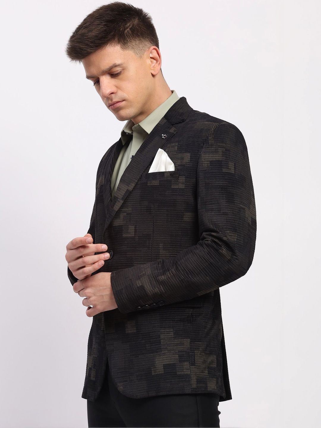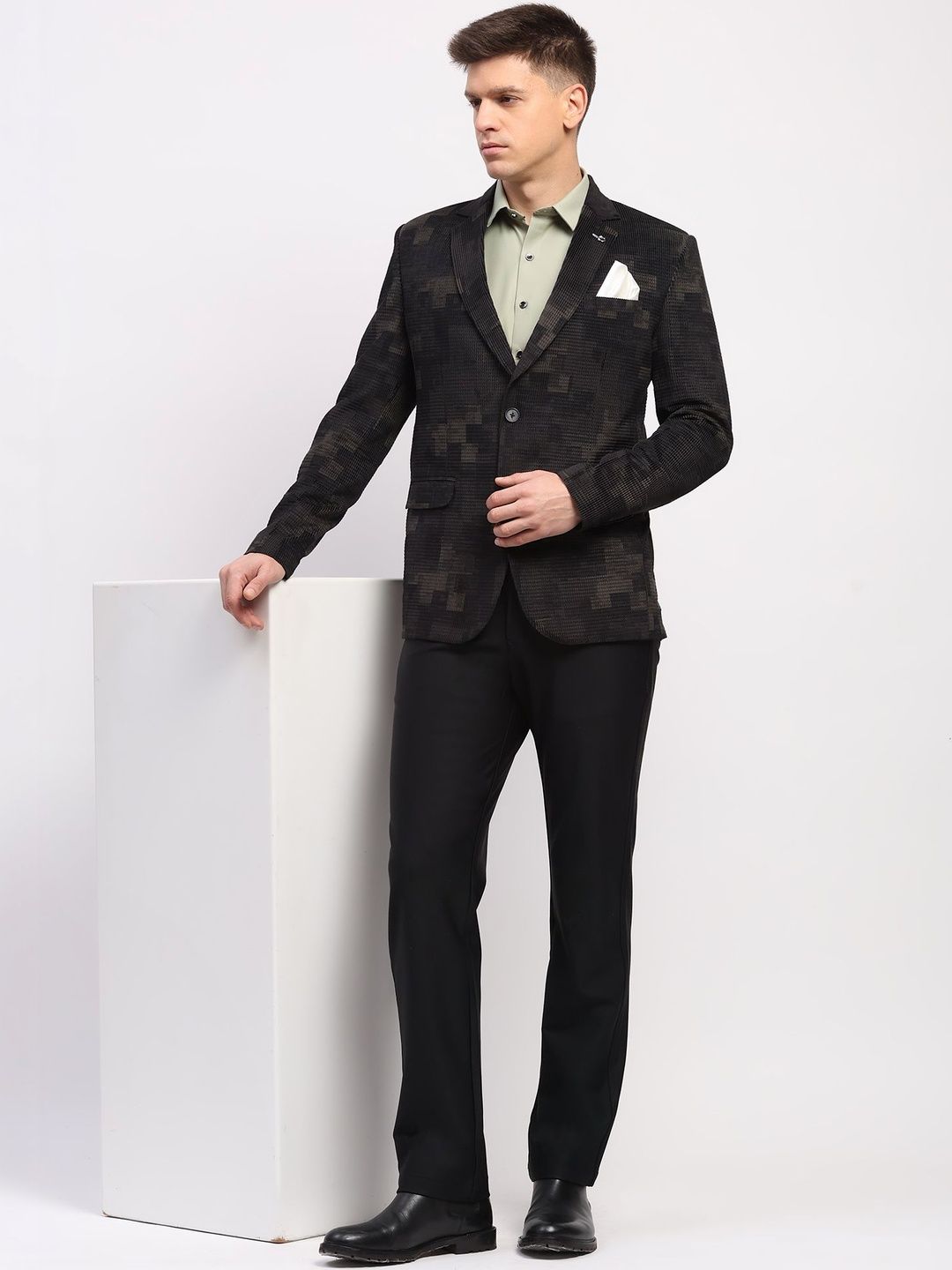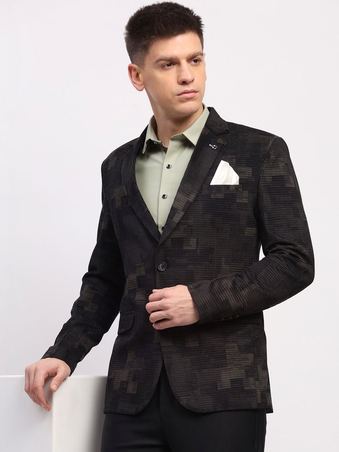 Black printed regular-fit casual blazer, has a notched lapel, long sleeves, single-breasted with double button closure, two flap pockets, one welt pocket and a double-vented back hem