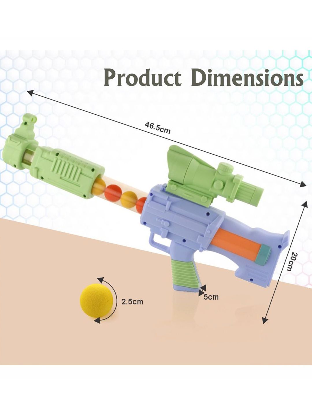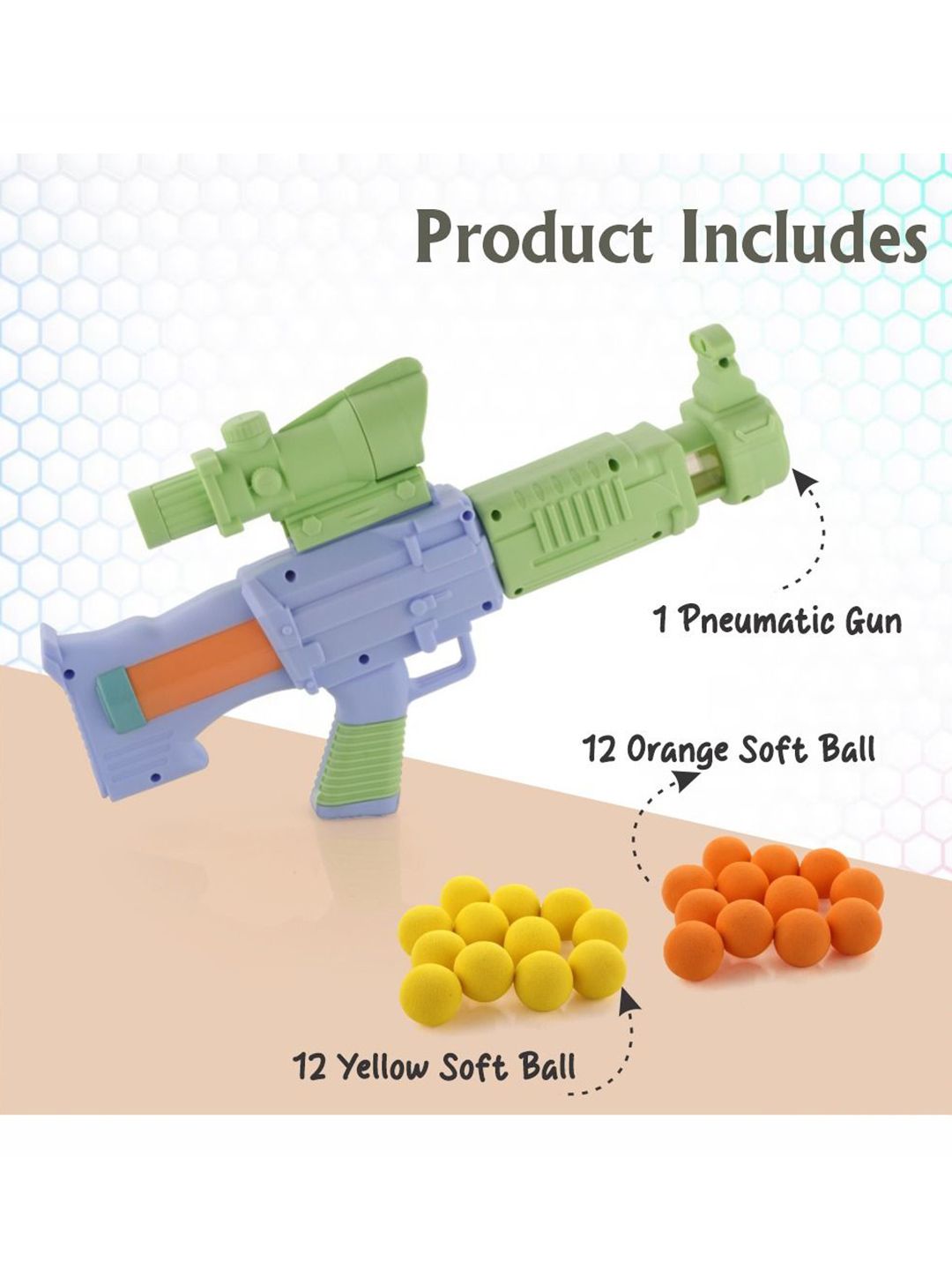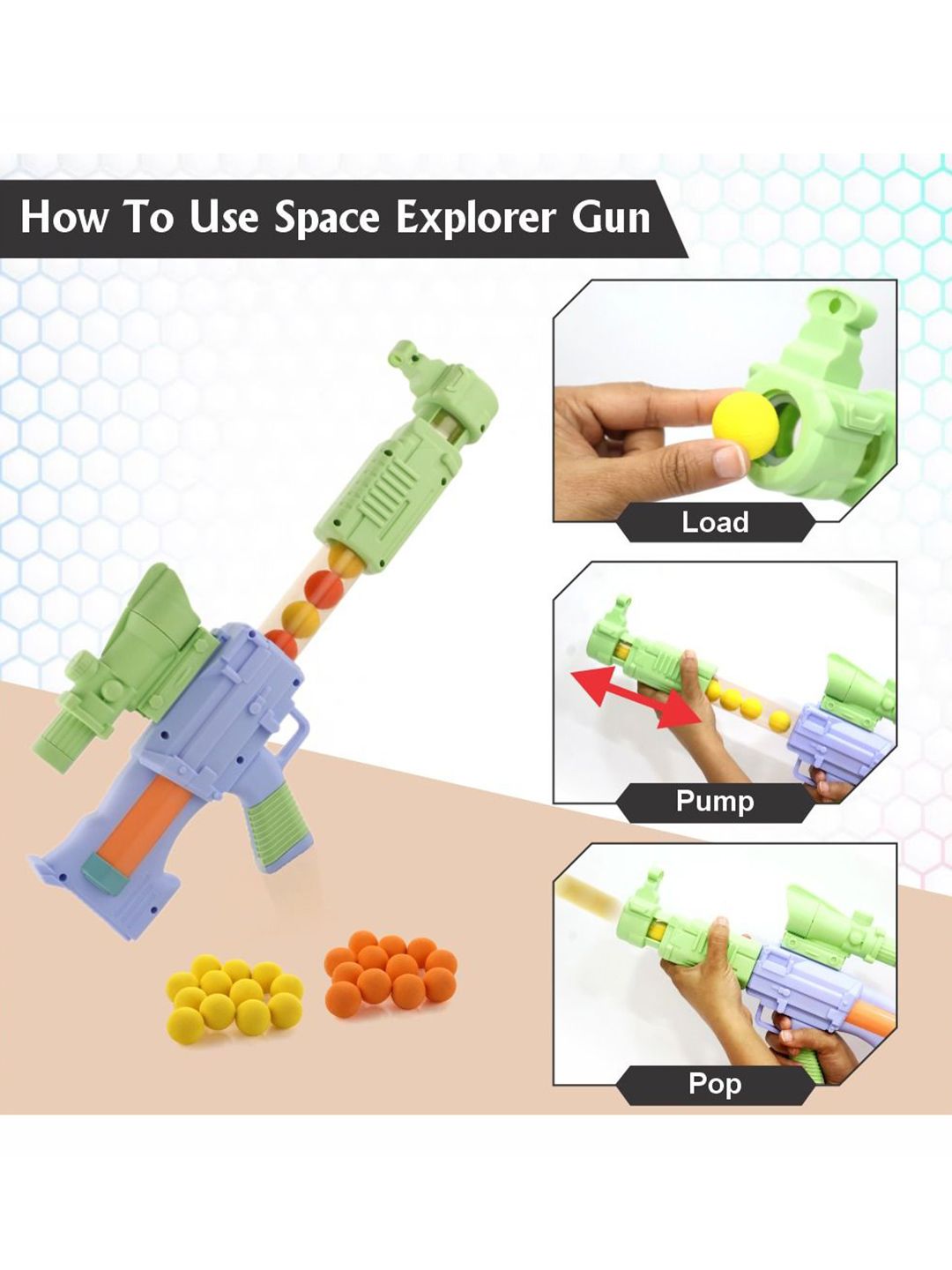 How To Use: Insert a soft ball into the chamber, ensuring it is securely in place for accurate firing. Push and pull the pump handle multiple times to build the necessary pressure for launching the ball. Aim the gun and release the ball with a satisfying pop, providing an exciting and interactive play experience.
