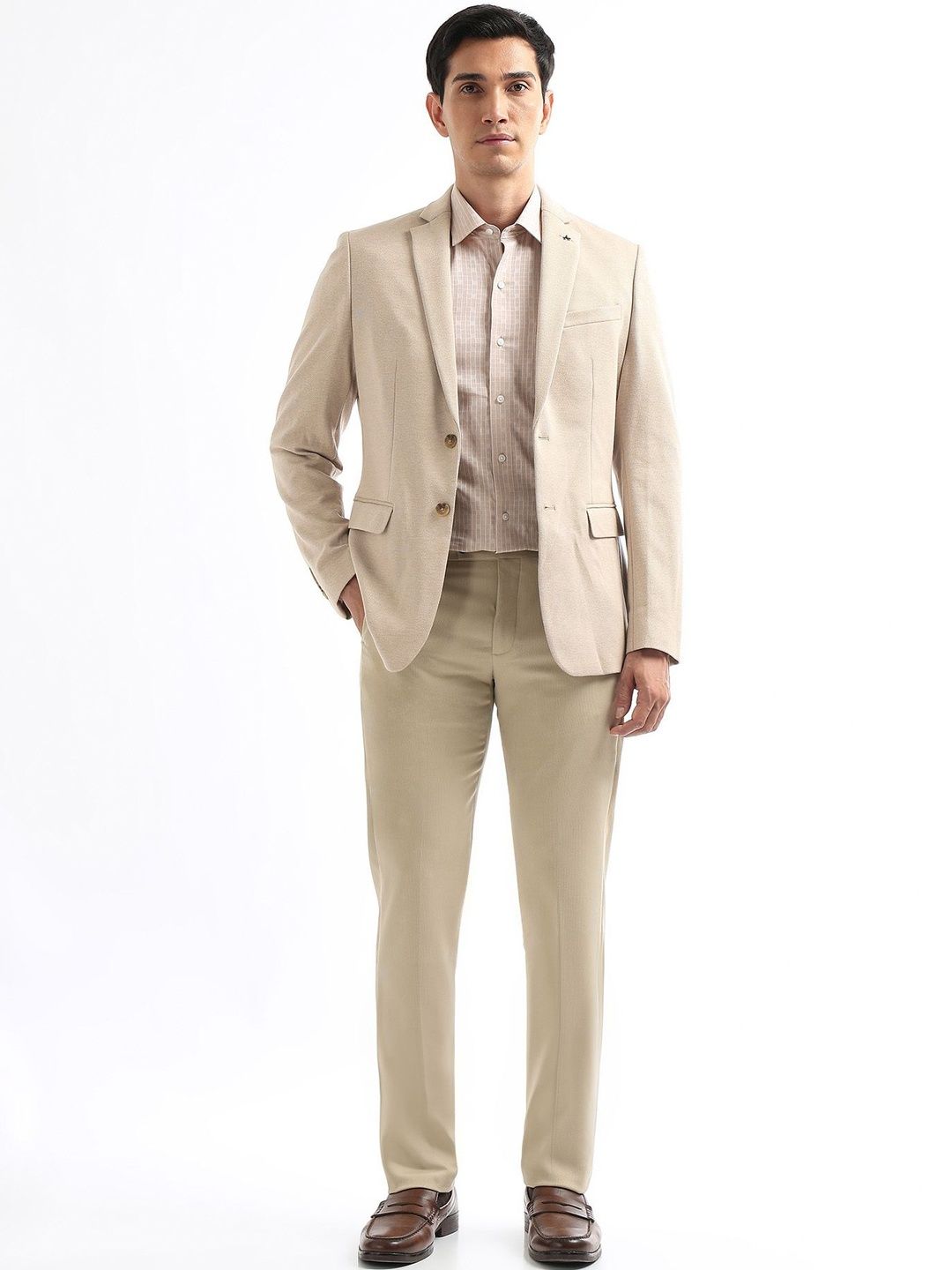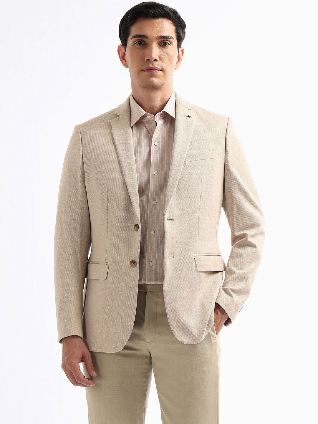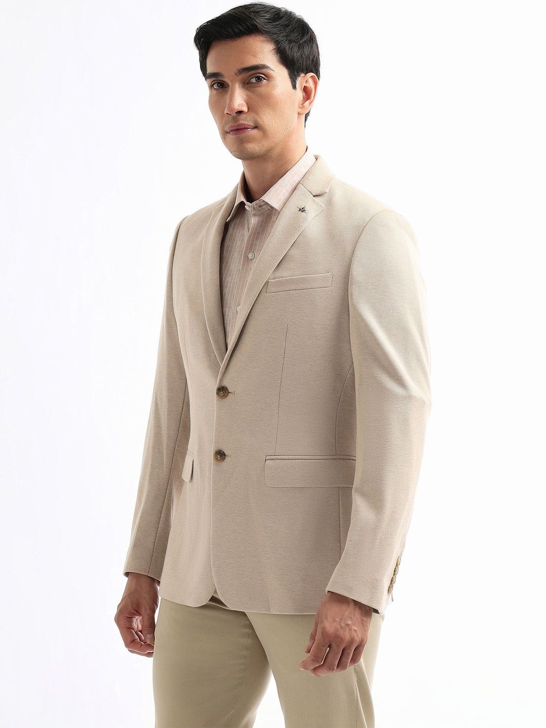 Beige solid slim-fit blazer, has a notched lapel, long sleeves, single-breasted with double button closure, two flap pockets, one welt pocket and a double-vented back hem