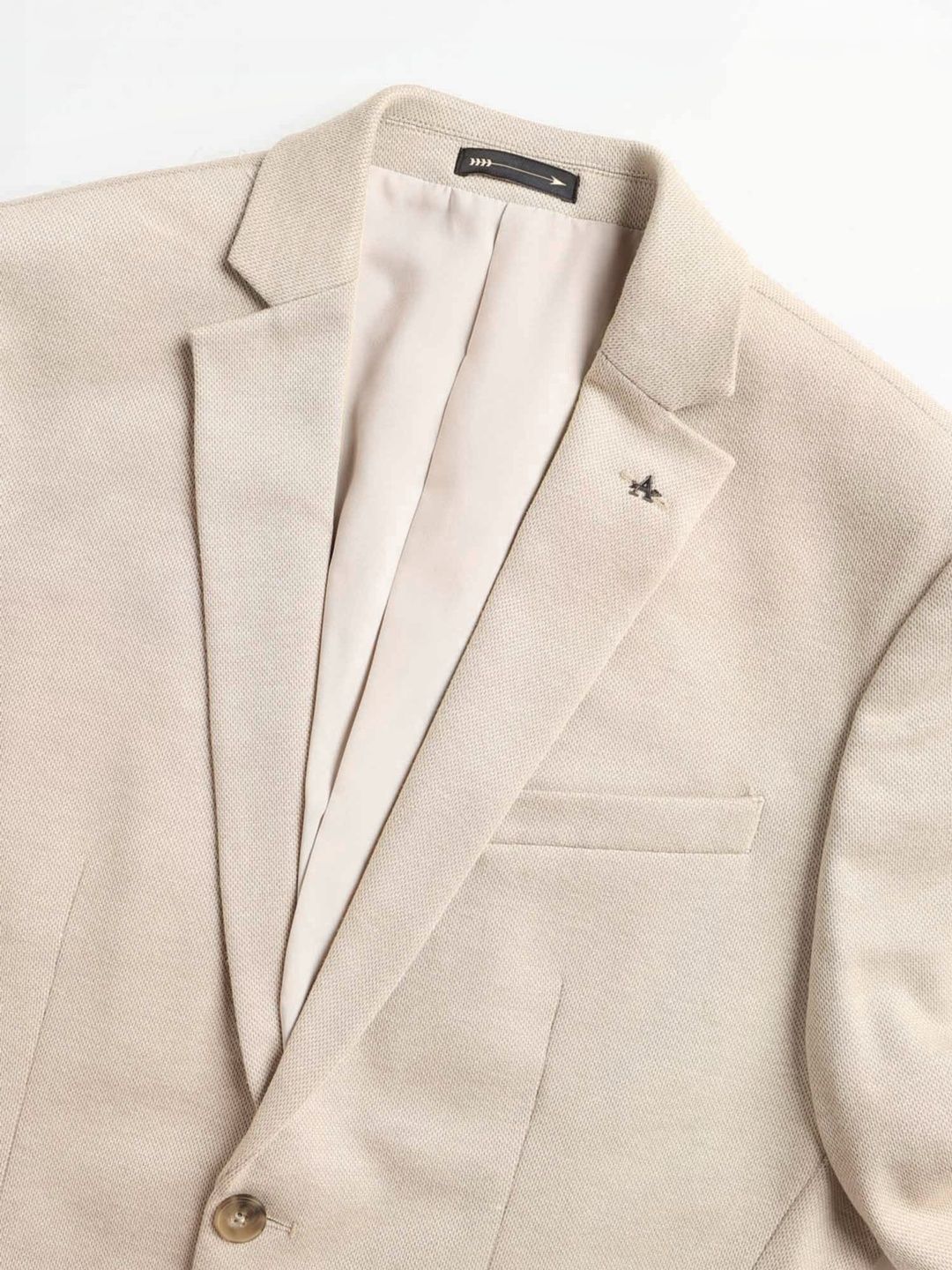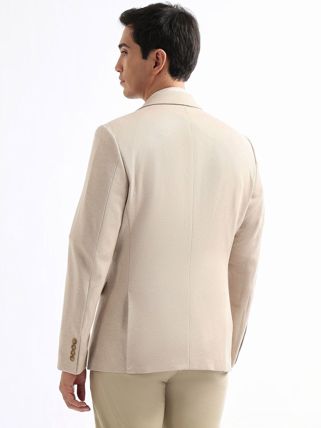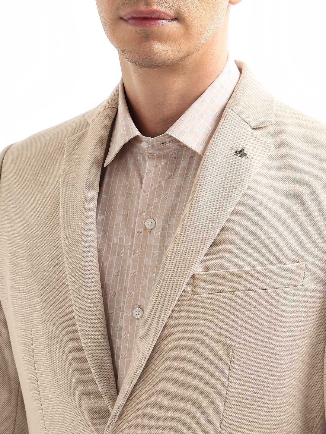 Beige solid slim-fit blazer, has a notched lapel, long sleeves, single-breasted with double button closure, two flap pockets, one welt pocket and a double-vented back hem