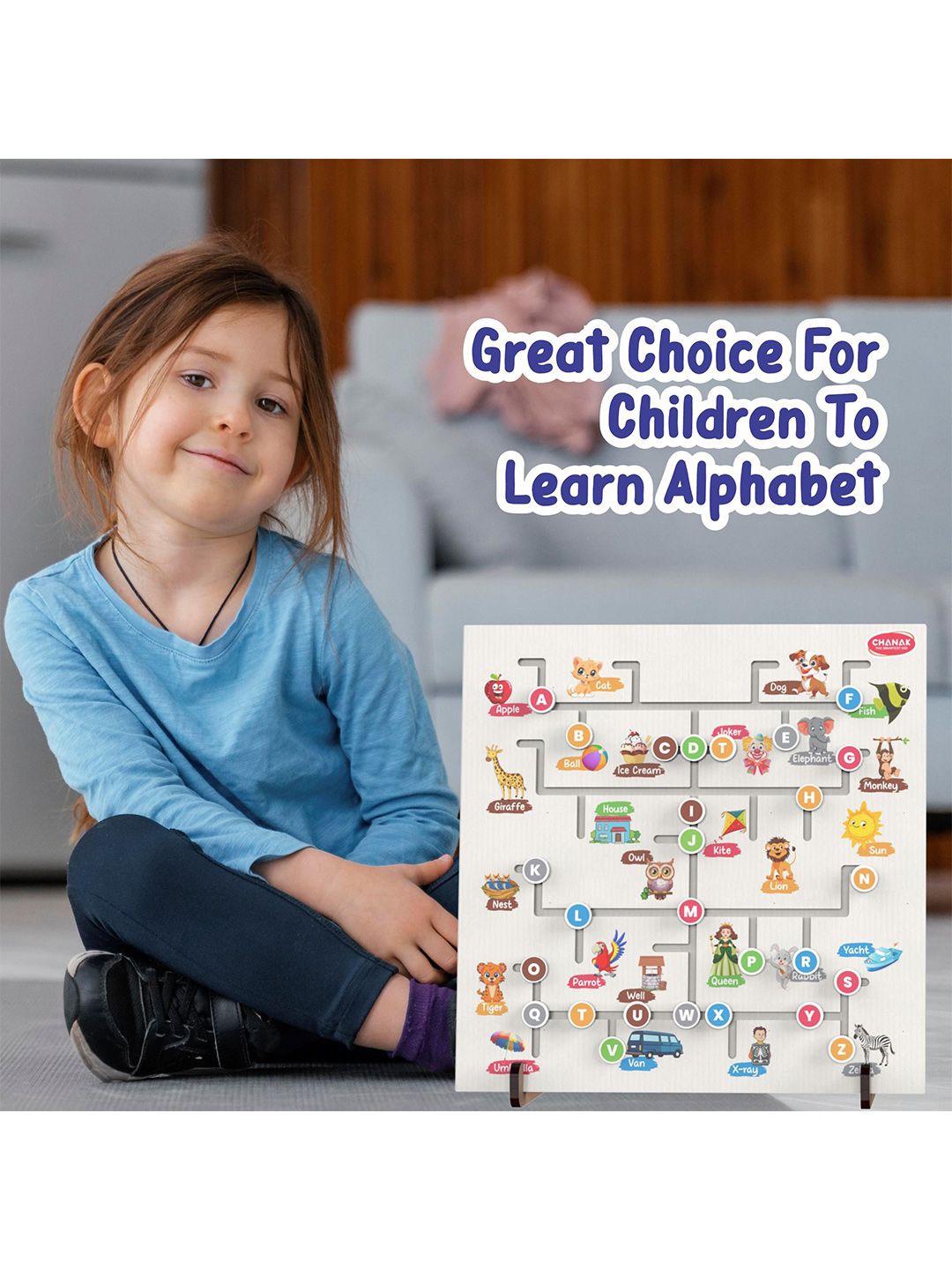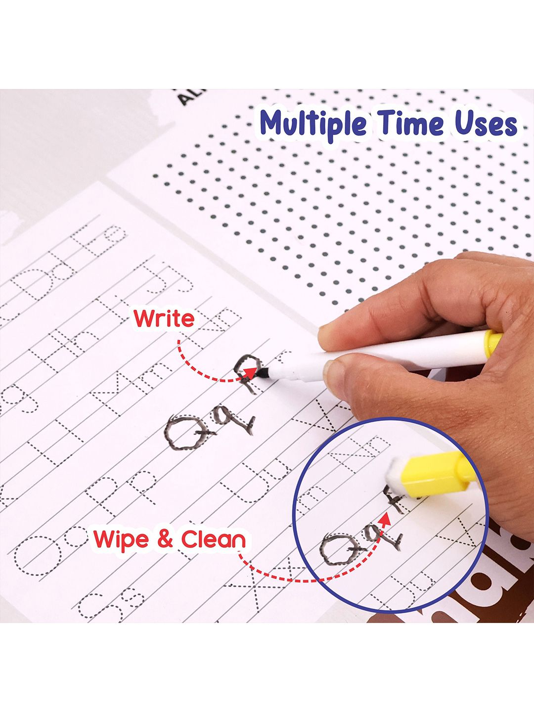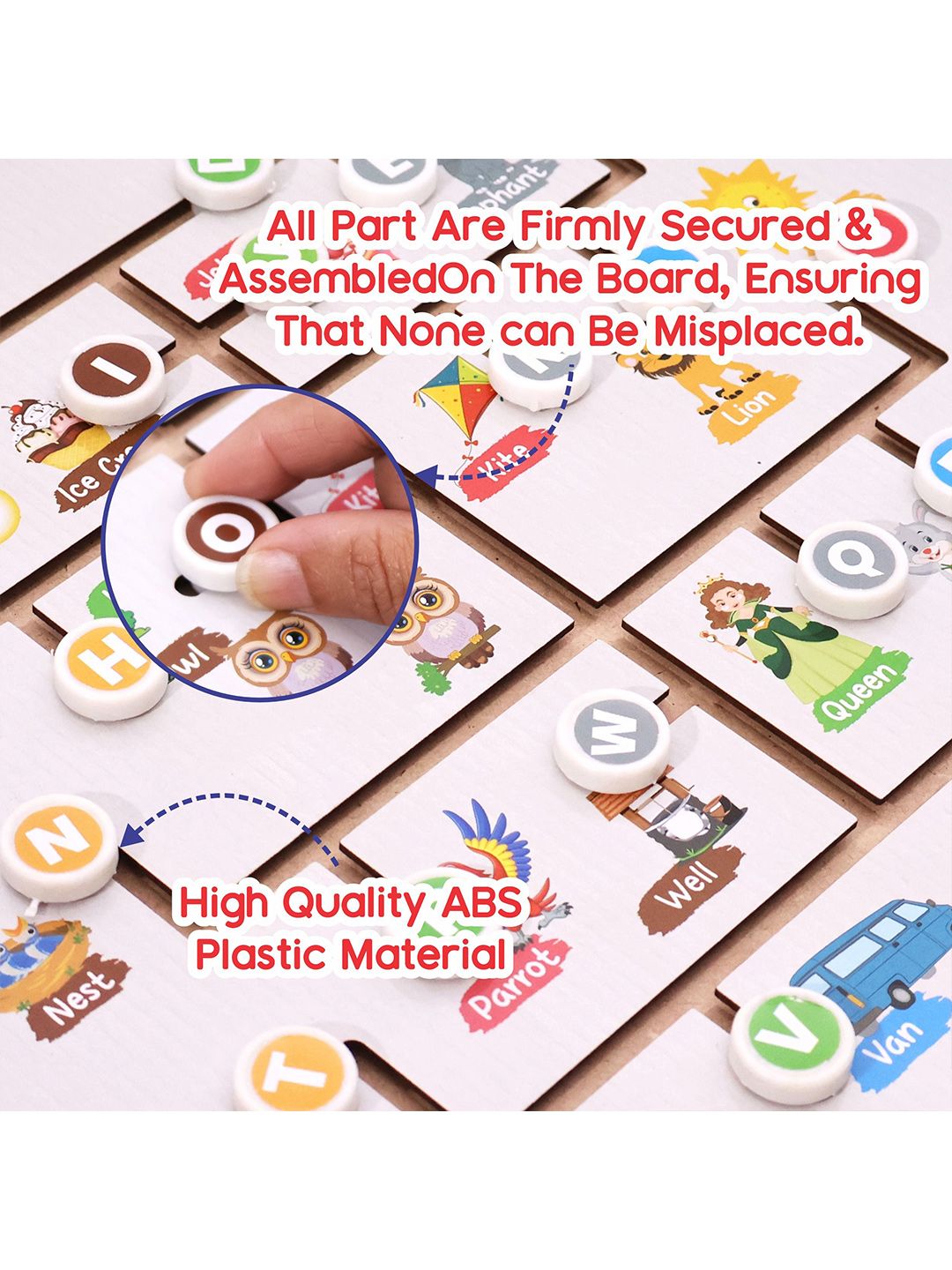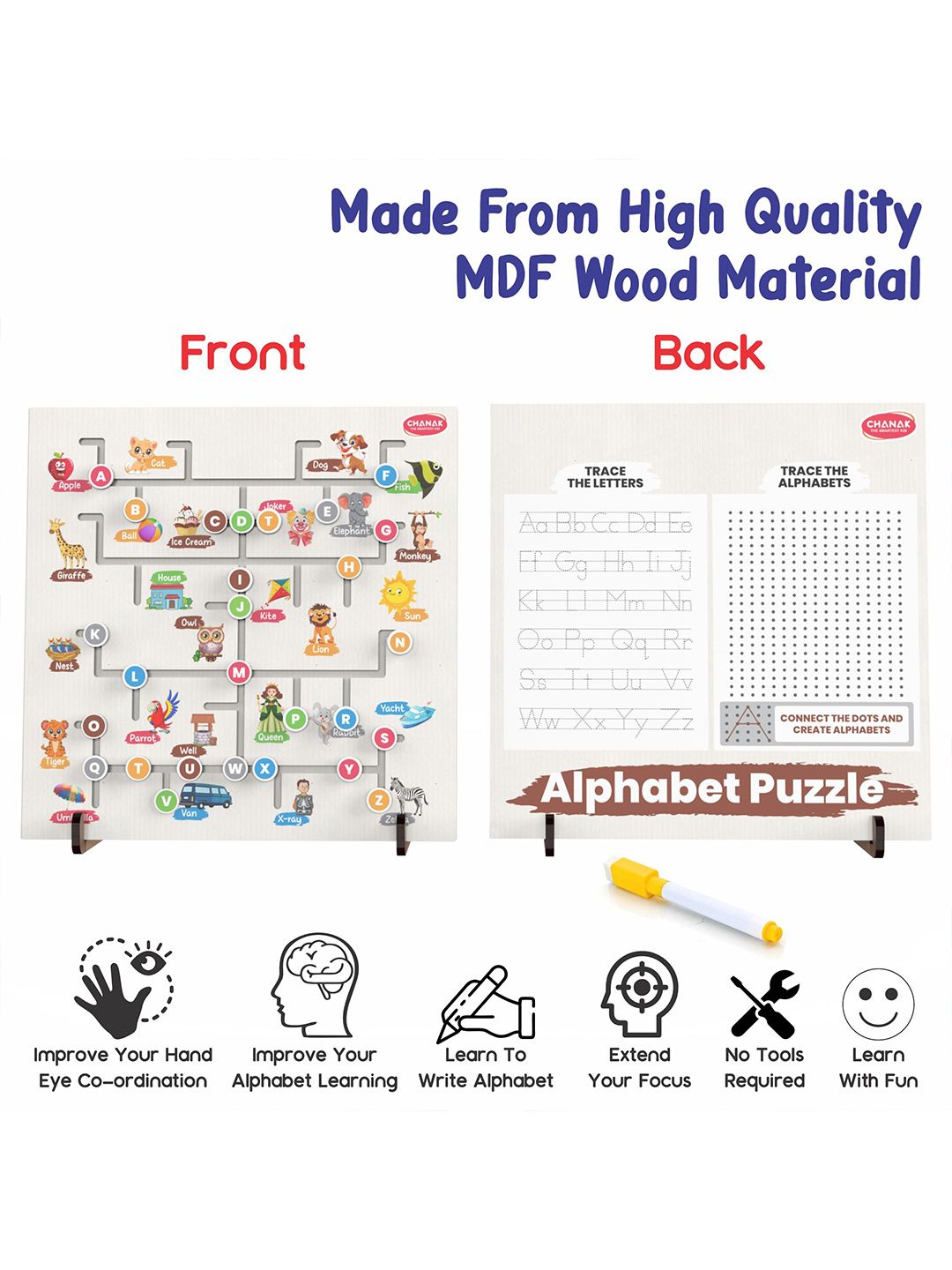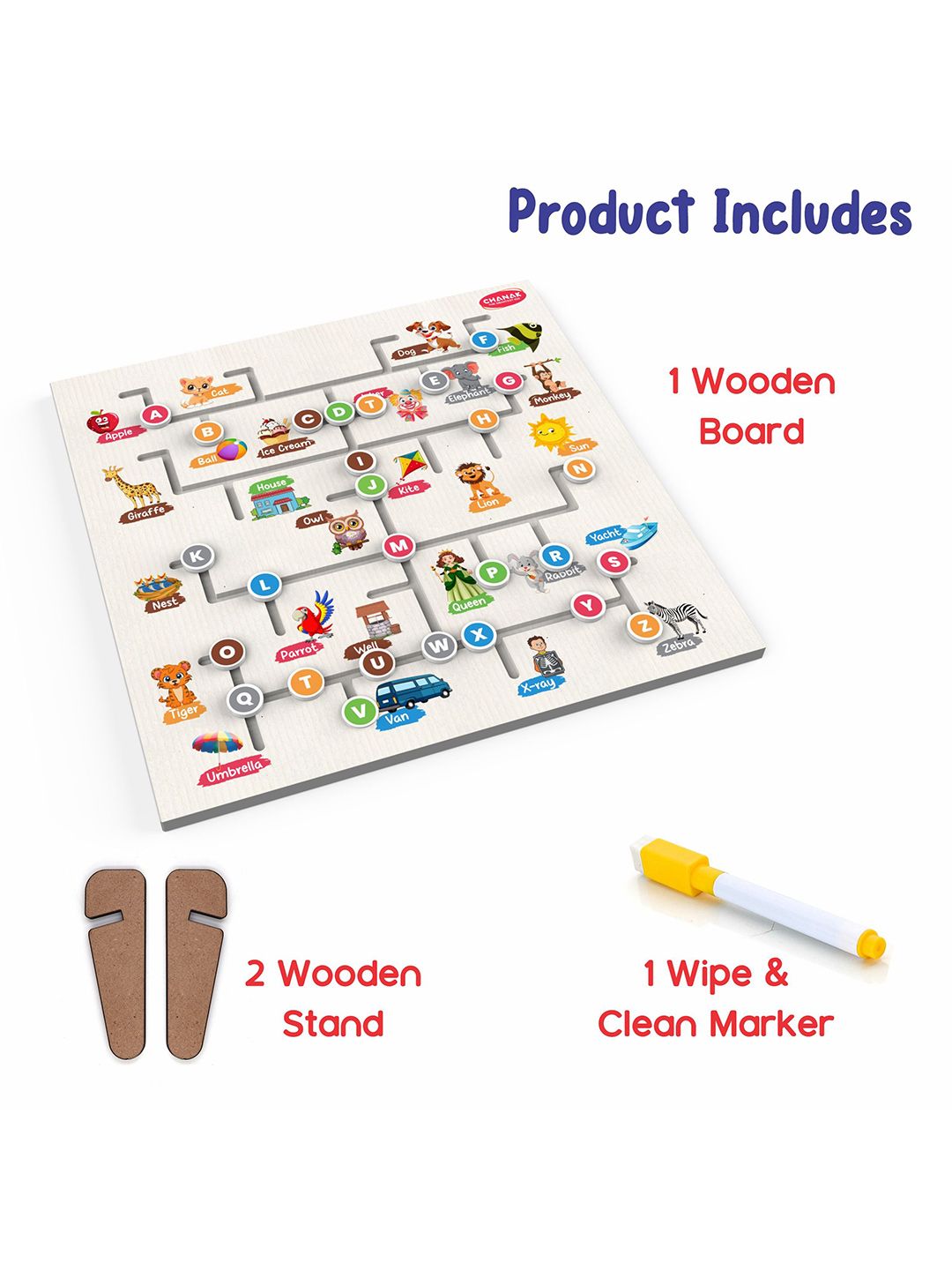 ALPHABET TRACING FOR HANDWRITING DEVELOPMENT The front side of the board includes a dedicated tracing area where children can practice writing both uppercase and lowercase letters. This activity aids in refining pencil grip, enhancing hand-eye coordination, and building early handwriting skills.
