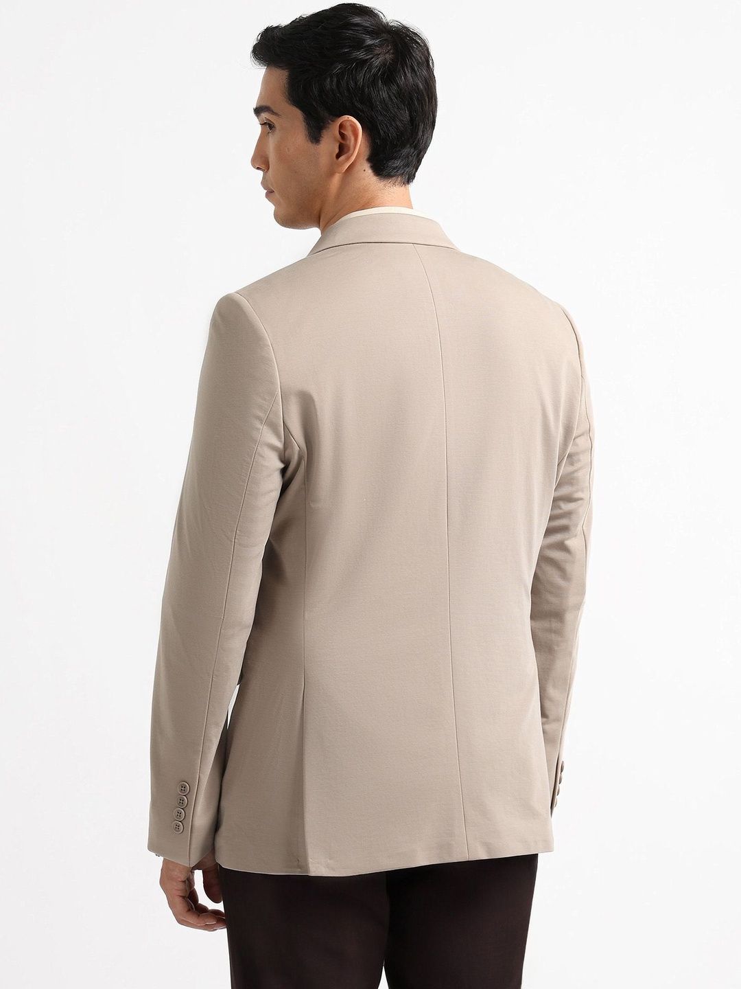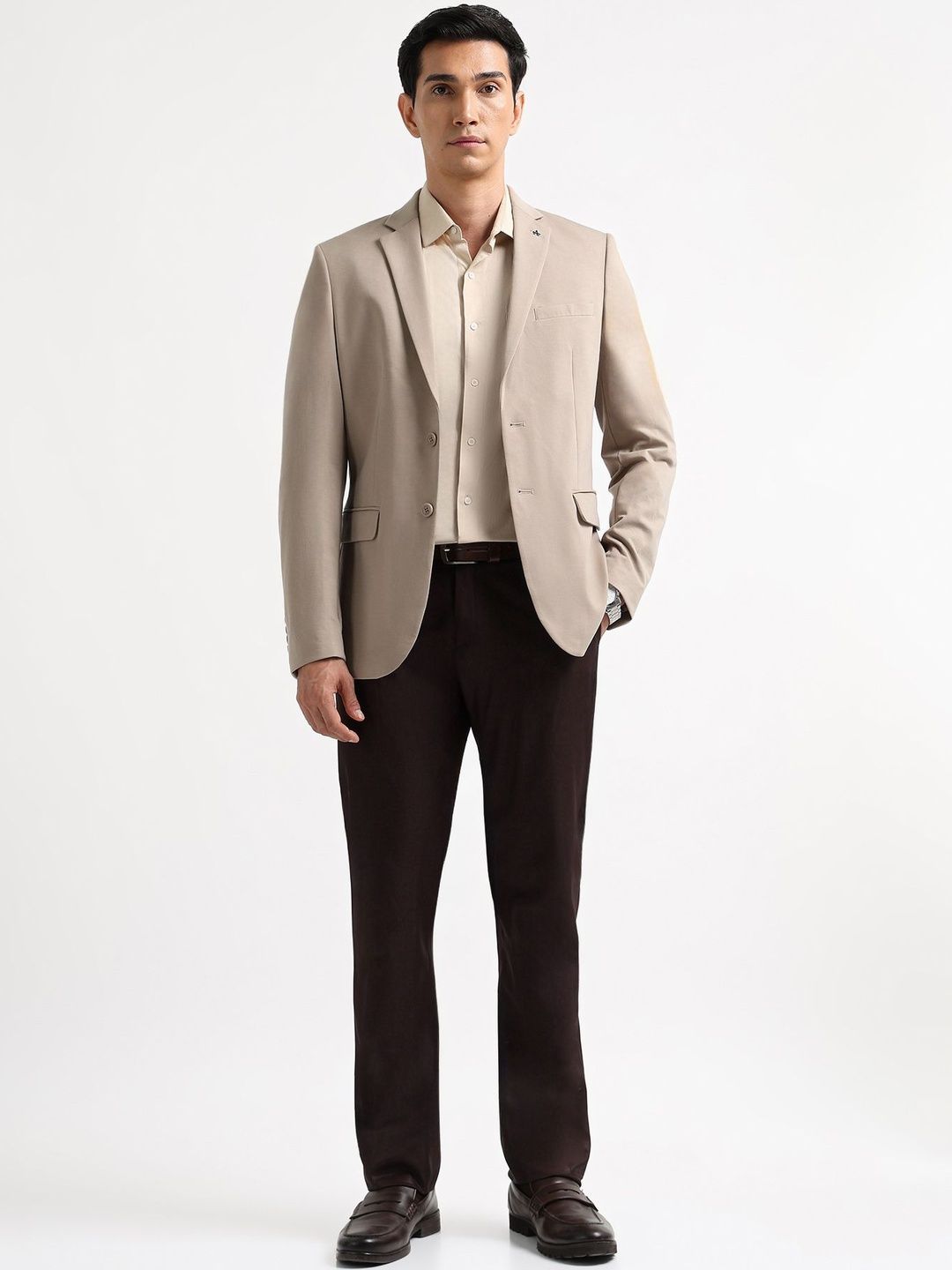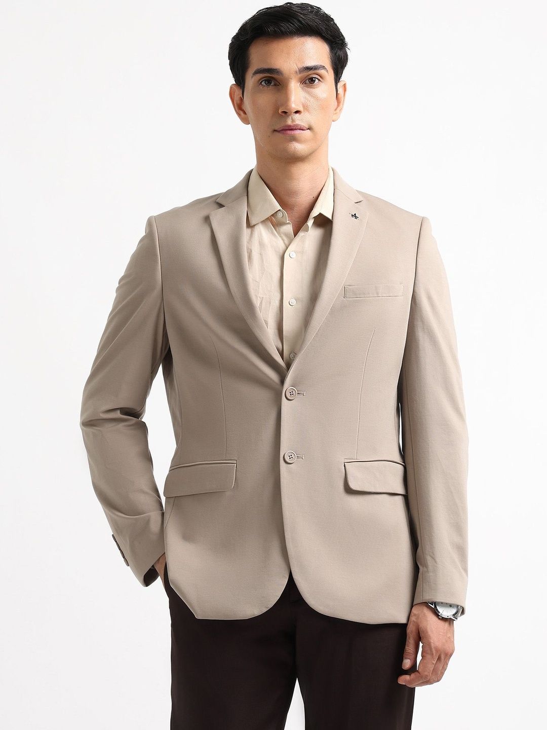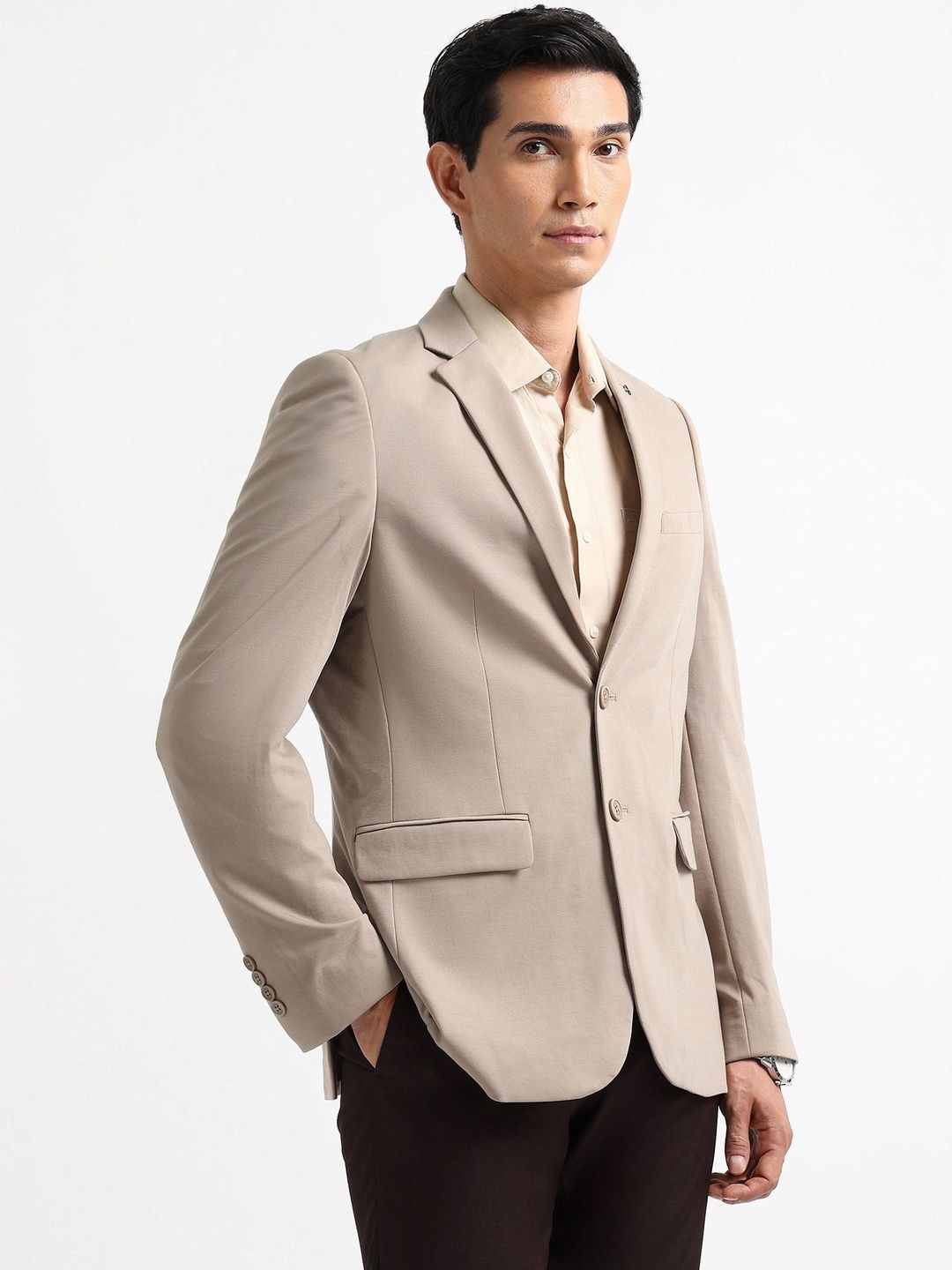 Brown solid slim-fit blazer, has a notched lapel, long sleeves, single-breasted with double button closure, two flap pockets, one welt pocket and a double-vented back hem