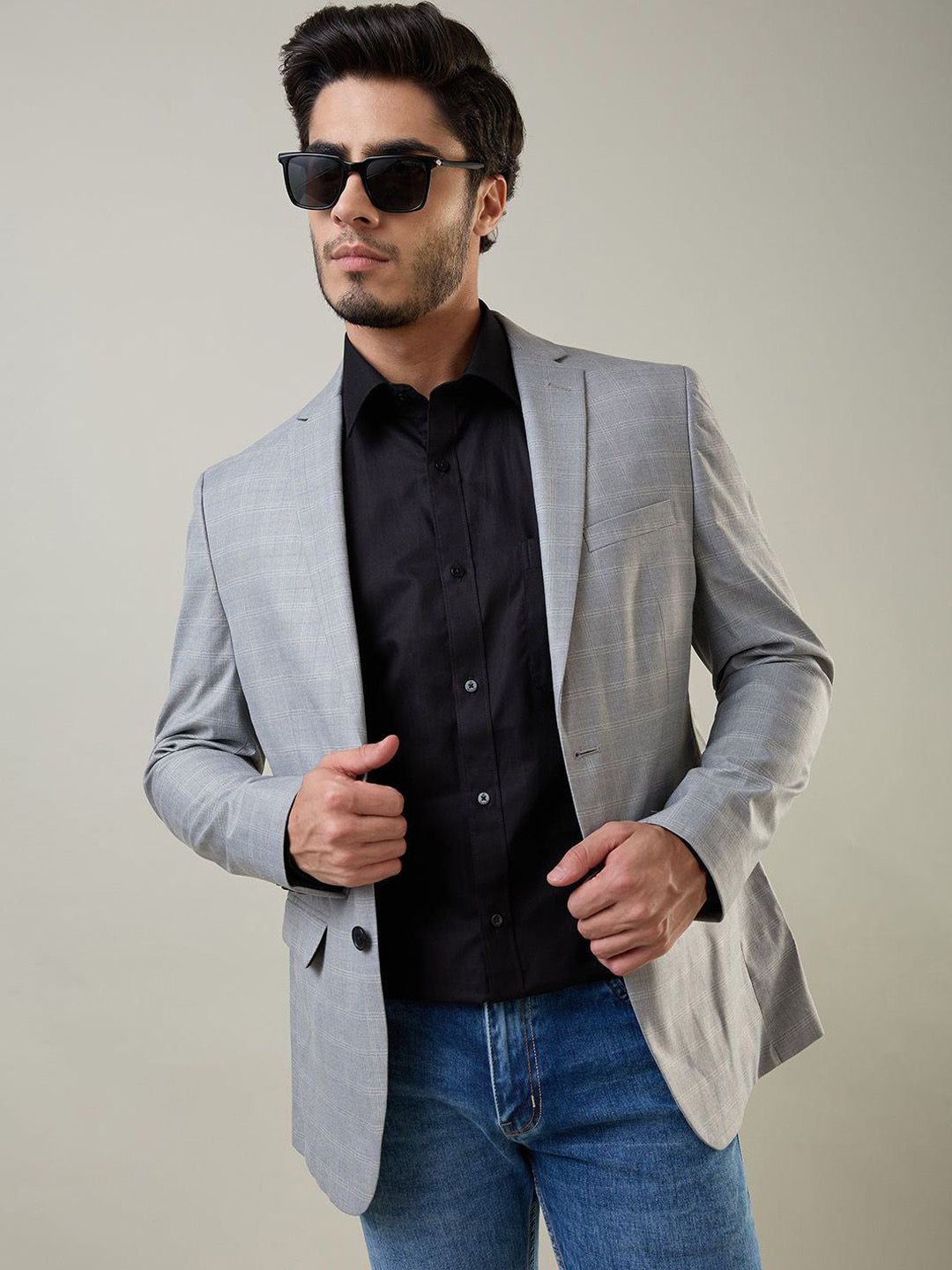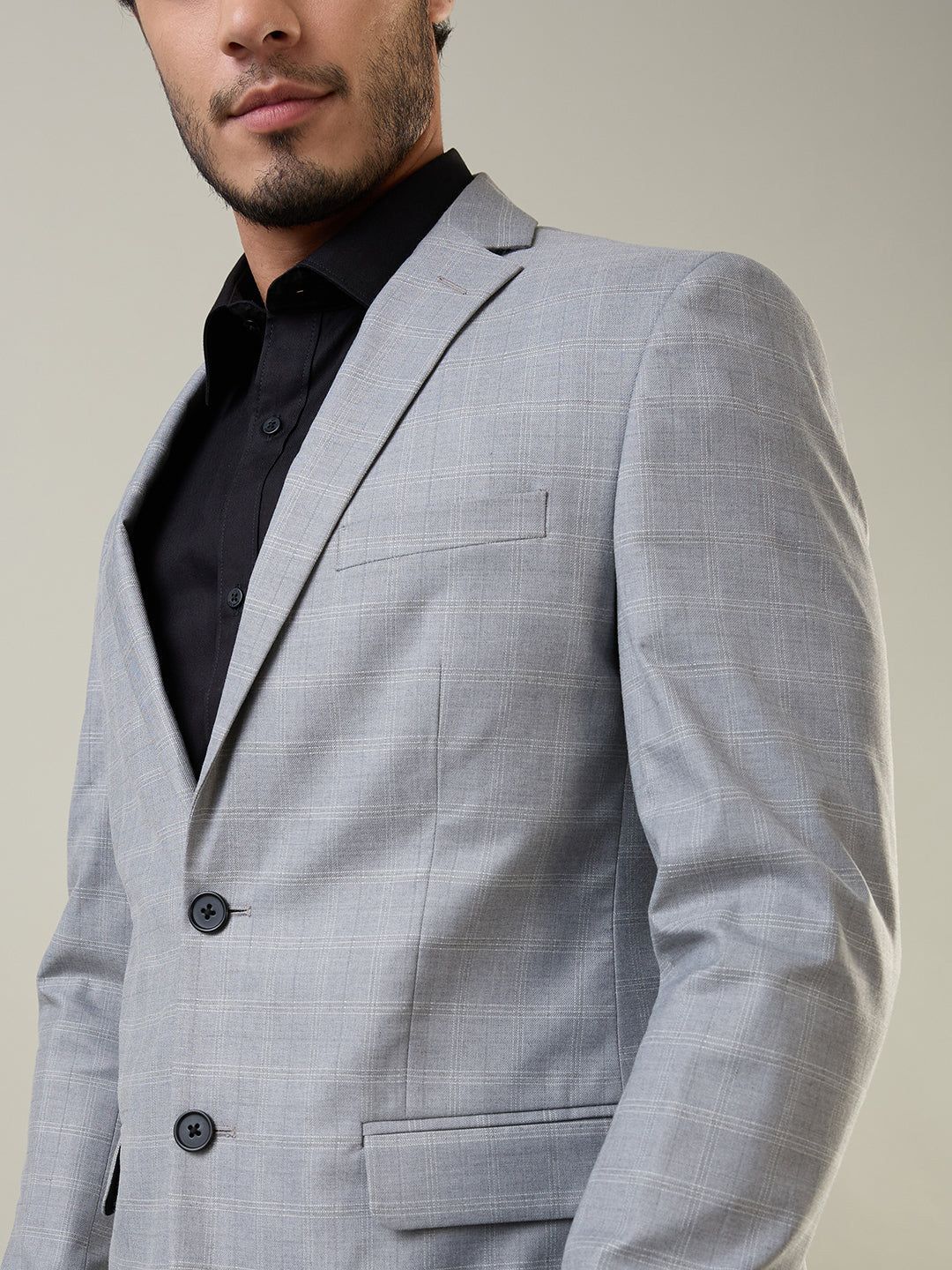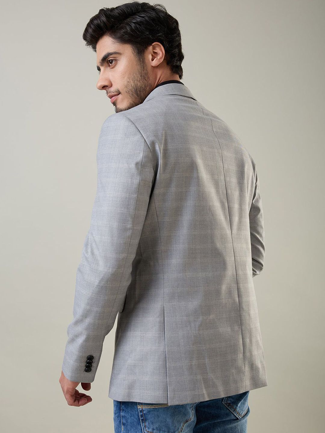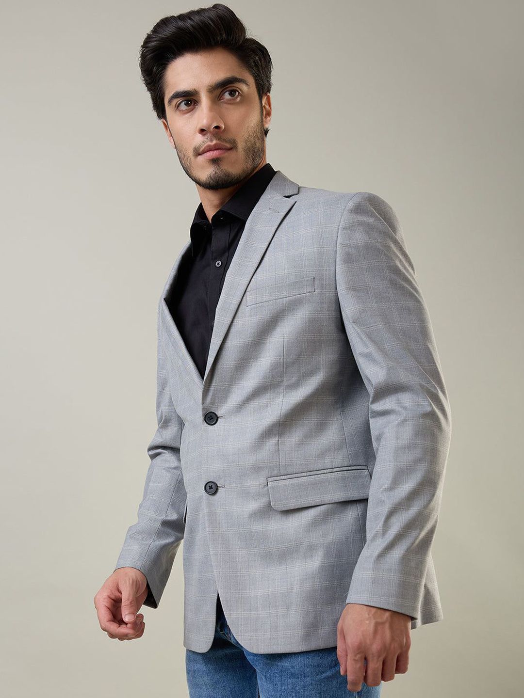 Grey solid slim-fit blazer, has a notched lapel, long sleeves, single-breasted with double button closure, two flap pockets, one welt pocket and a double-vented back hem