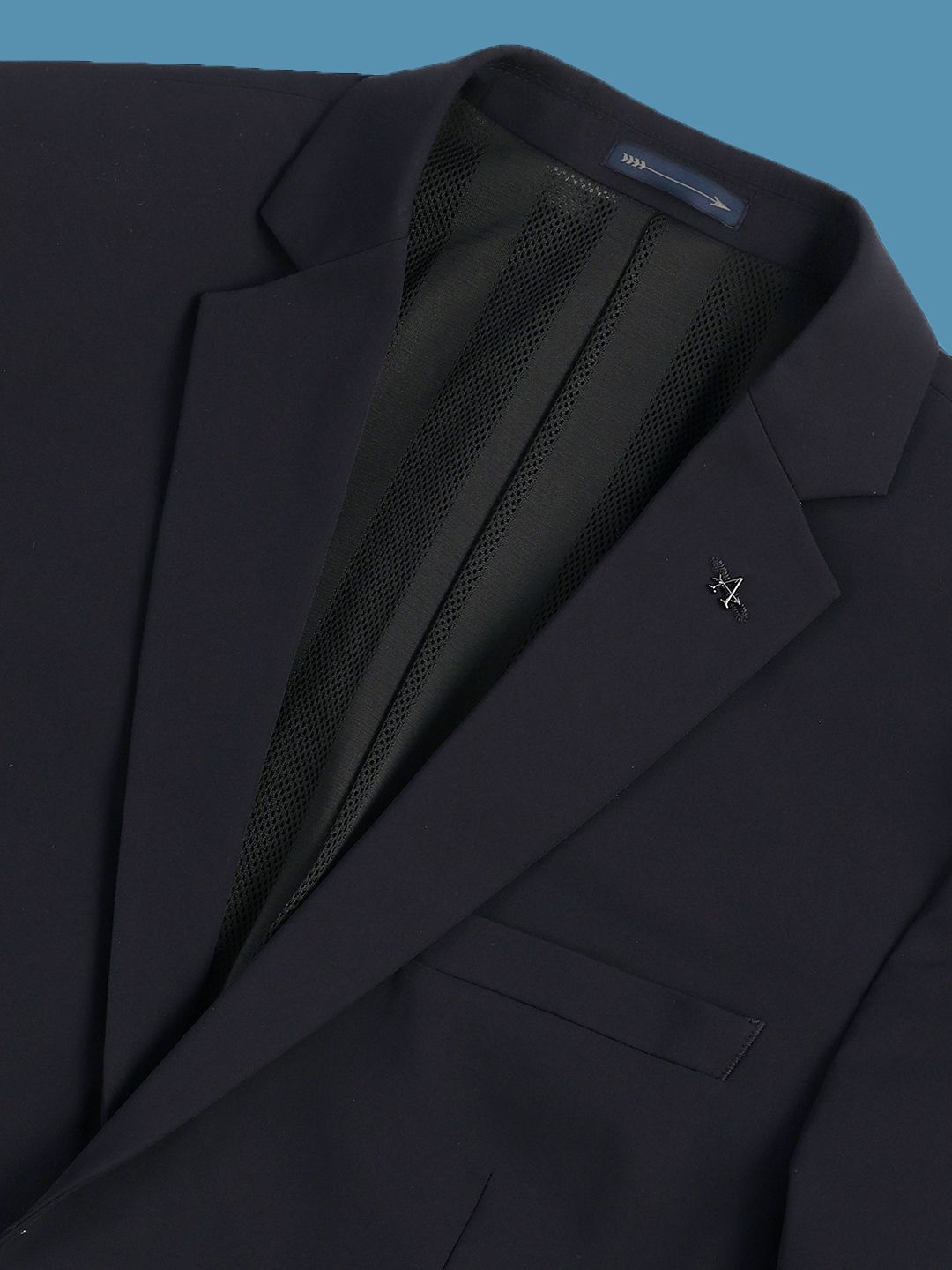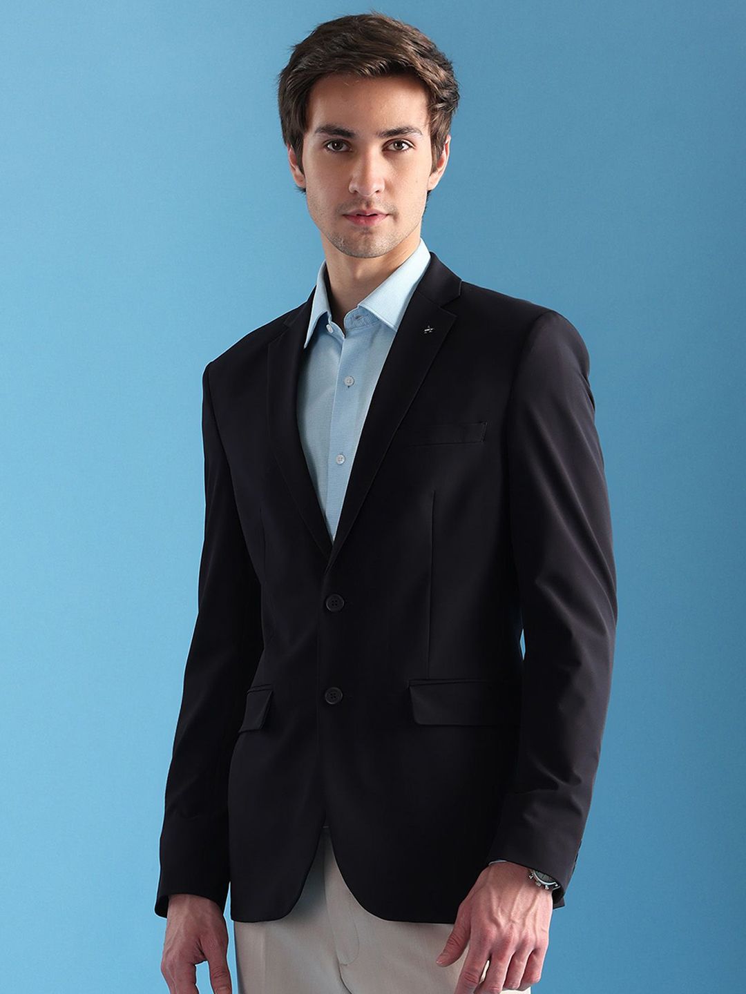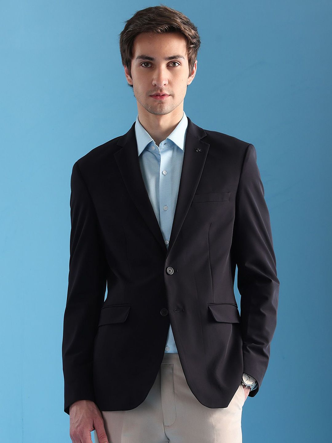 Navy blue solid slim-fit blazer, has a notched lapel, long sleeves, single-breasted with double button closure, two flap pockets, one welt pocket and a double-vented back hem
