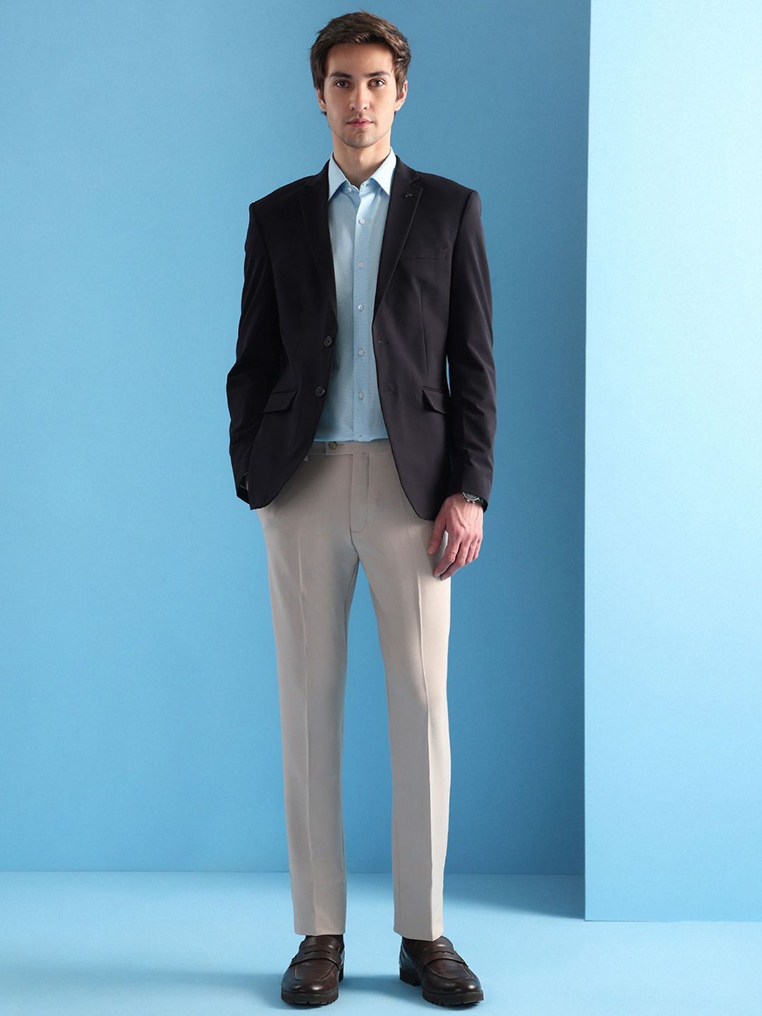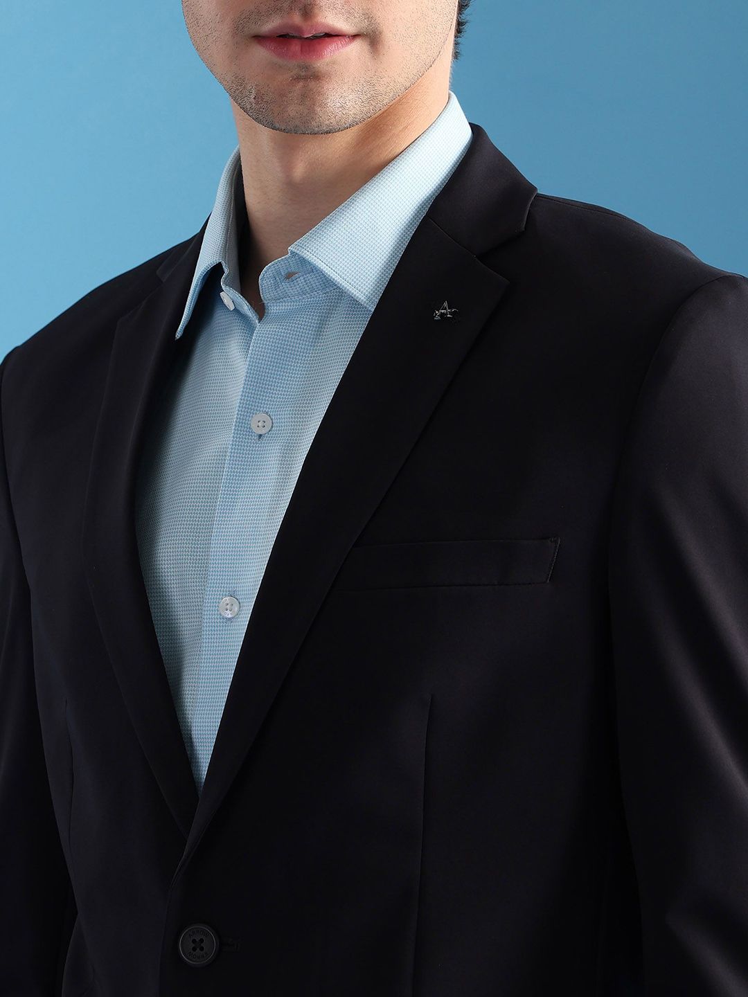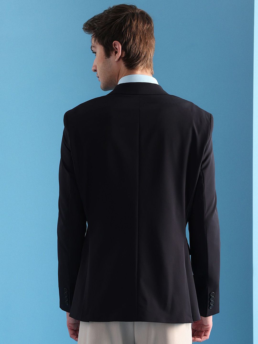 Navy blue solid slim-fit blazer, has a notched lapel, long sleeves, single-breasted with double button closure, two flap pockets, one welt pocket and a double-vented back hem