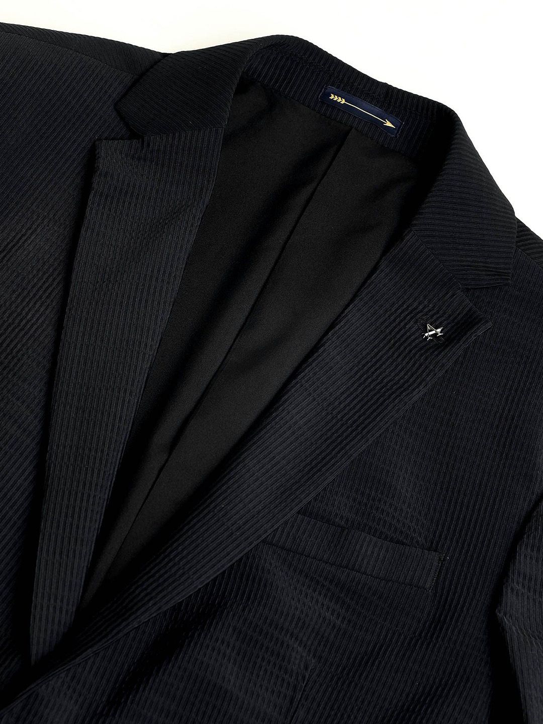 Black self designed slim-fit smart-casual blazer, has a notched lapel, long sleeves, single-breasted with double button closure, two flap pockets