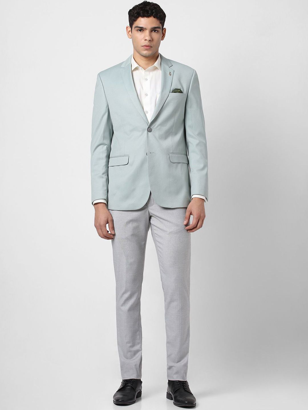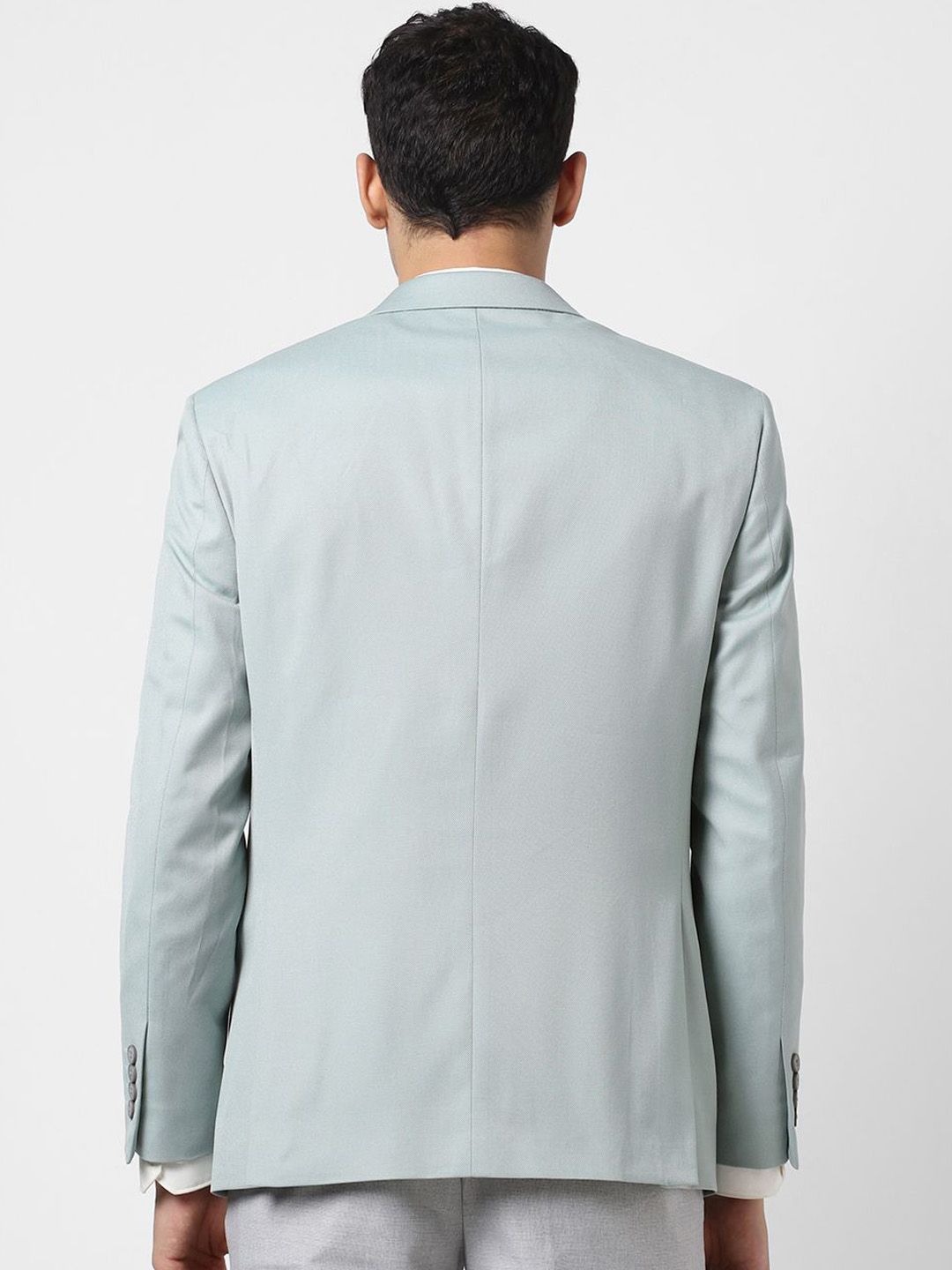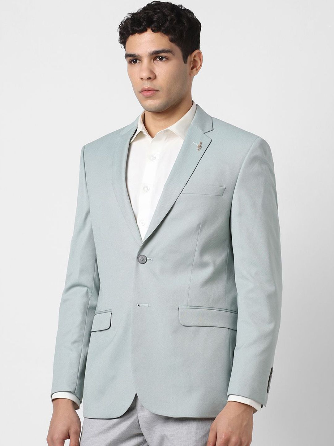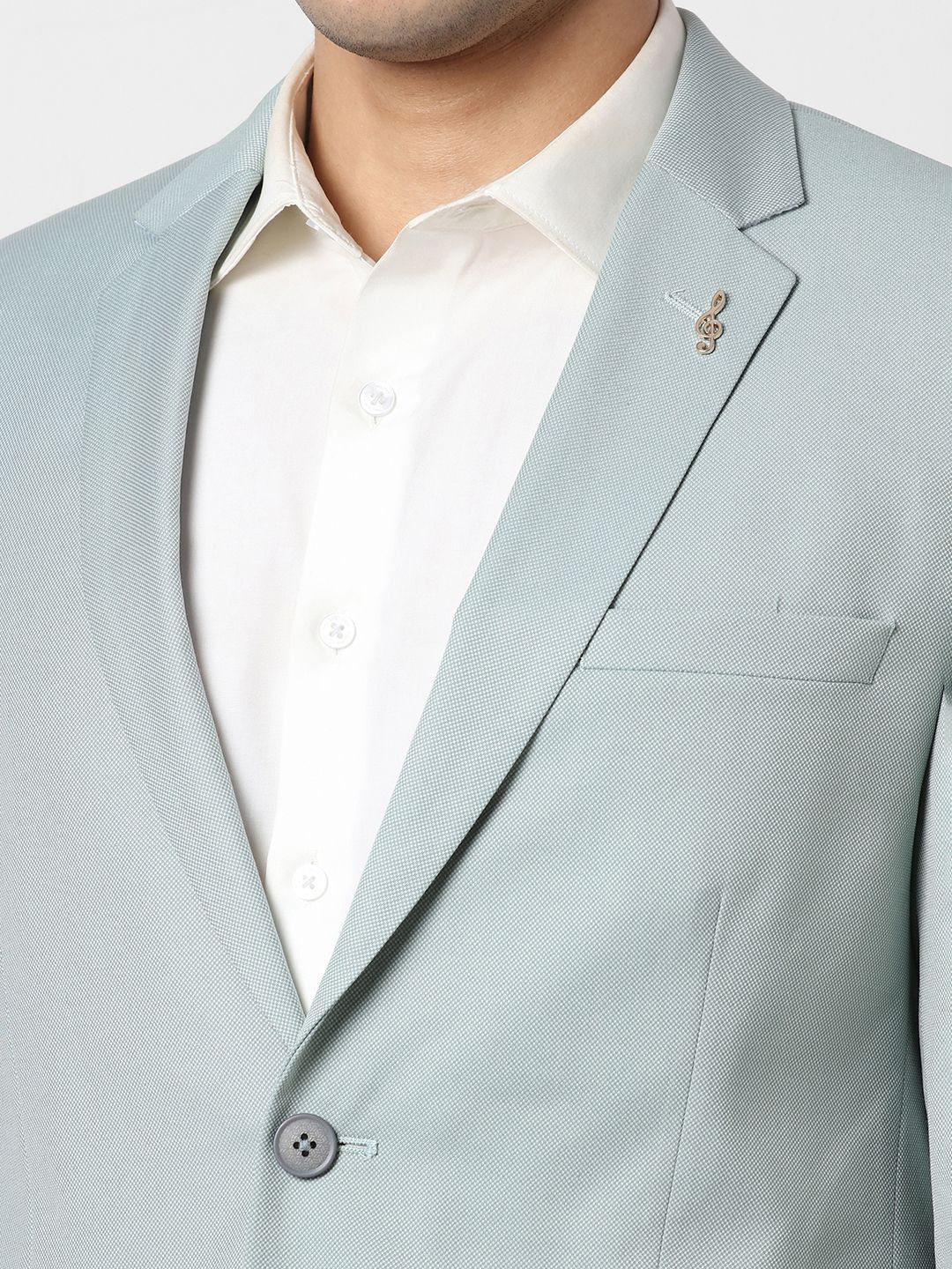 Blue self designed slim-fit formal blazer, has a notched lapel, long sleeves, single-breasted with double button closure, two flap pockets, one welt pocket and a double-vented back hem