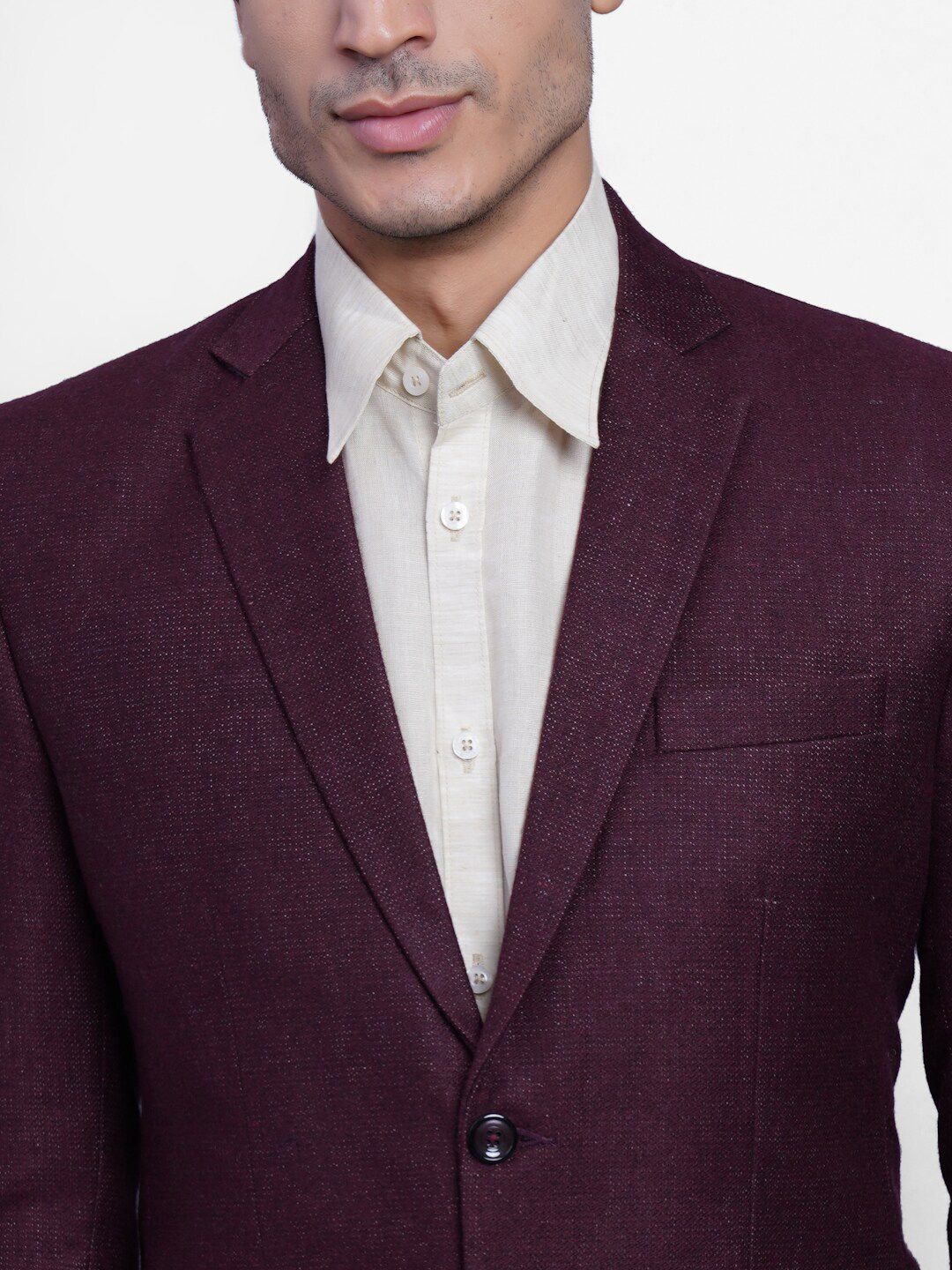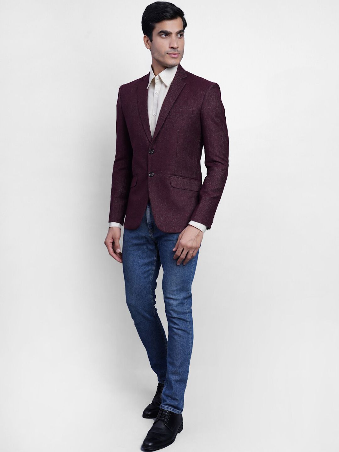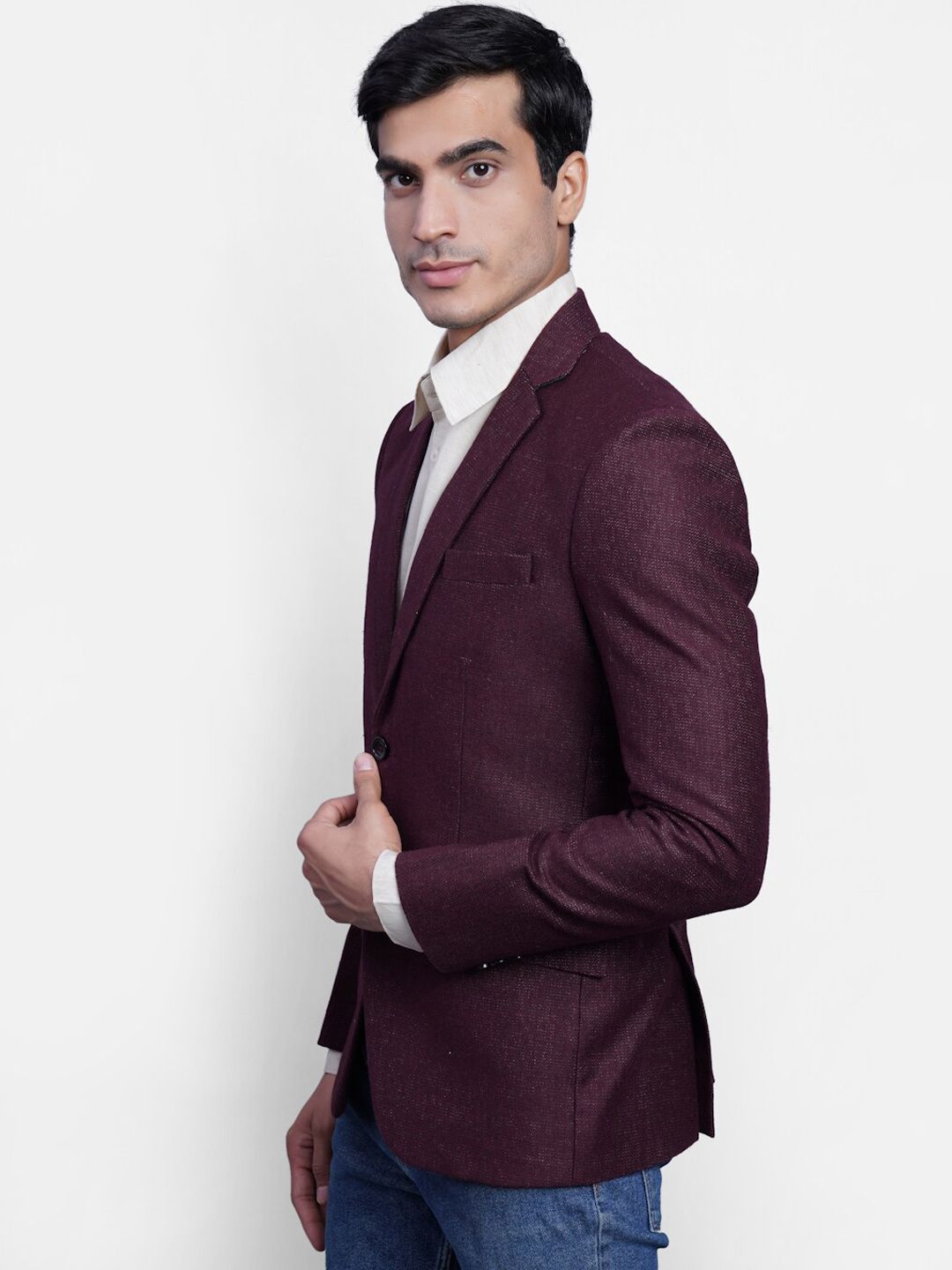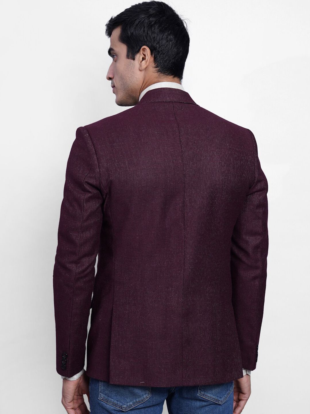 Maroon solid regular-fit formal blazer, has a notched lapel, long sleeves, single-breasted with double button closure, three welt pocket and a double-vented back hem