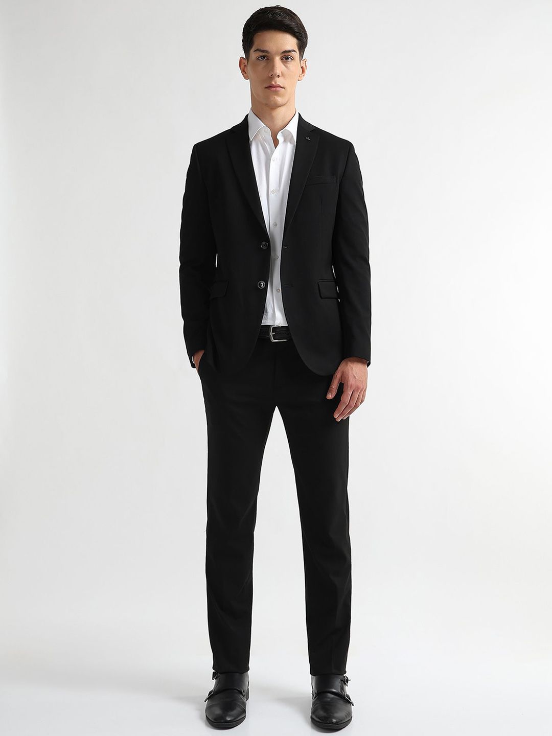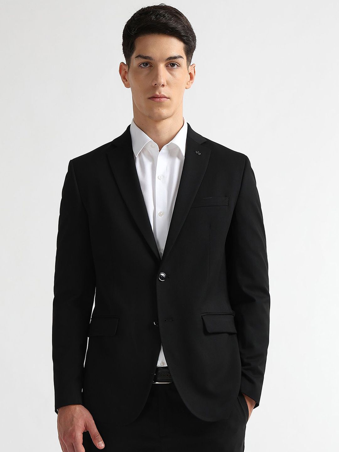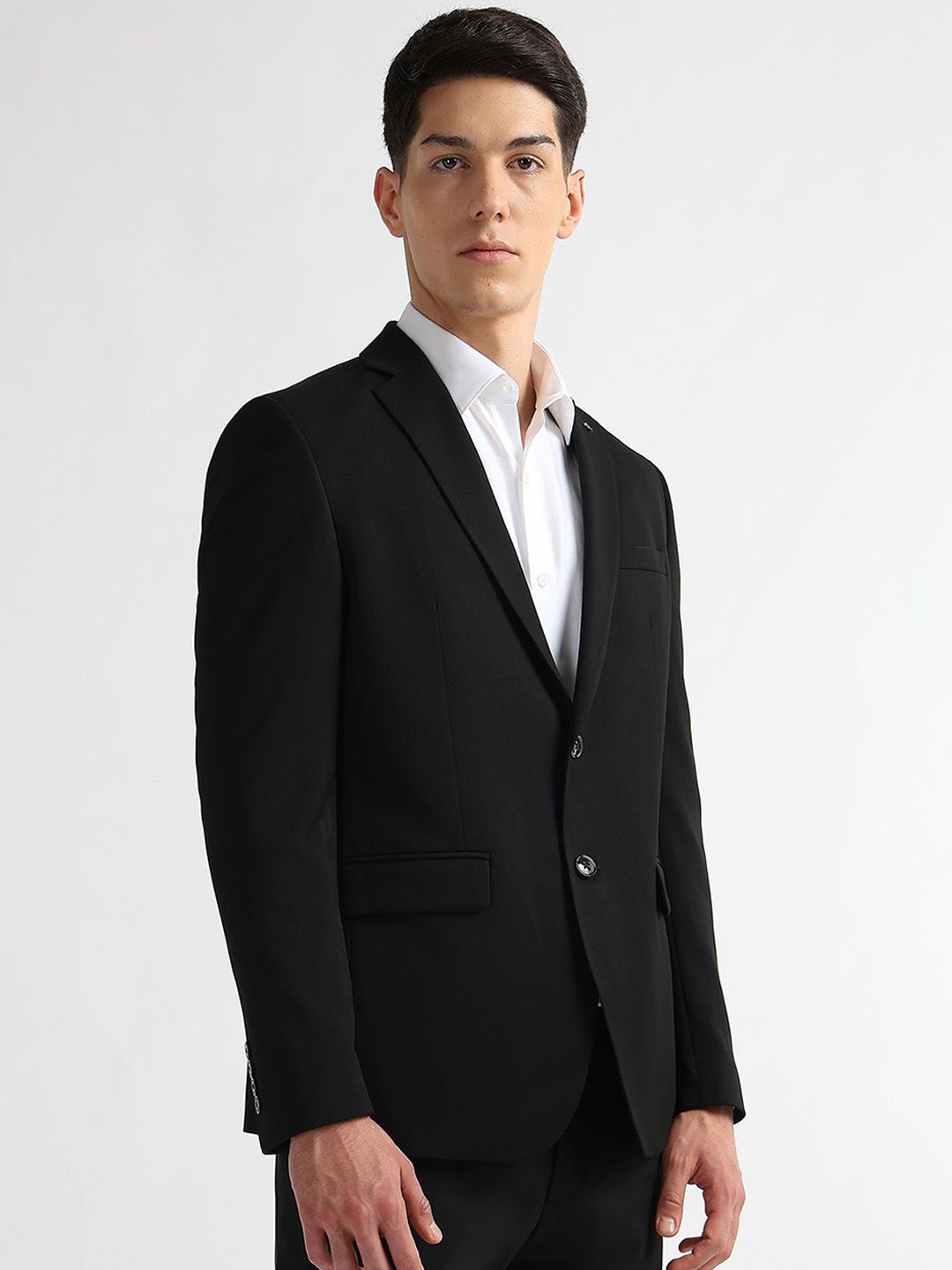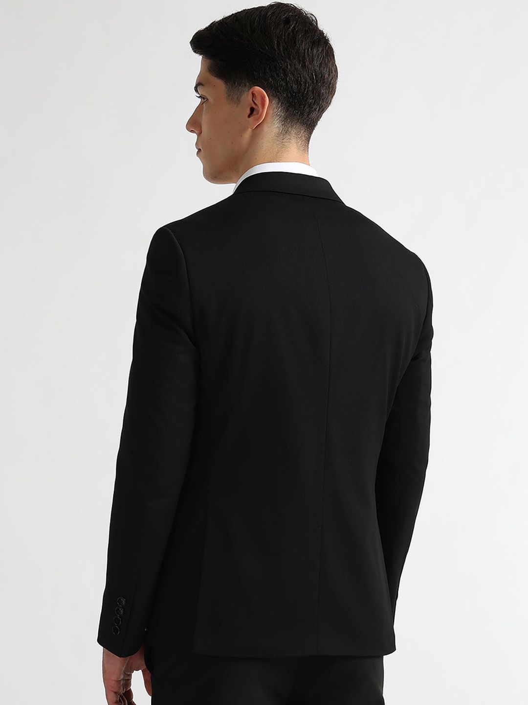 Black solid trailered fit single-breasted blazer, has a notched lapel collar, long sleeves, double vent, button closure with curved hem & three pockets