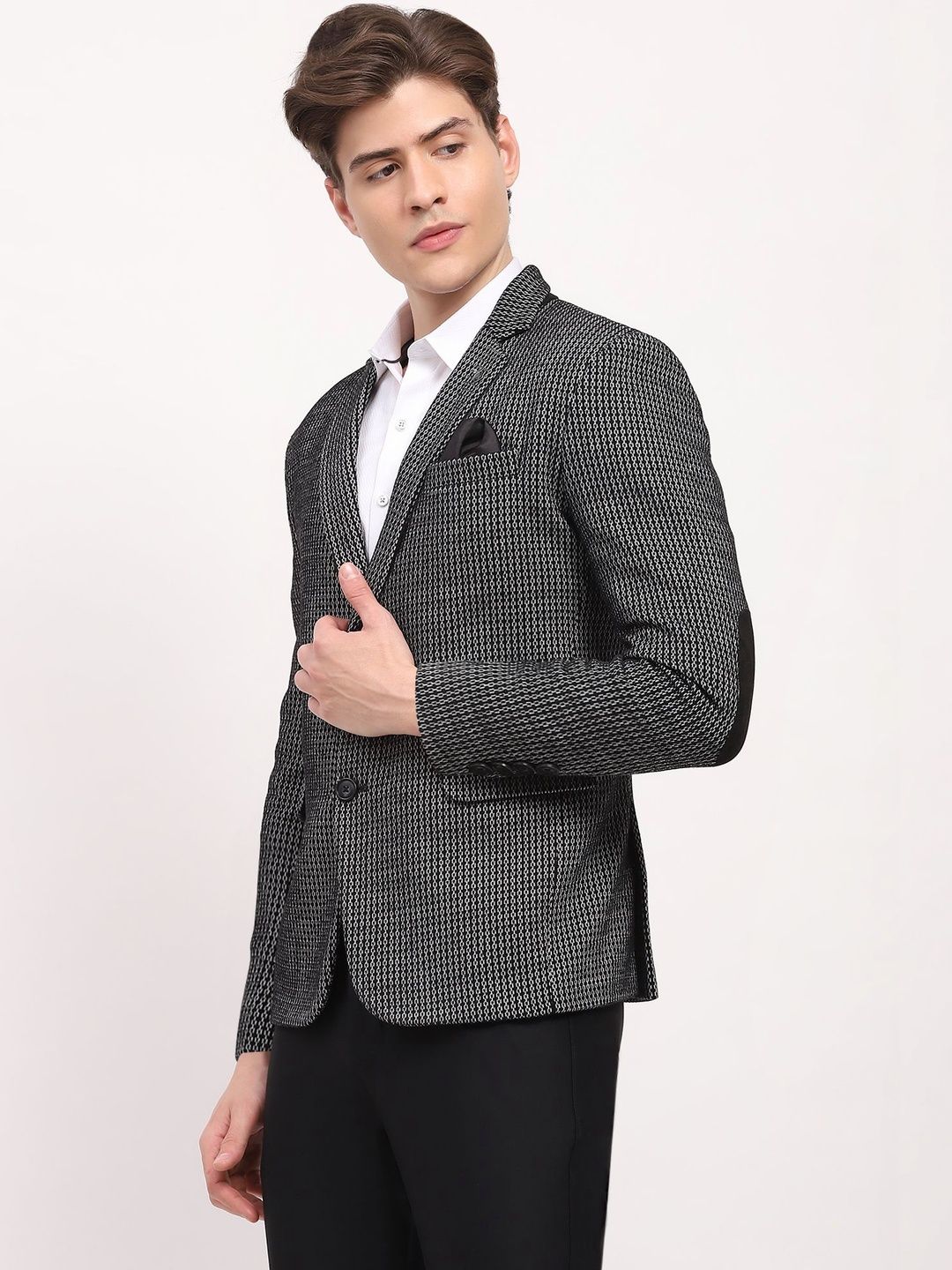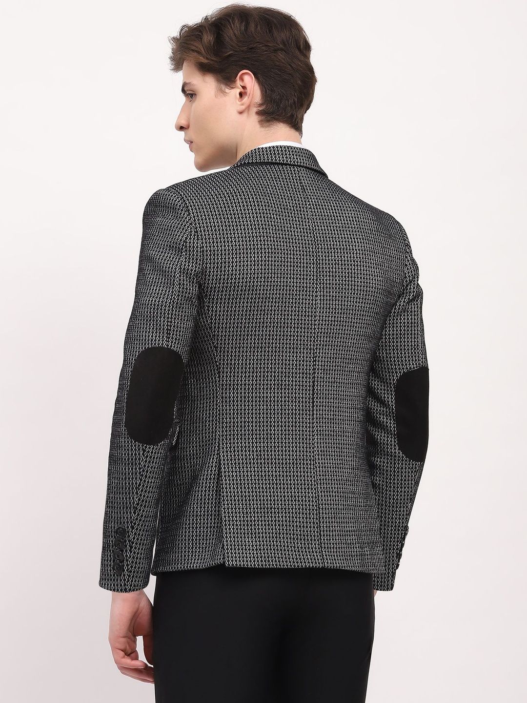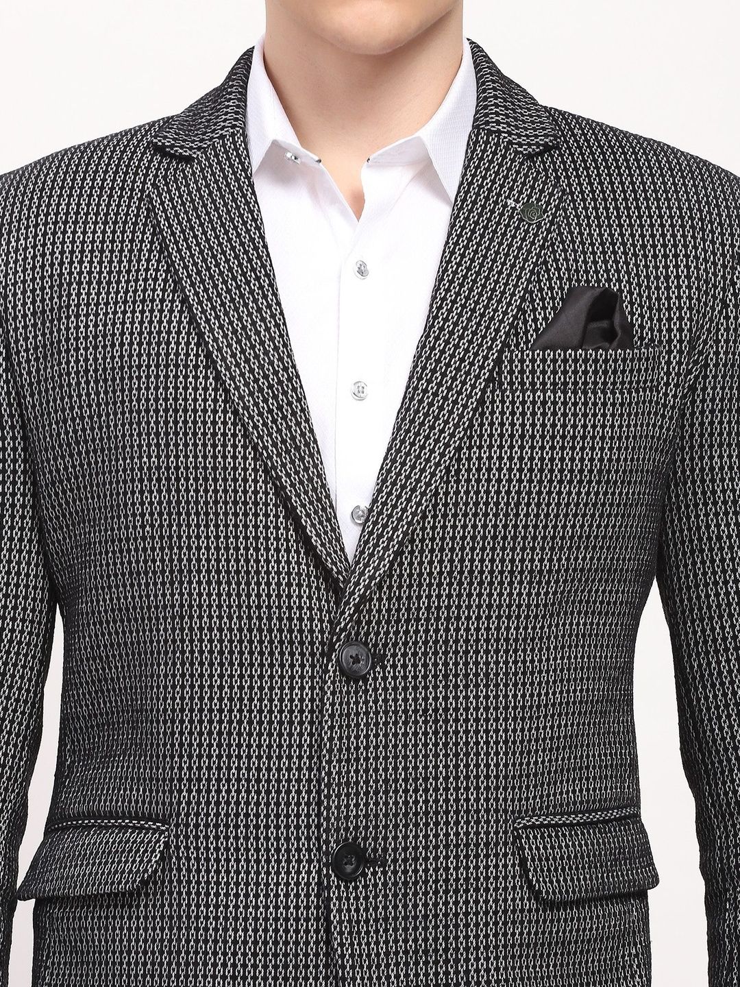 Black self design slim-fit smart-casual blazer, has a notched lapel, long sleeves, single-breasted with double button closure, two flap pockets, one welt pocket and a double-vented back hem