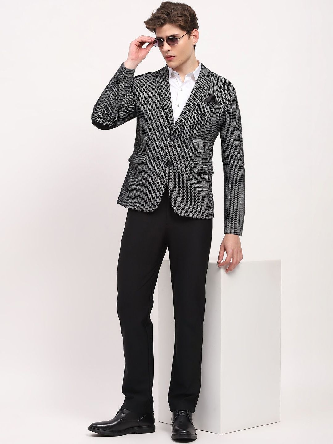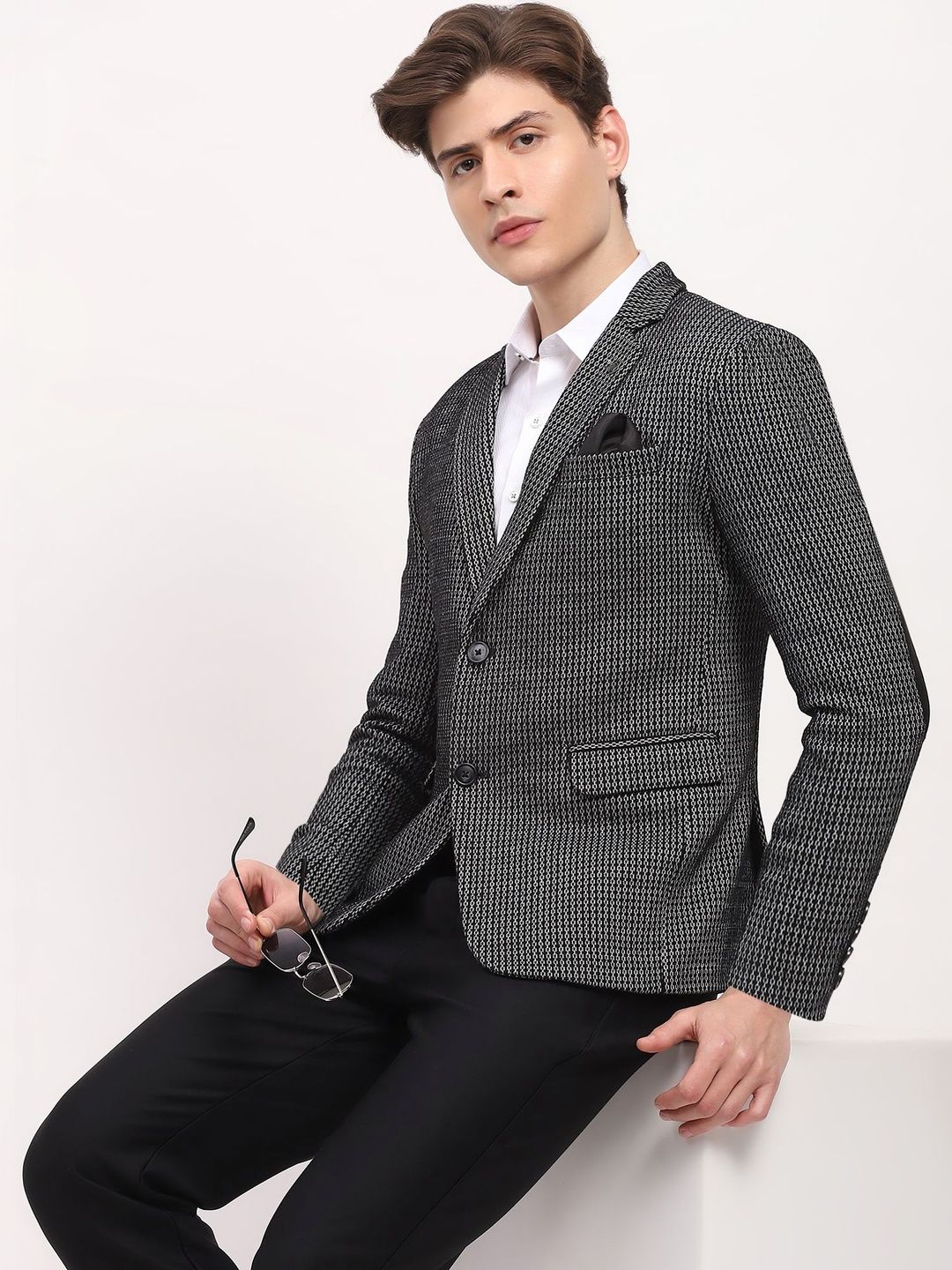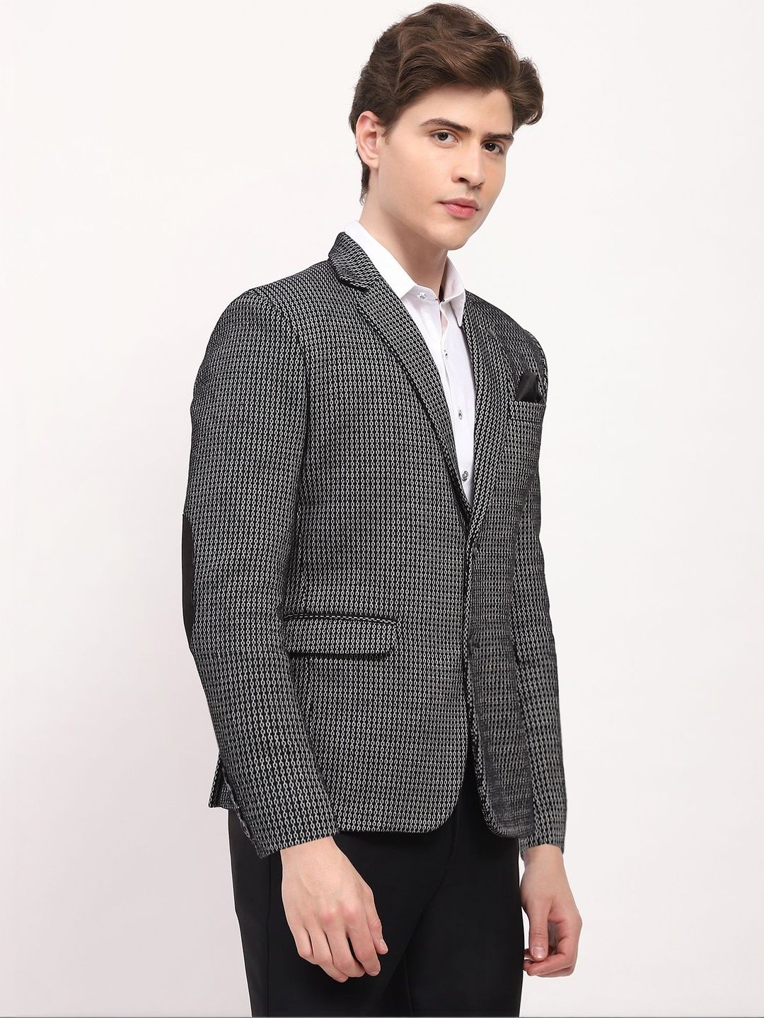 Black self design slim-fit smart-casual blazer, has a notched lapel, long sleeves, single-breasted with double button closure, two flap pockets, one welt pocket and a double-vented back hem
