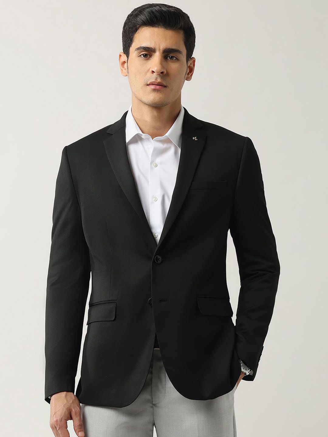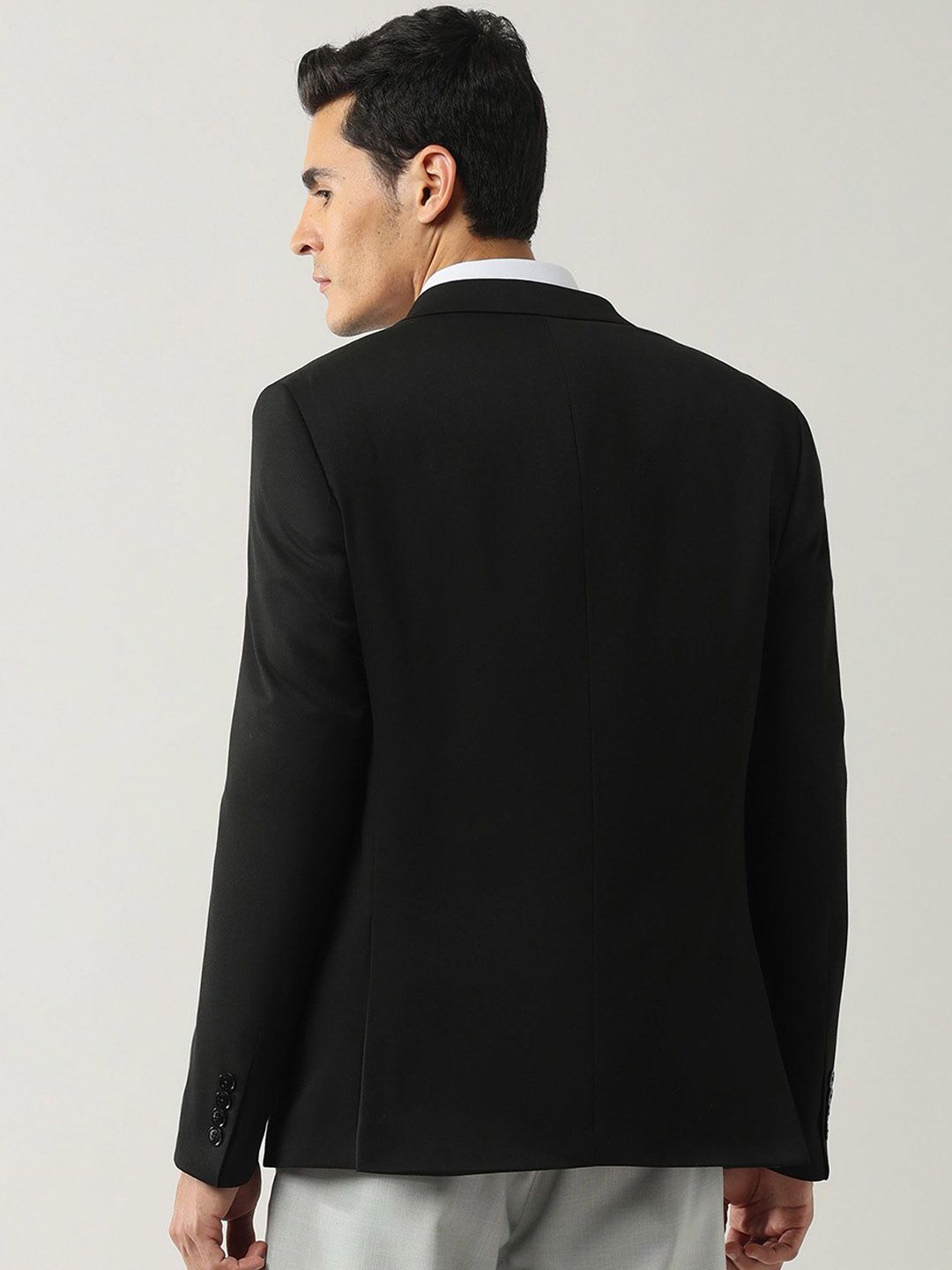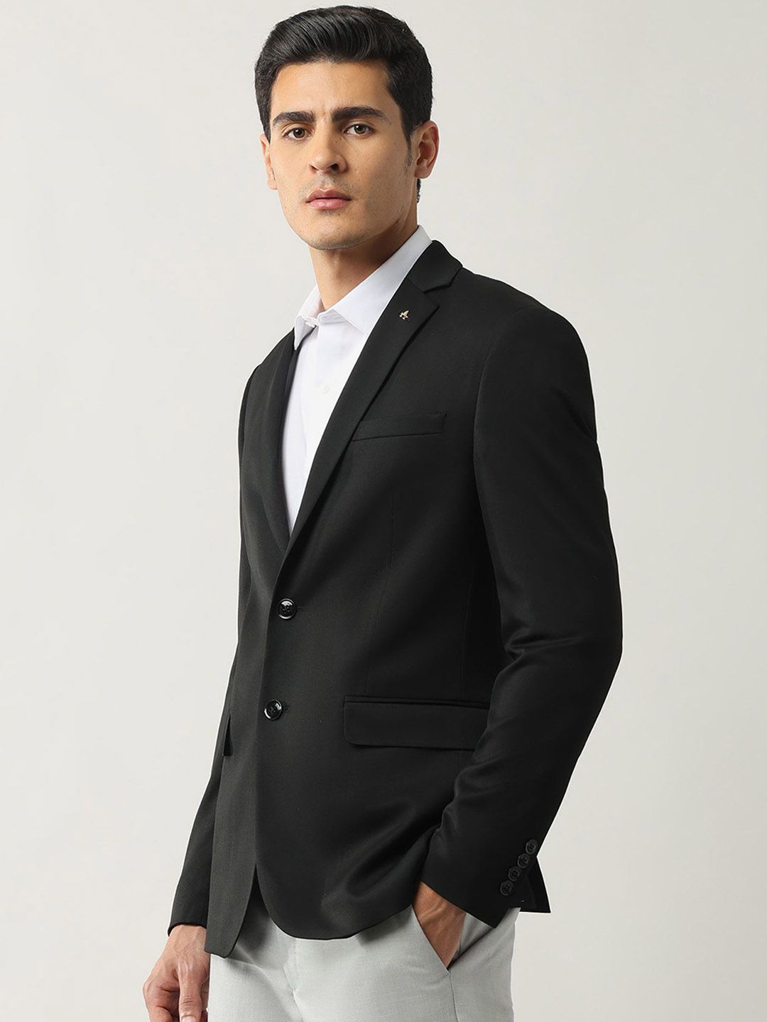 Black solid tailored fit blazer, has a notched lapel, long sleeves, single-breasted with double button closure, two flap pockets, one welt pocket and a double-vented back hem