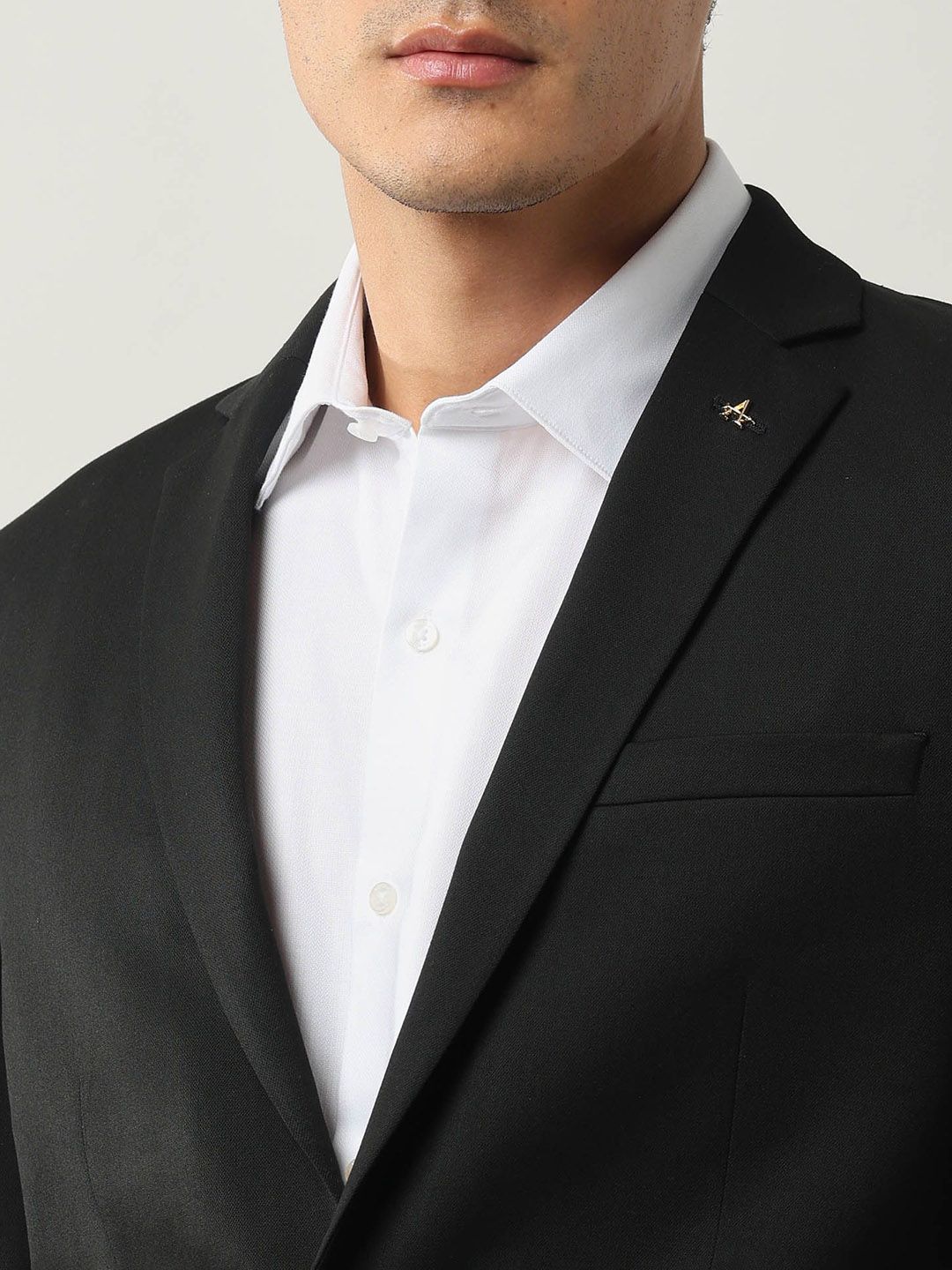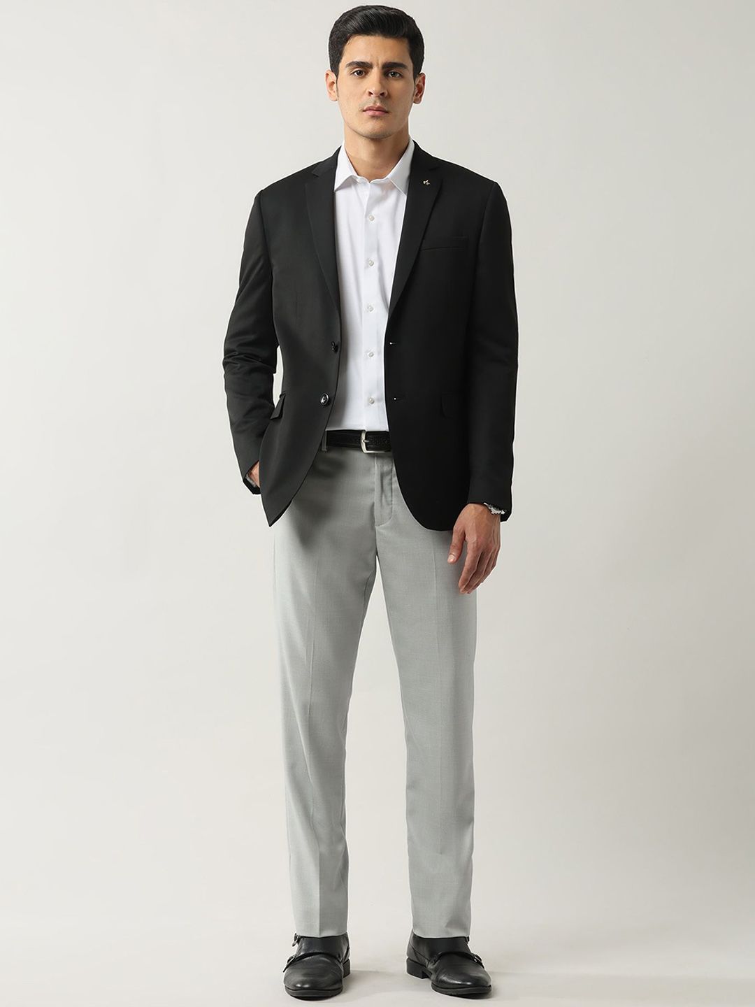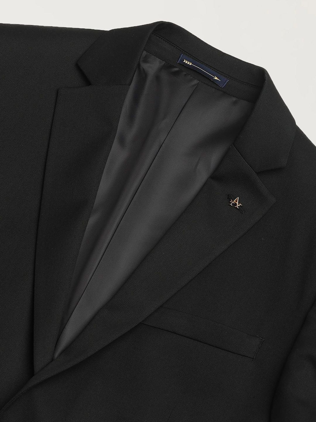 Black solid tailored fit blazer, has a notched lapel, long sleeves, single-breasted with double button closure, two flap pockets, one welt pocket and a double-vented back hem