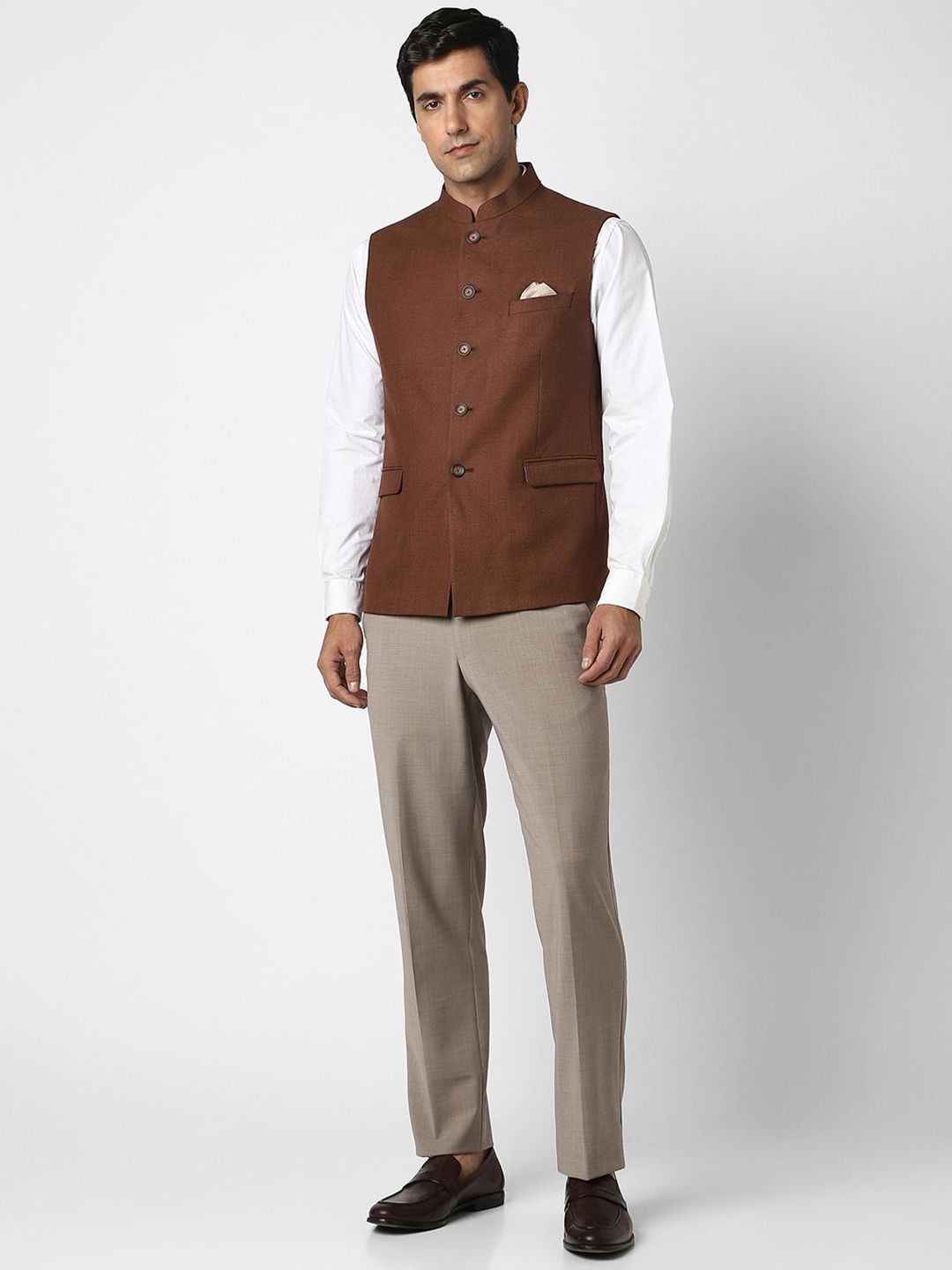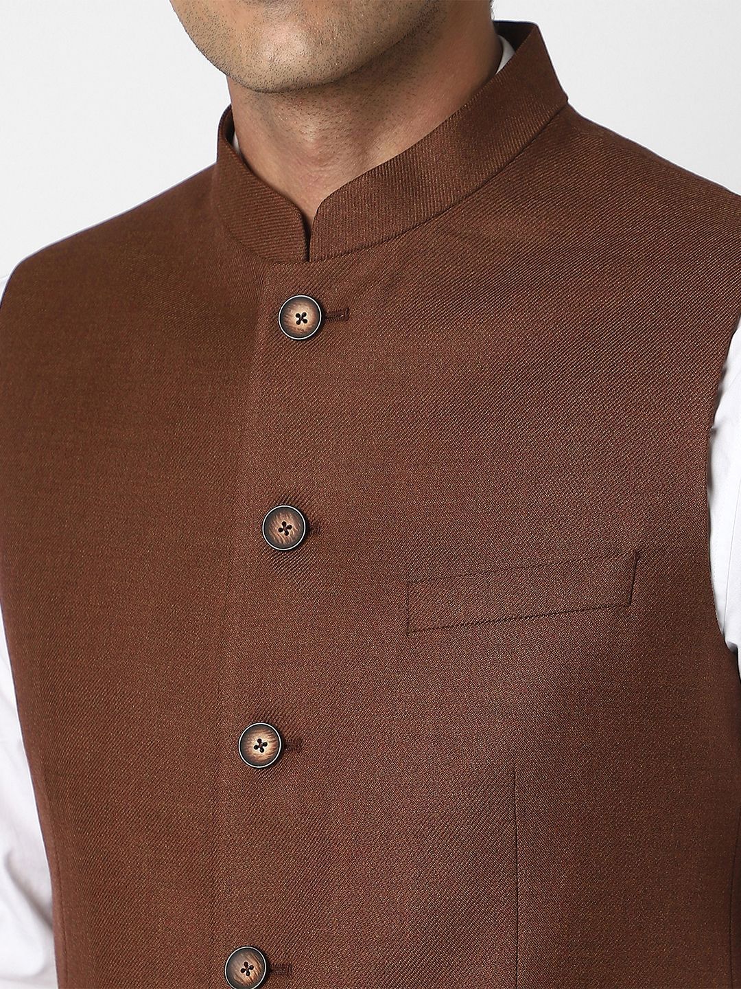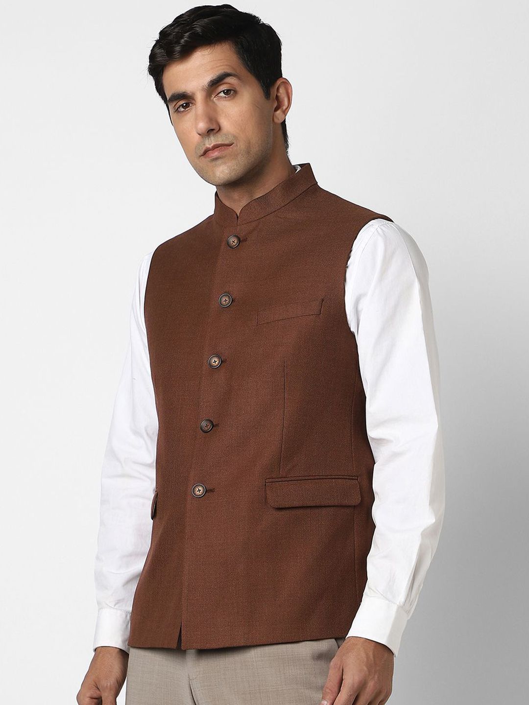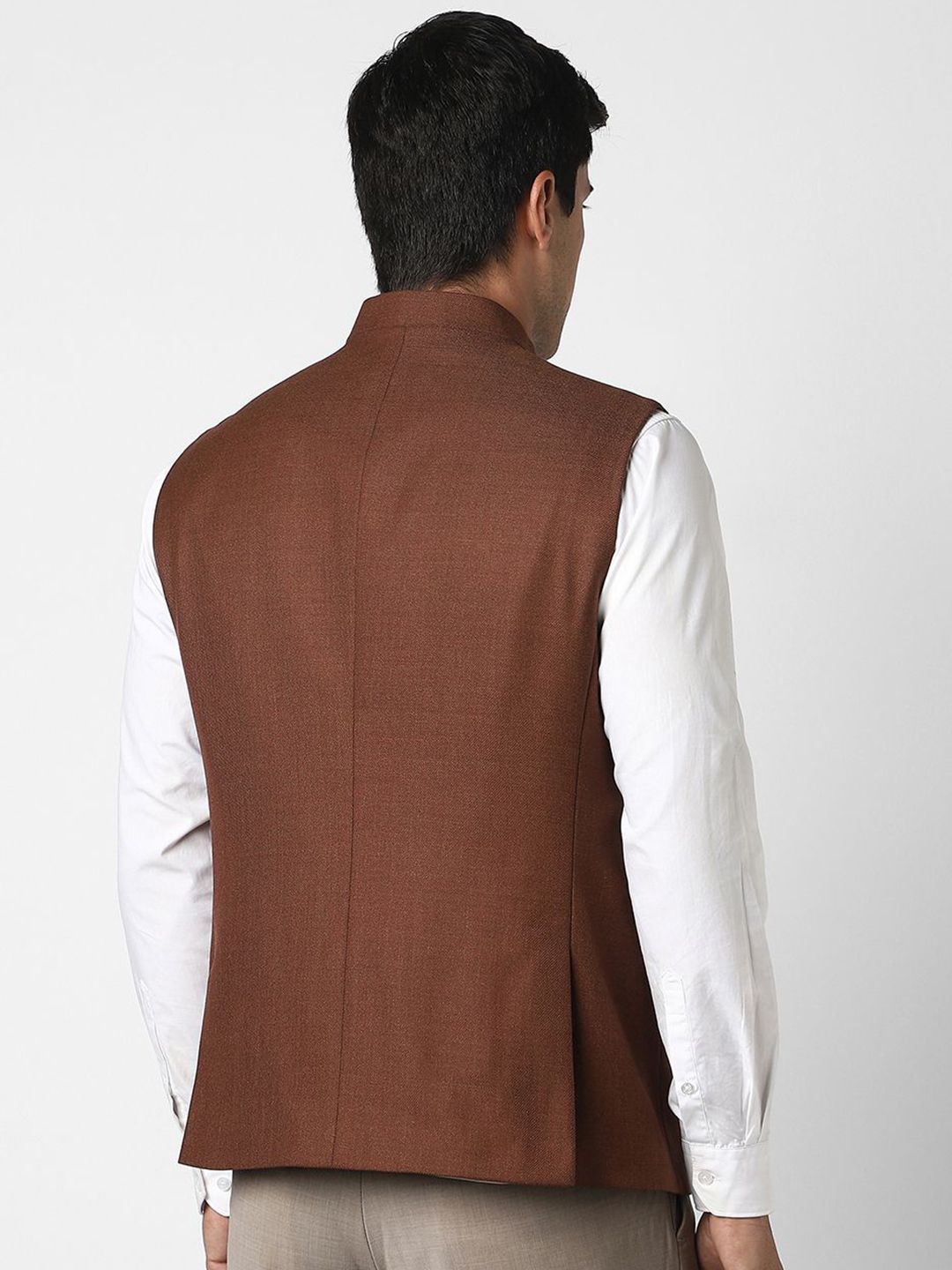 Brown textured slim-fit formal blazer, has a mandarin-collar, sleeveless sleeves, single-breasted with 5 button closure, two flap pockets, one welt pocket and a double-vented back hem