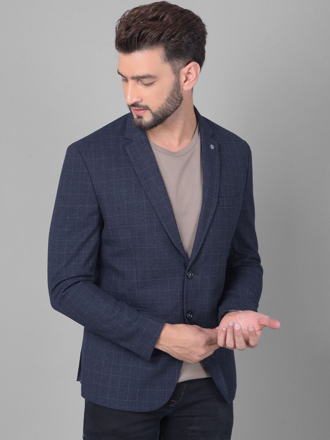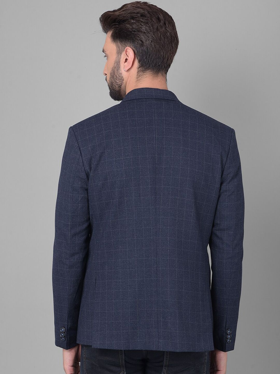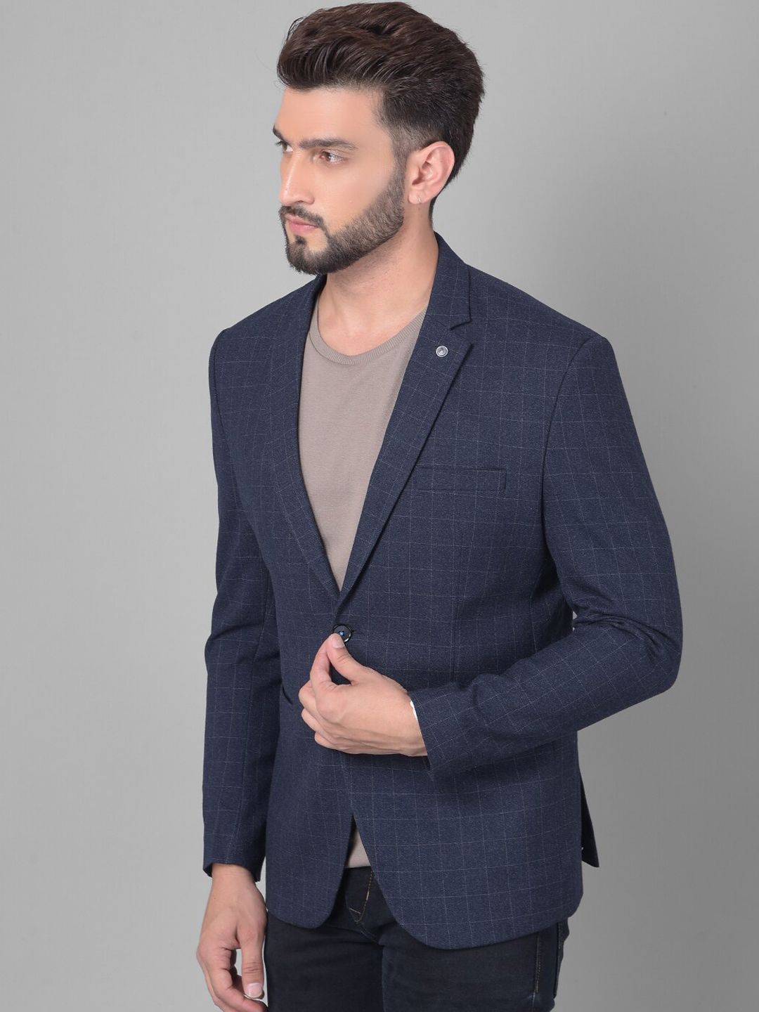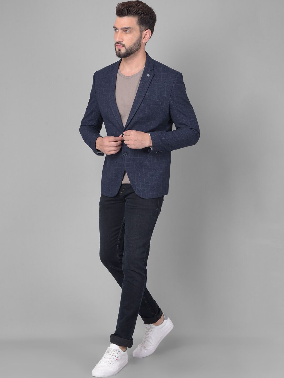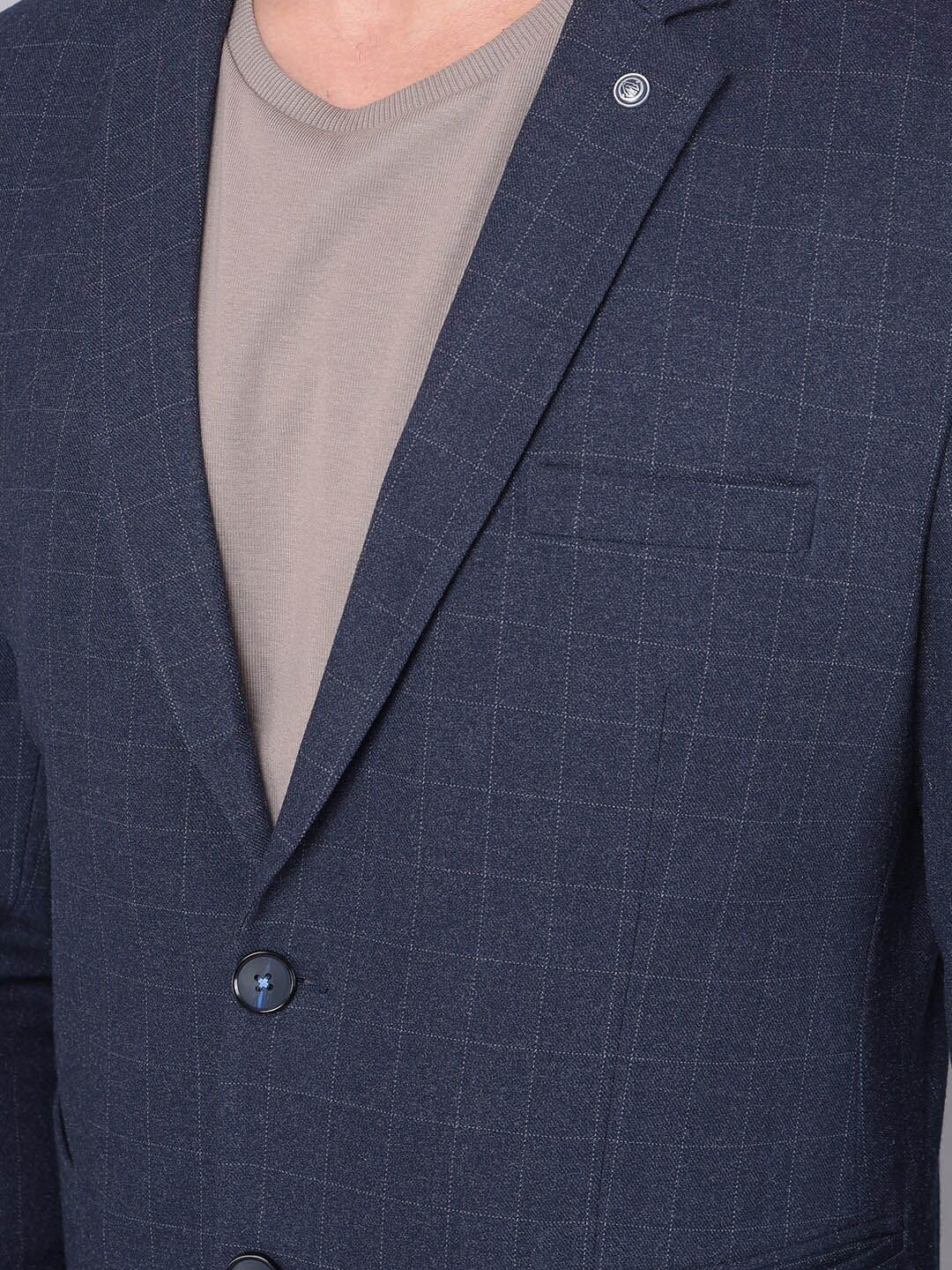 Navy blue checked slim-fit blazer, has a notched lapel collar, single-breasted with button closure, long sleeves, one welt pocket, two flap pockets, and double vented back hem