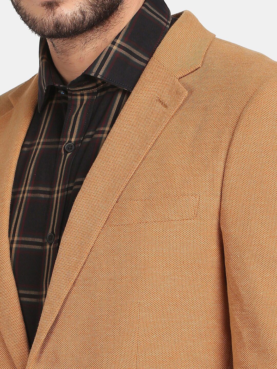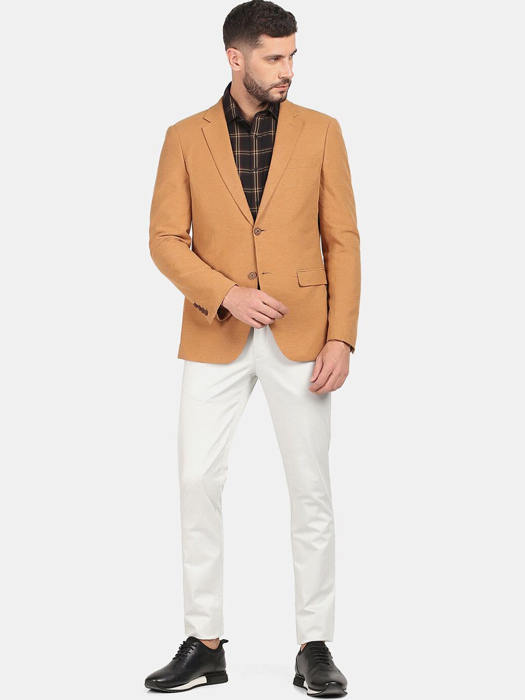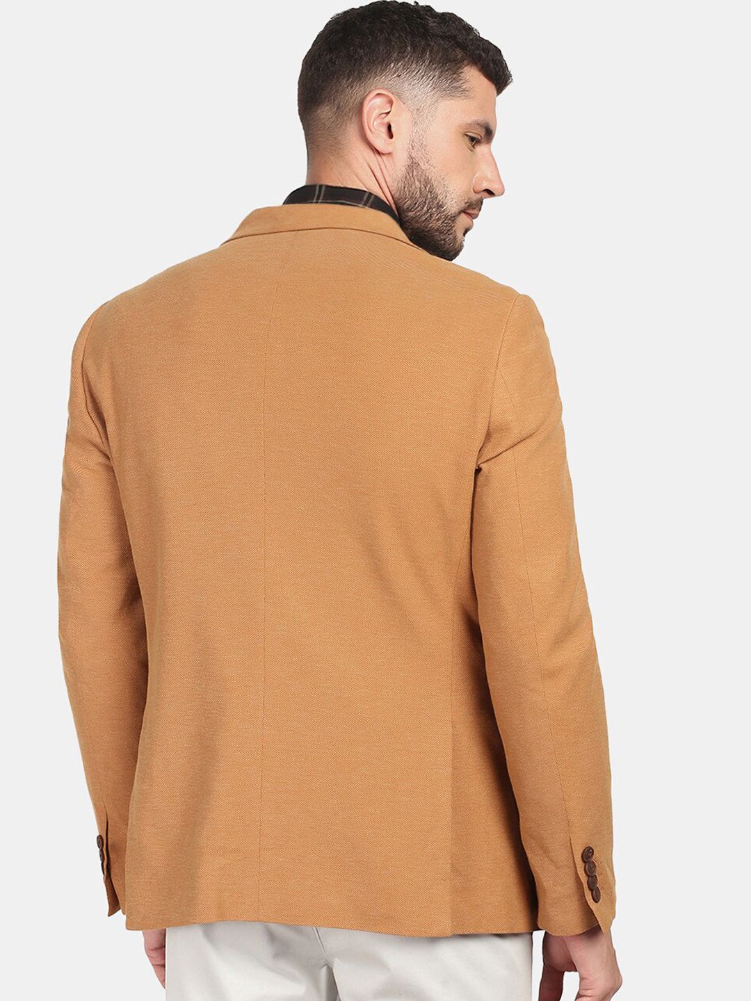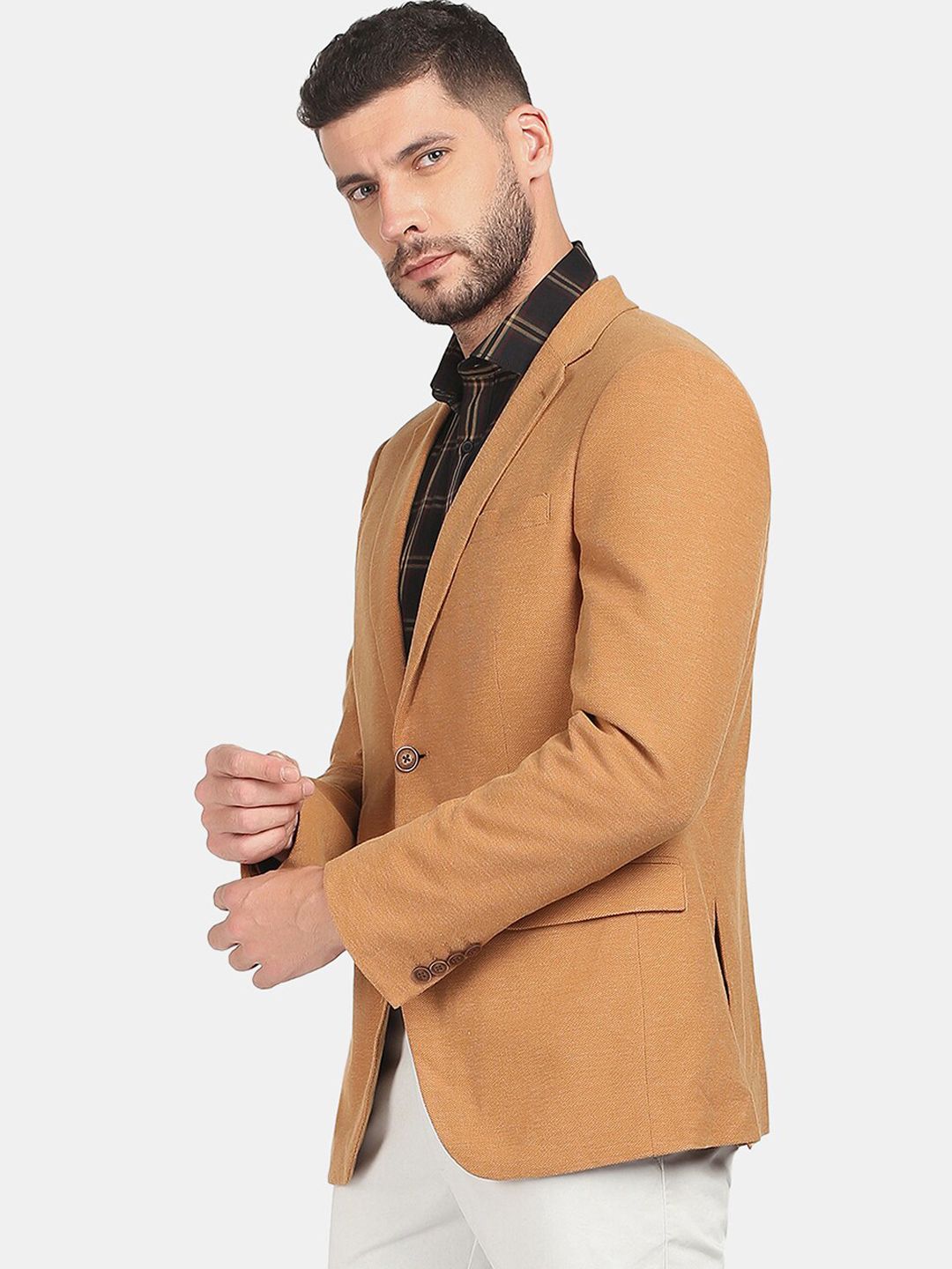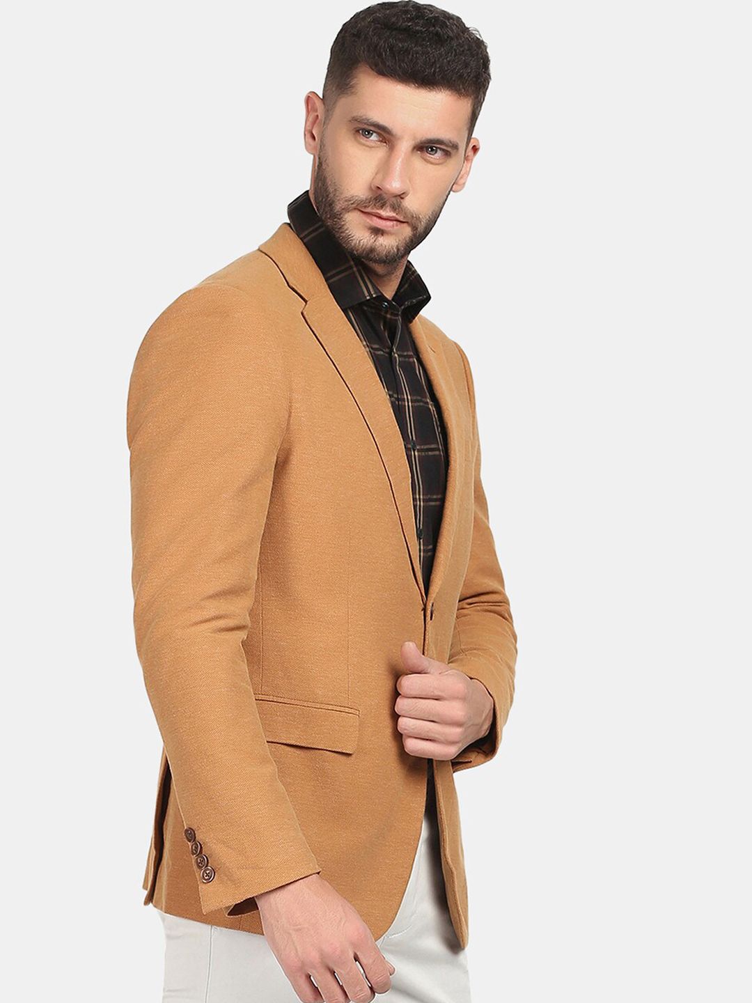 Brown solid slim-fit formal blazer, has a notched lapel, single-breasted with double button closures, long sleeves, three pockets