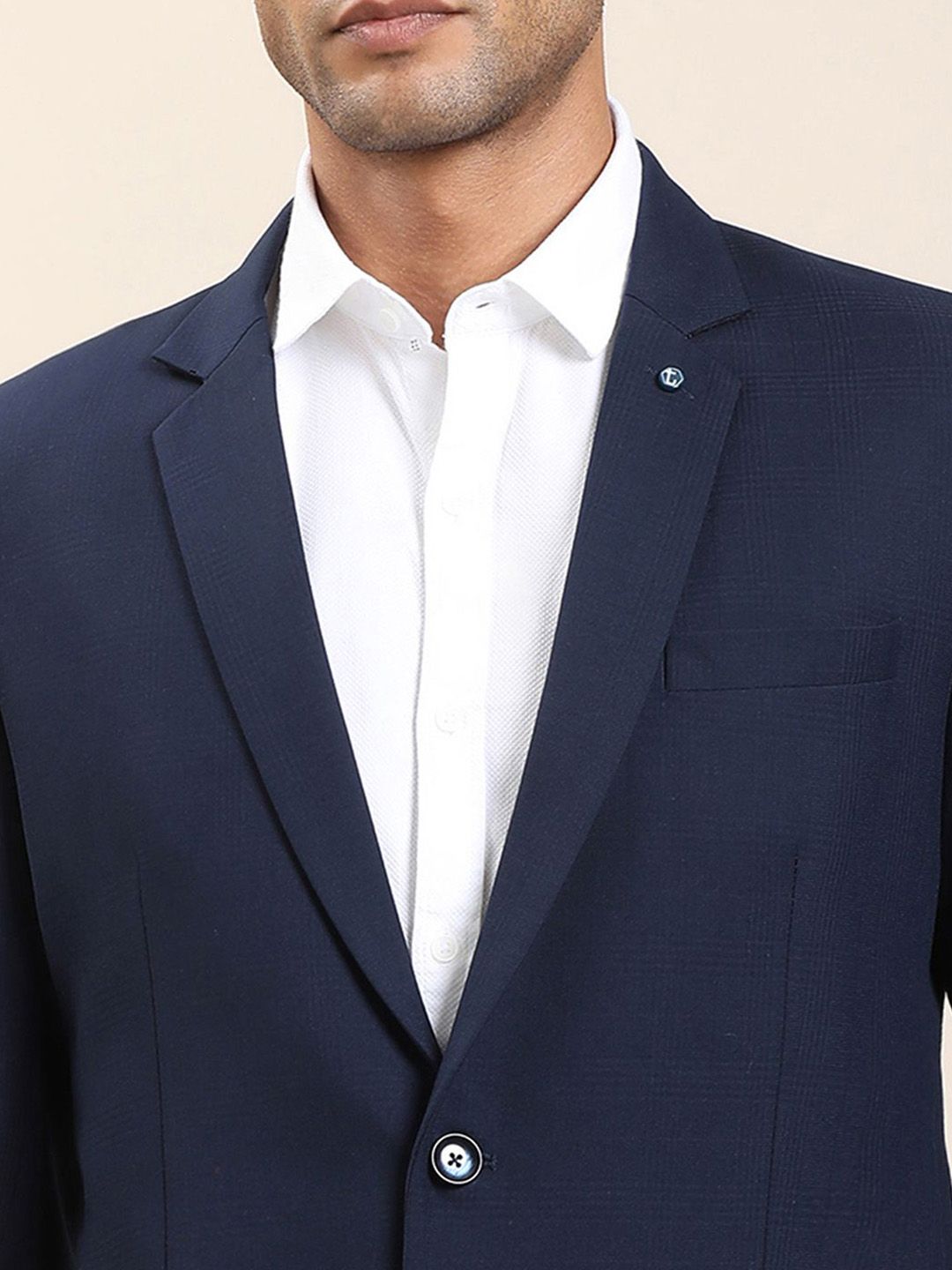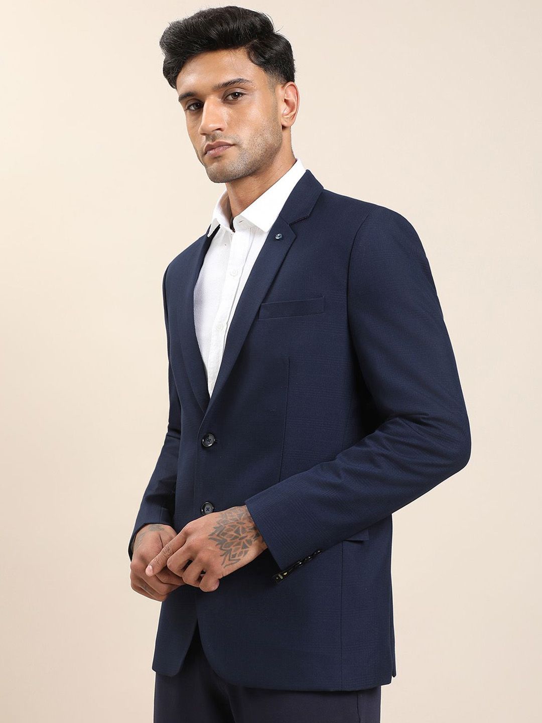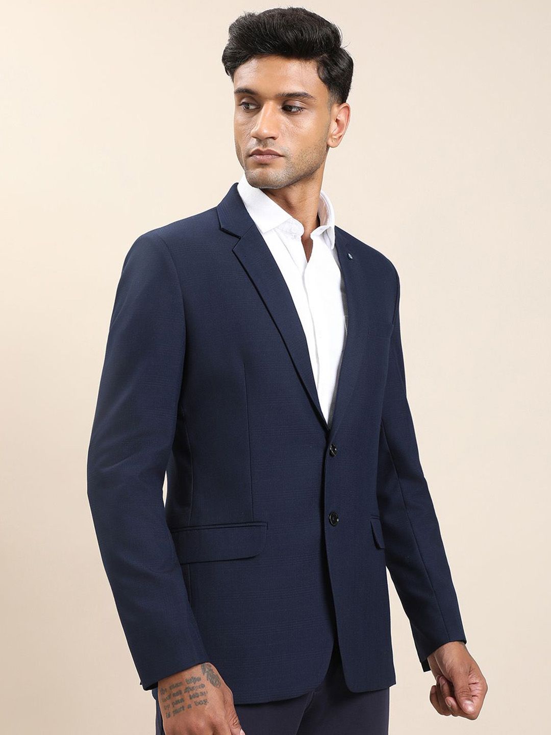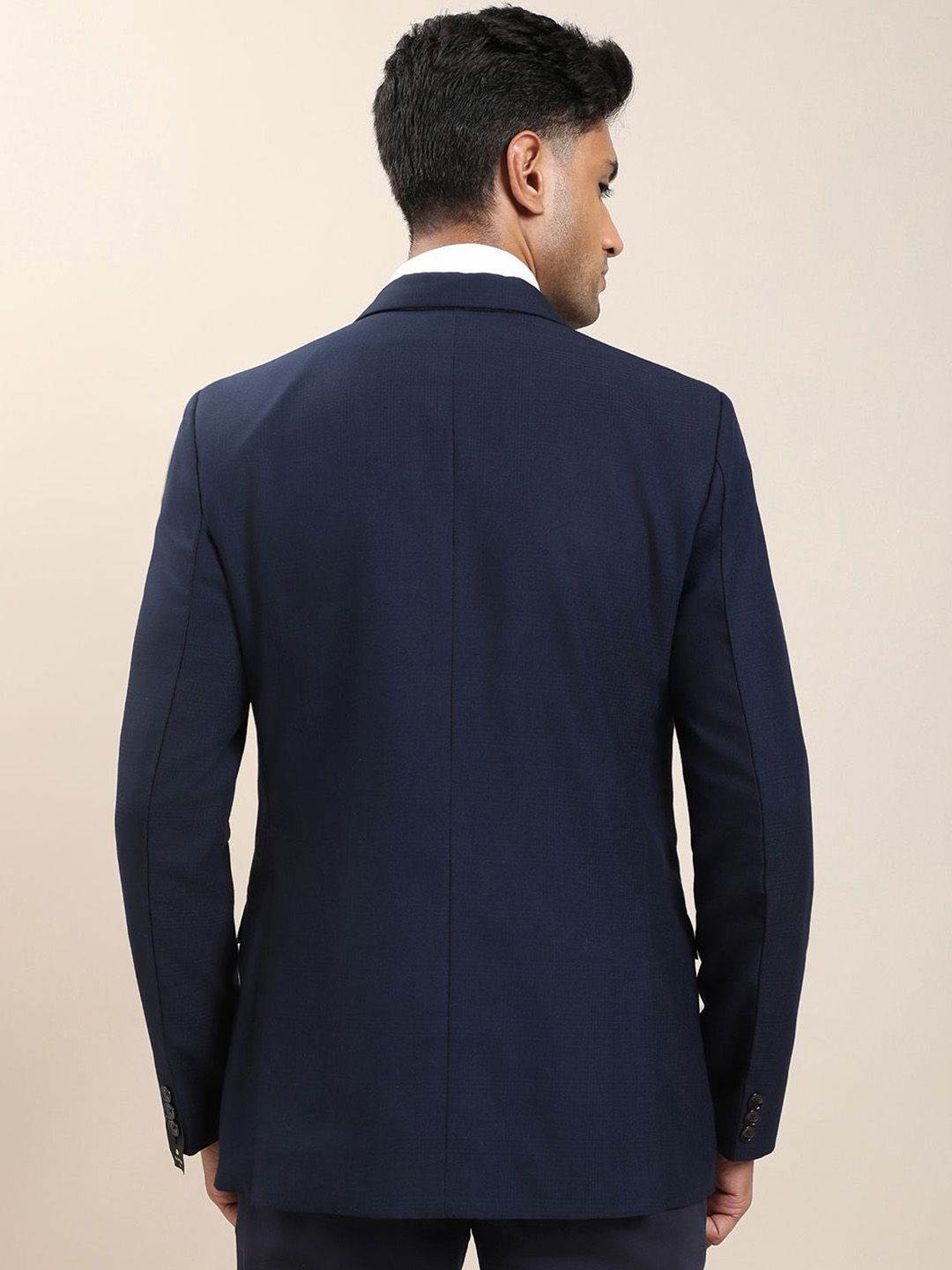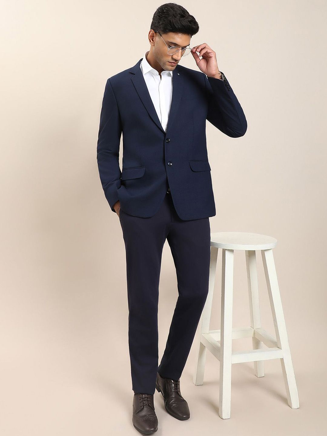 Blue solid tailored-fit casual blazer, has a notched lapel collar, single-breasted with button closure, long sleeves, one welt pocket, two flap pockets, and double vented back hem