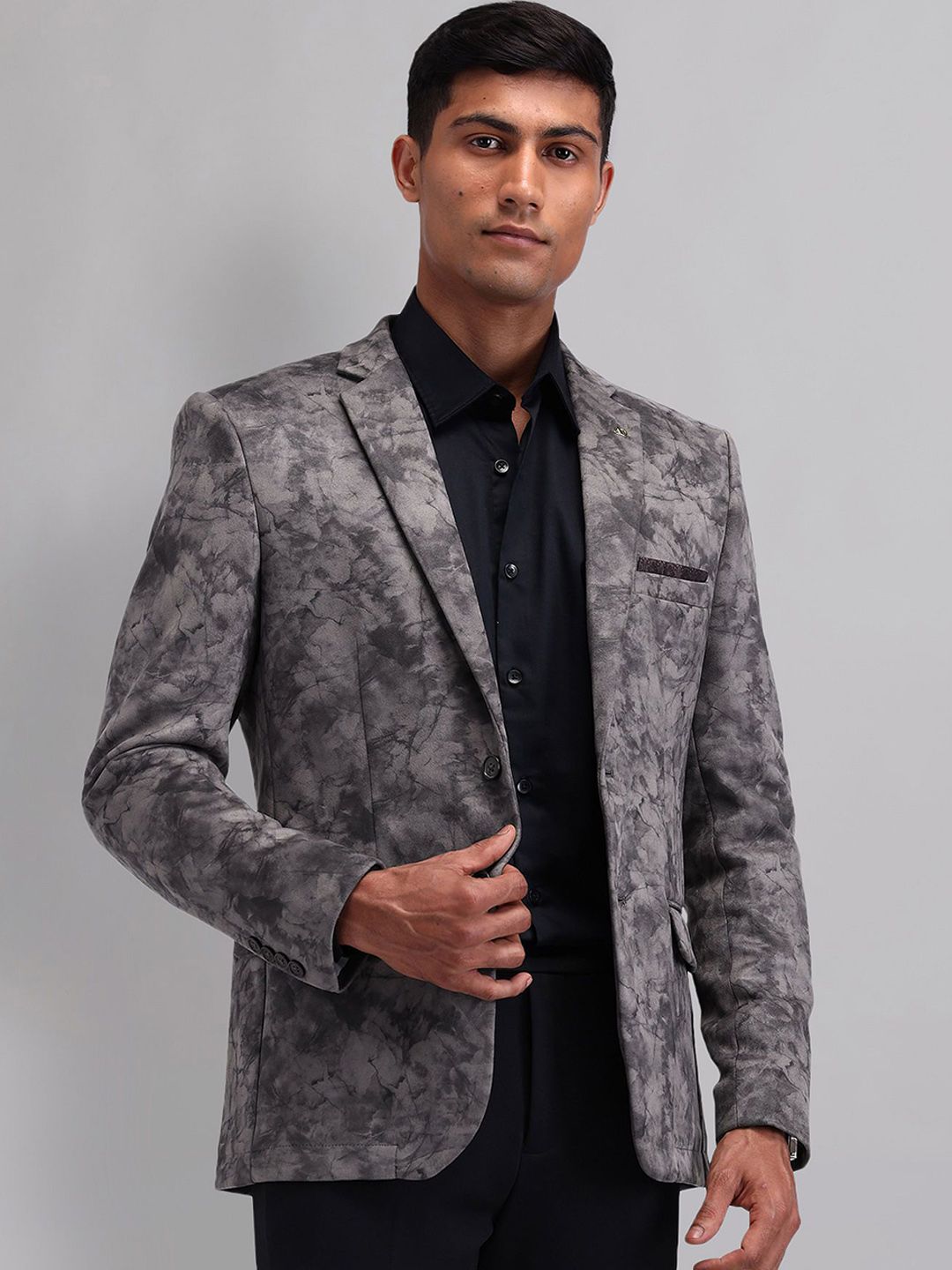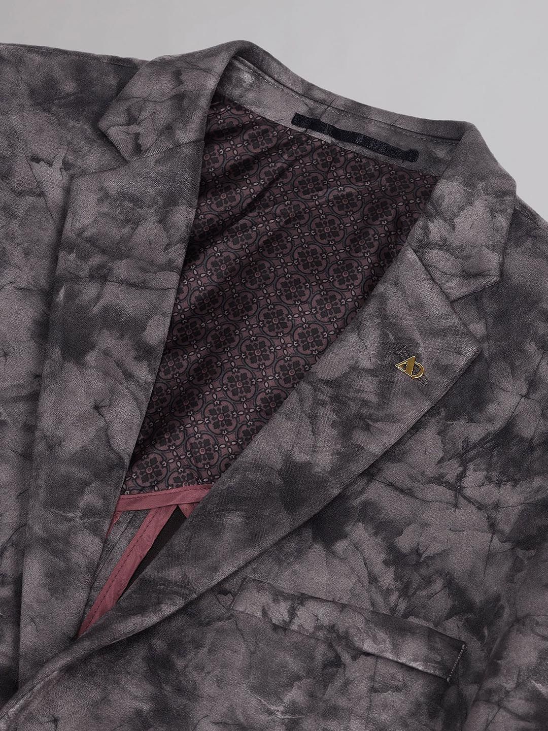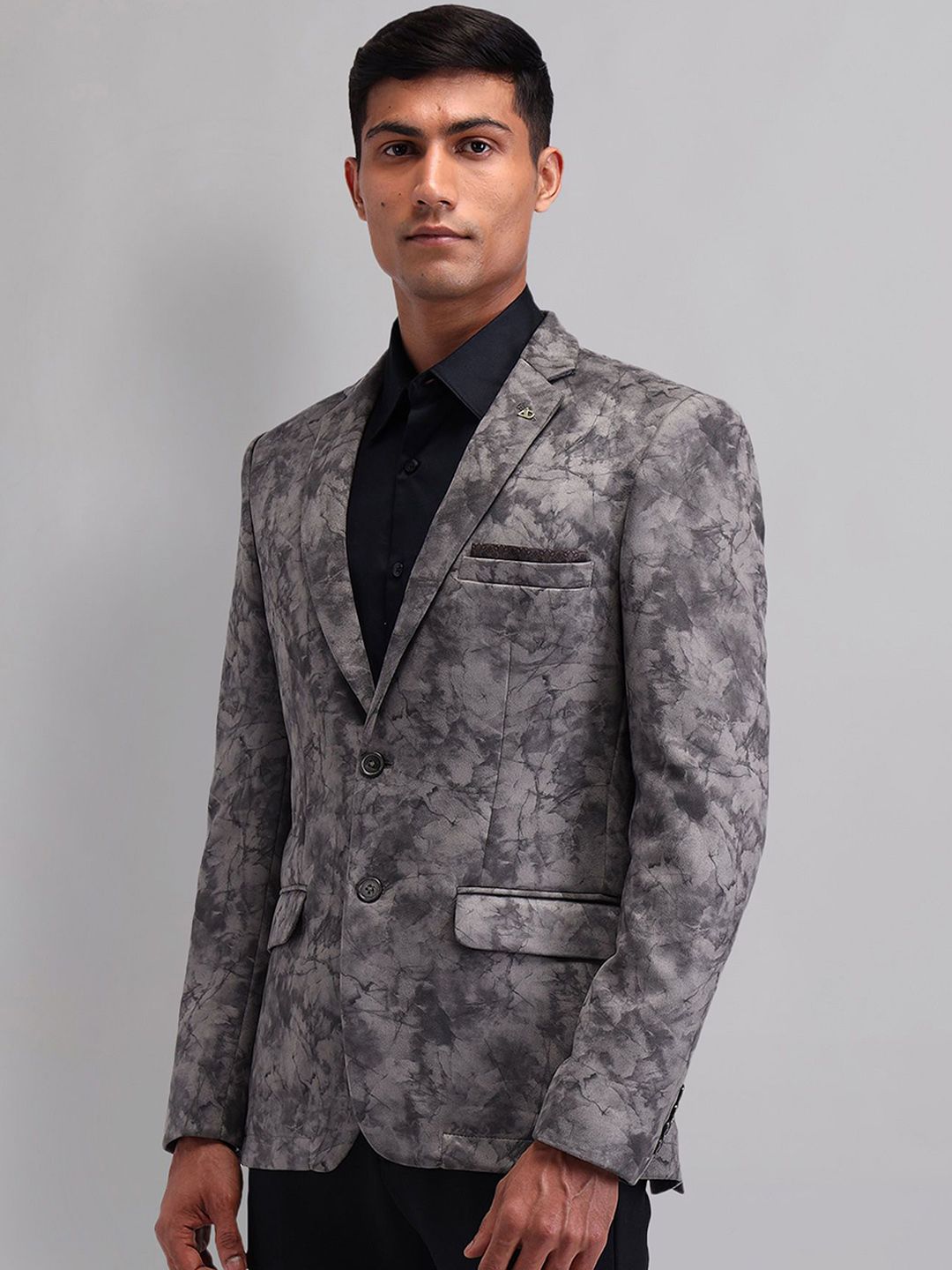 Grey printed slim-fit casual blazer, has a notched lapel, long sleeves, single-breasted with double button closure, two flap pockets, one welt pocket and a double-vented back hem