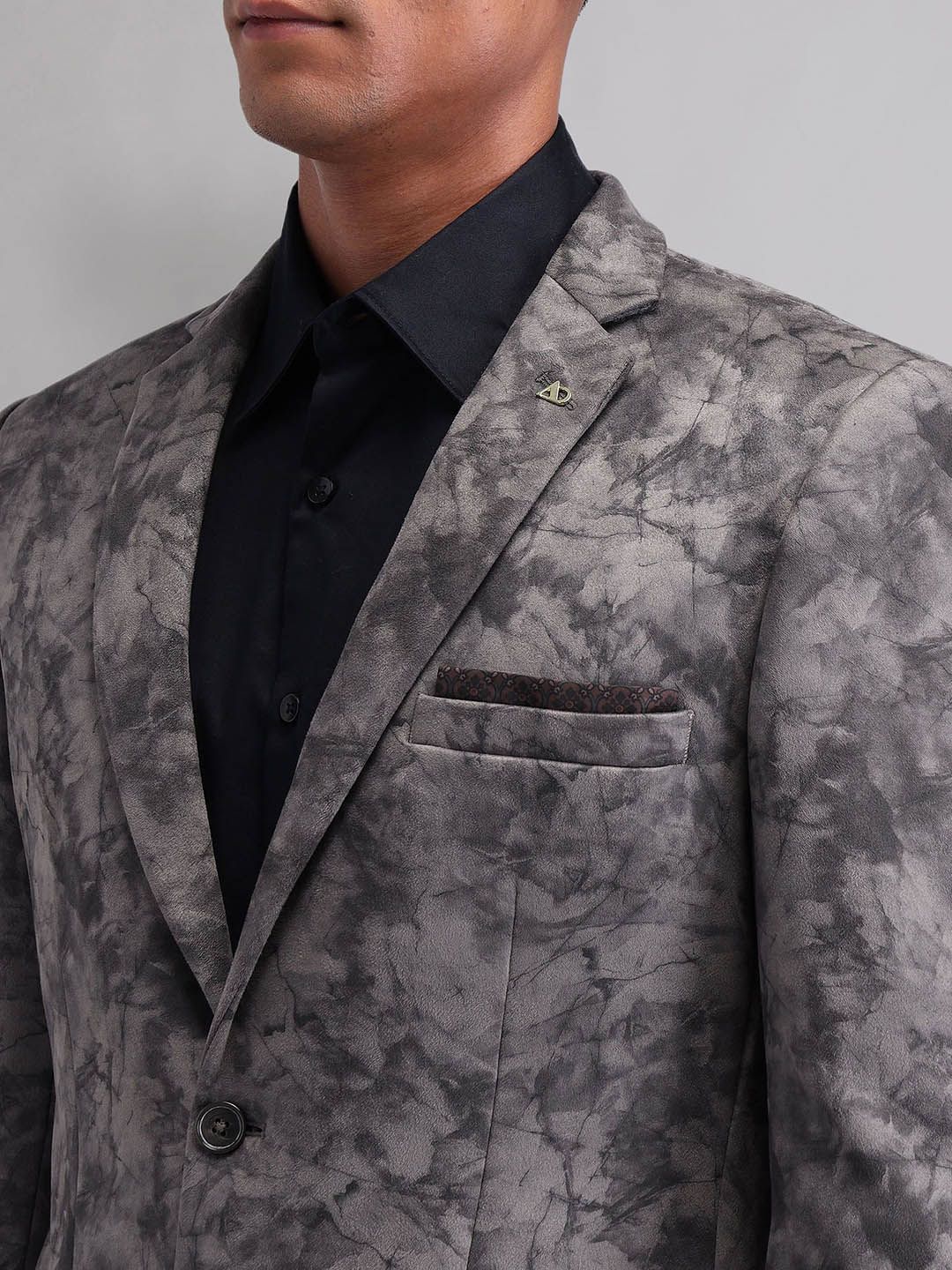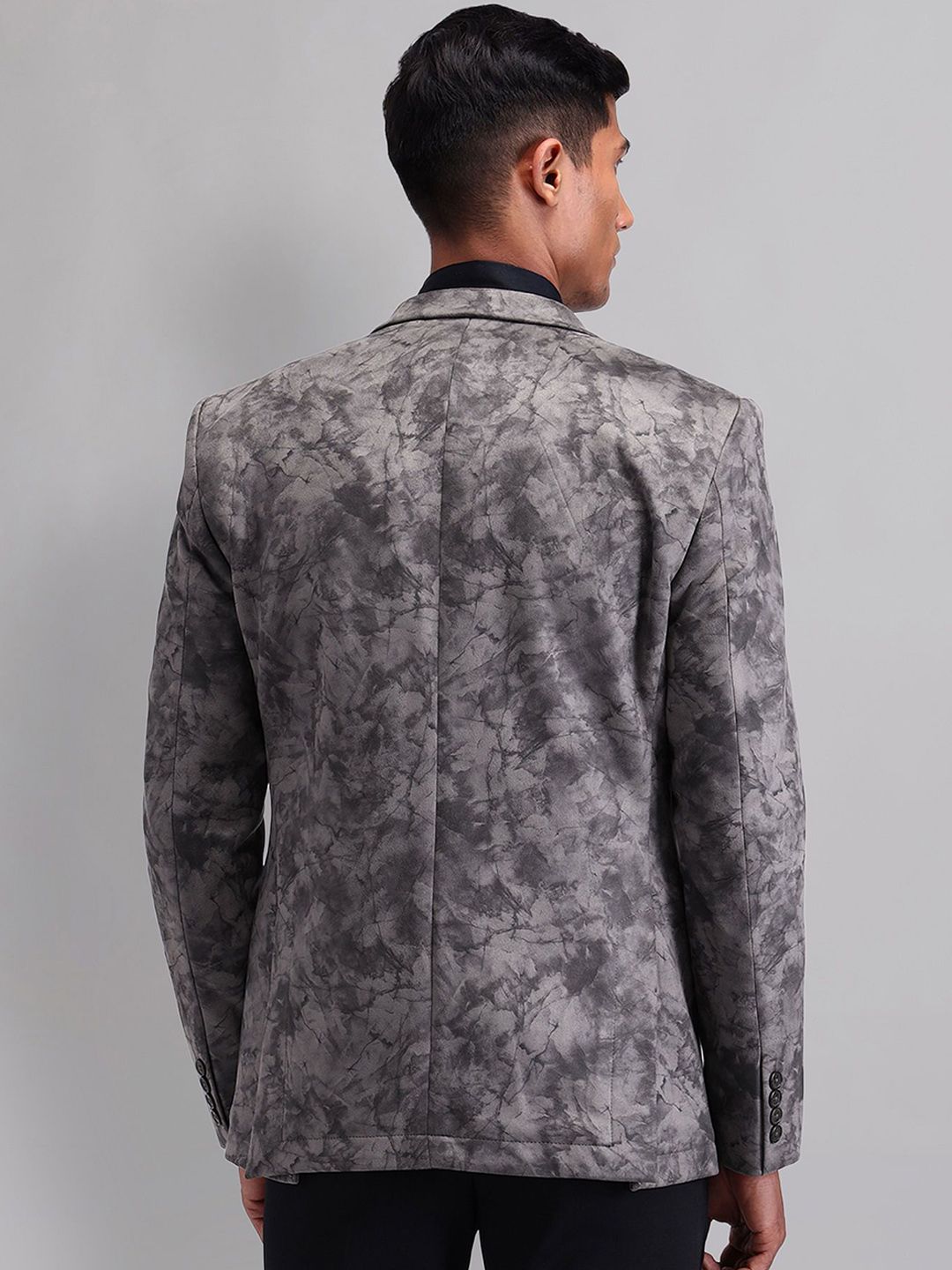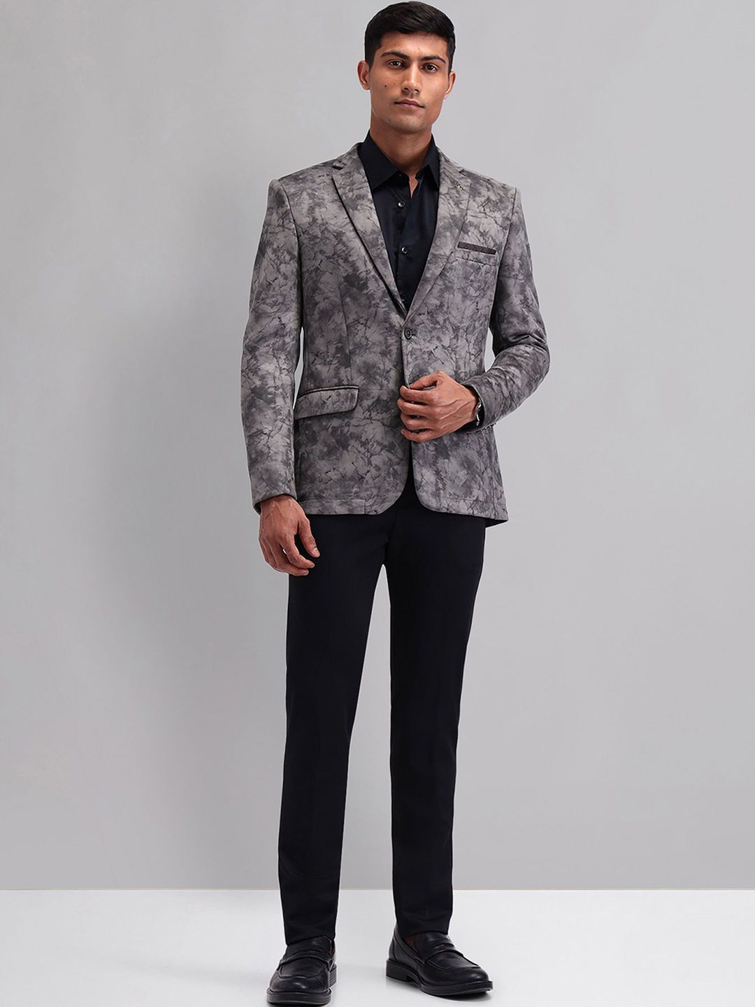Grey printed slim-fit casual blazer, has a notched lapel, long sleeves, single-breasted with double button closure, two flap pockets, one welt pocket and a double-vented back hem