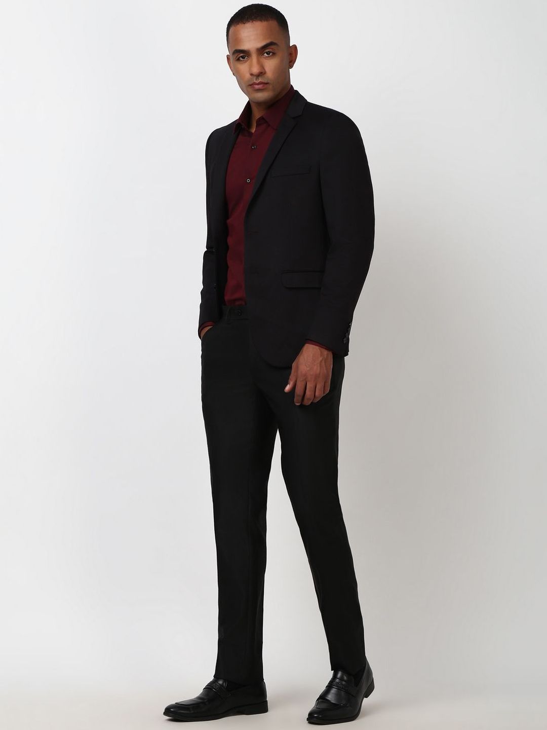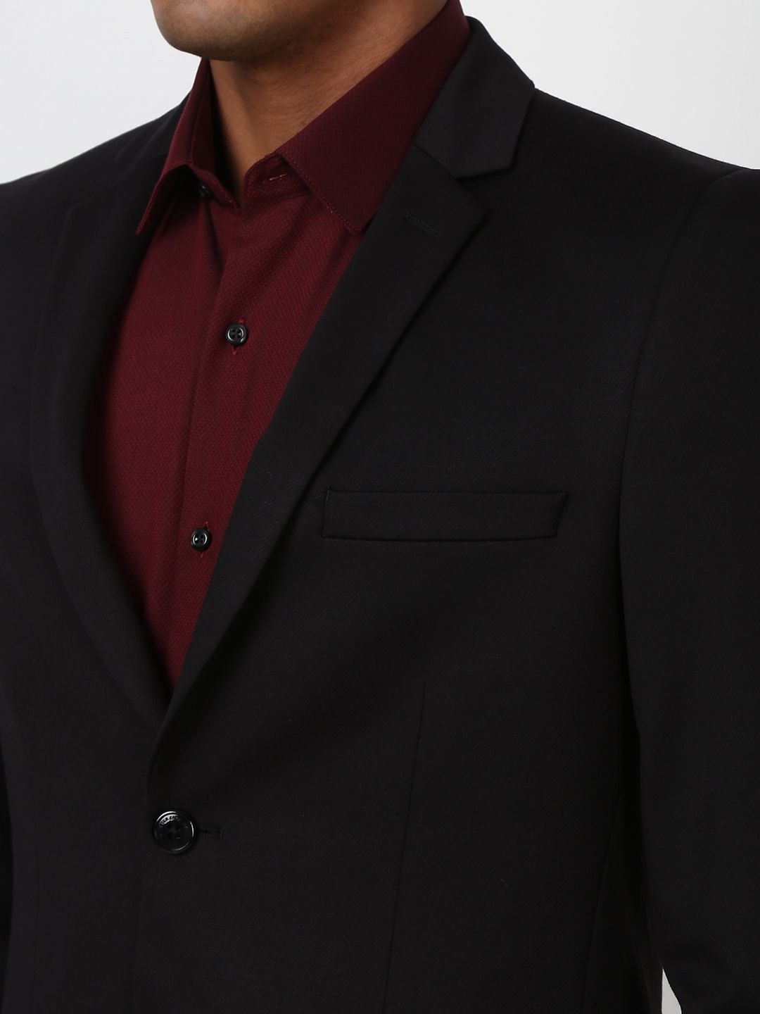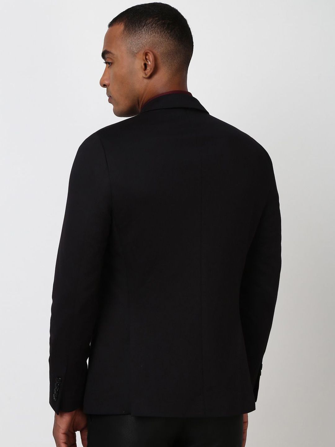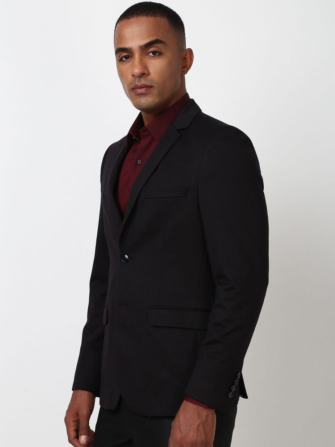 Black solid slim-fit blazer, has a notched lapel collar, single-breasted with button closure, long sleeves, one welt pocket, two flap pockets, and double vented back hem