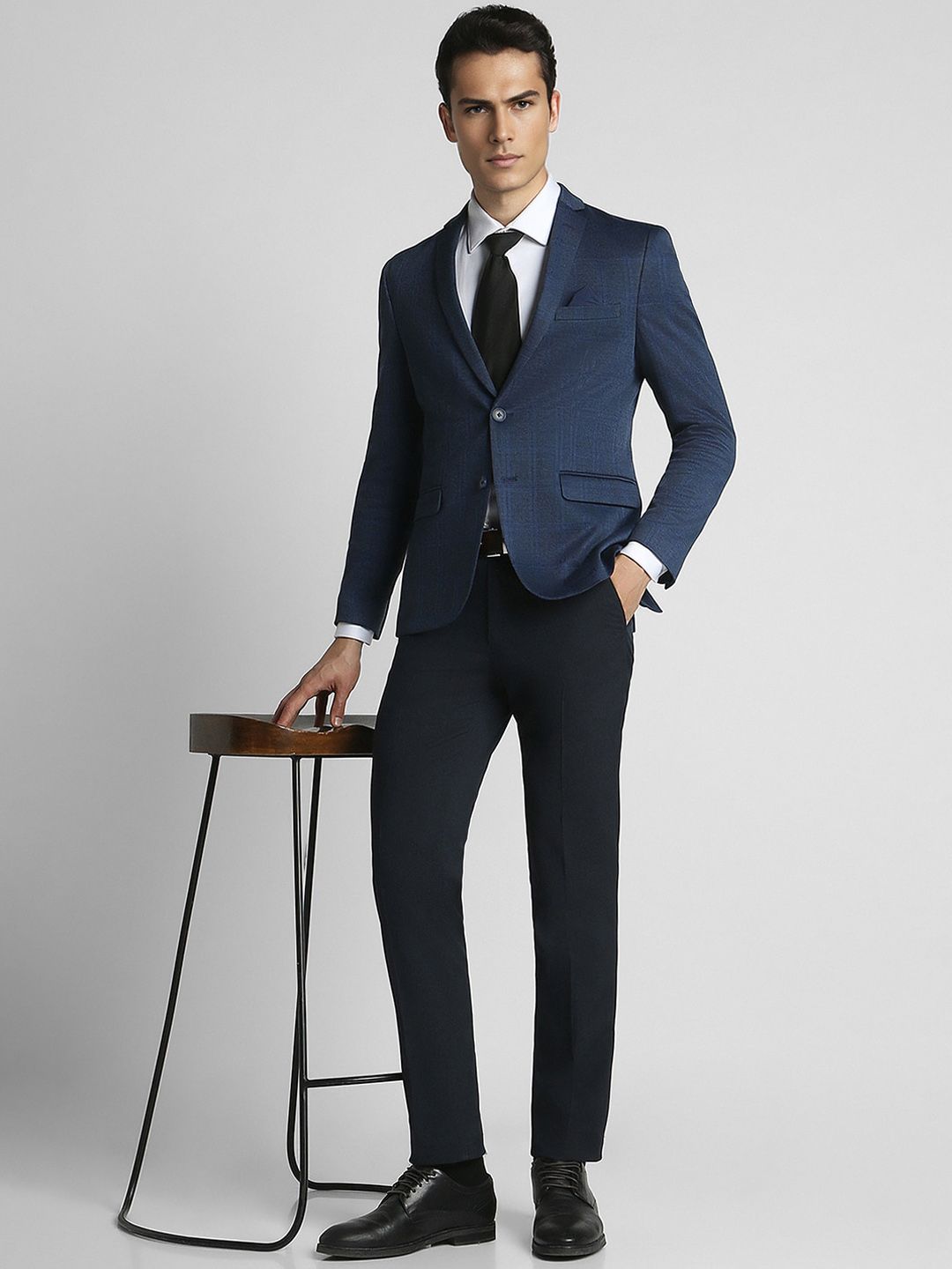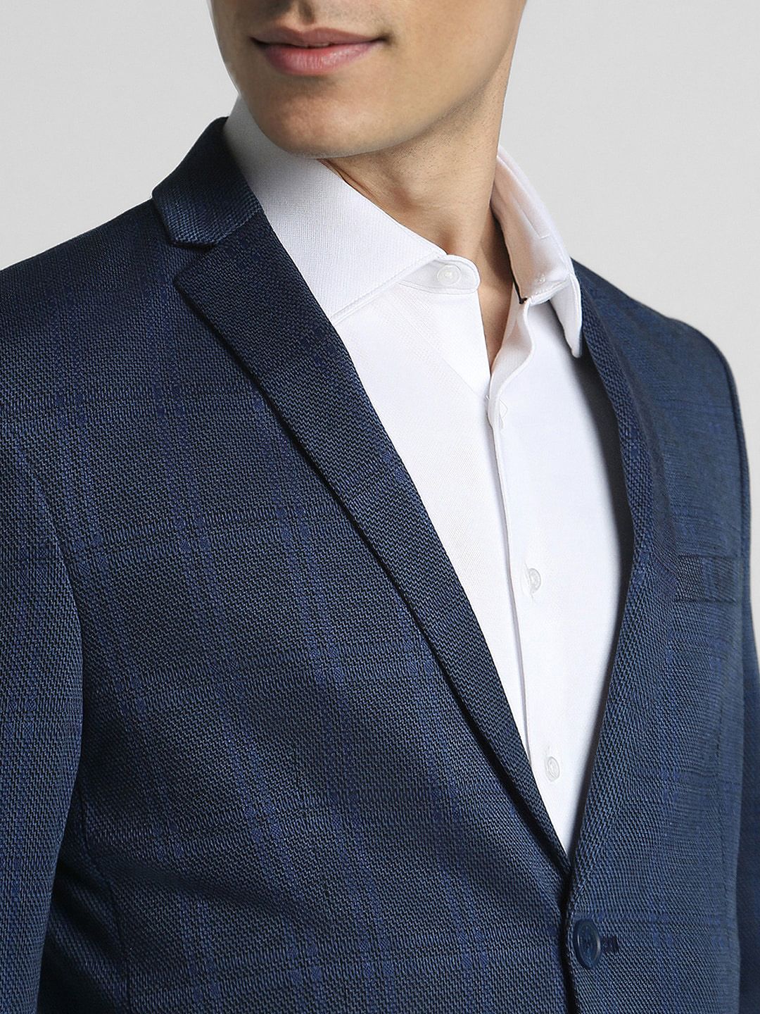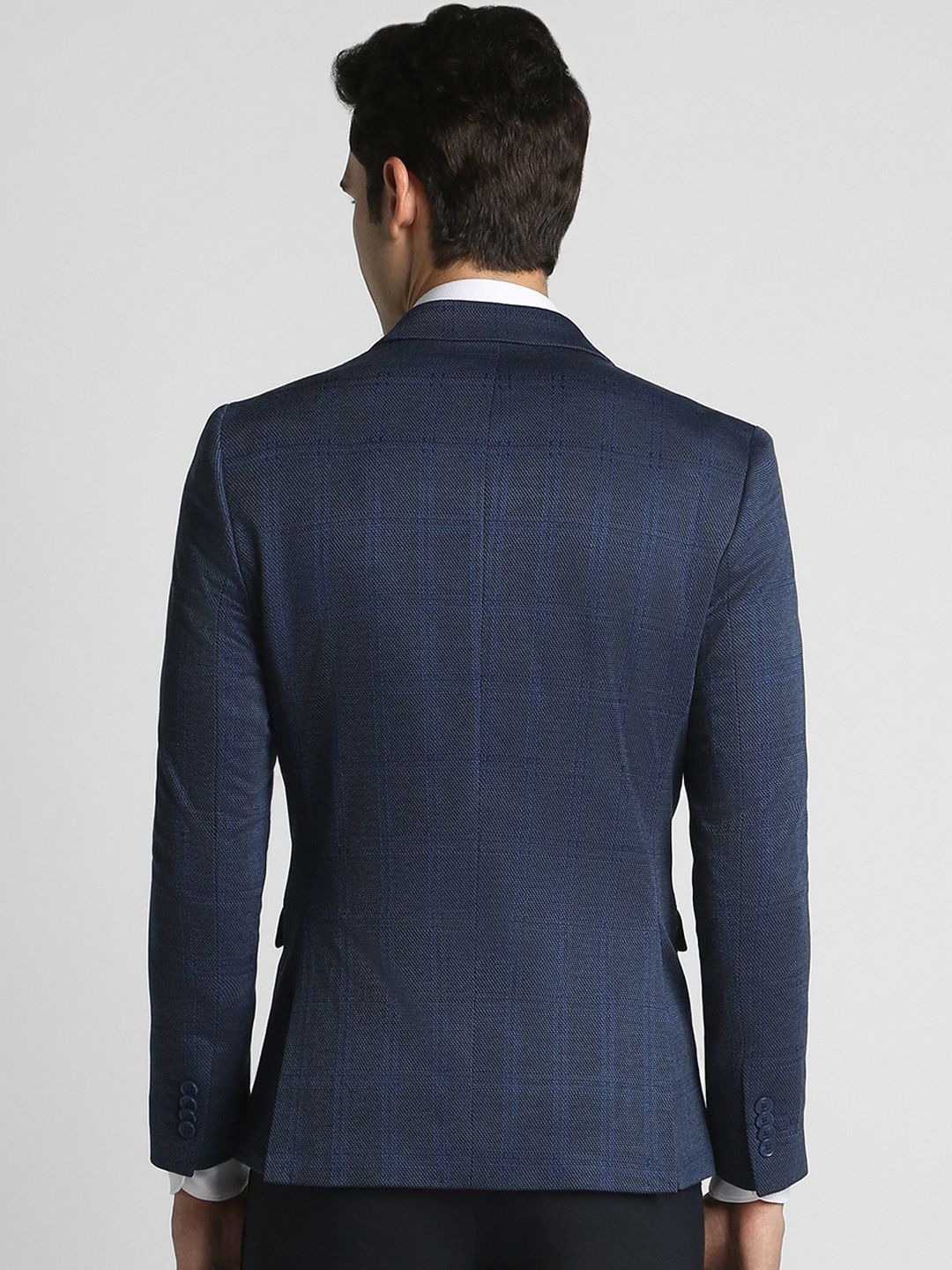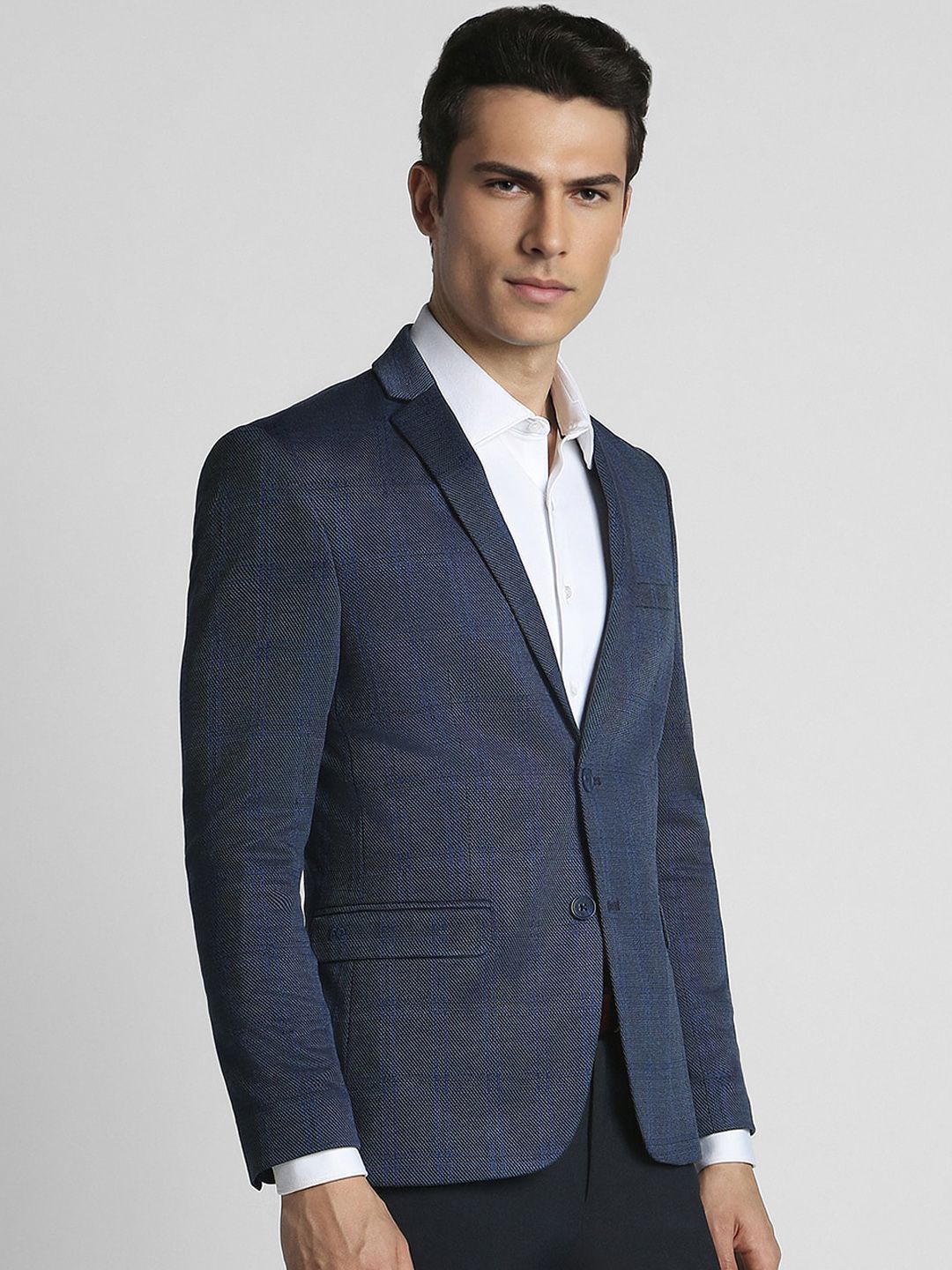 Navy blue checked slim-fit single-breasted formal blazer, has a notched lapel collar, button closure, long sleeves, three pockets, an attached lining with two in-built pockets and a double vented back hem