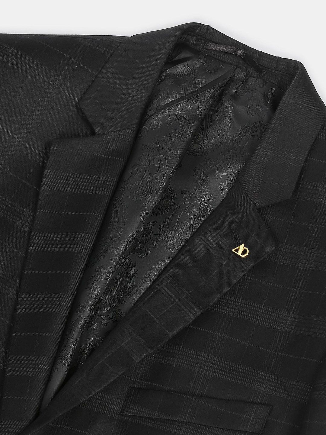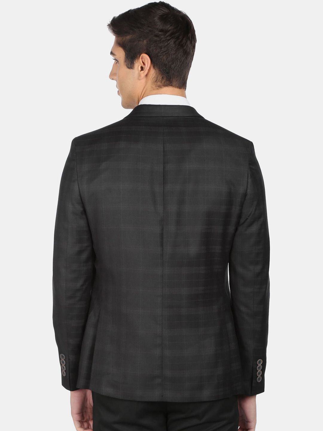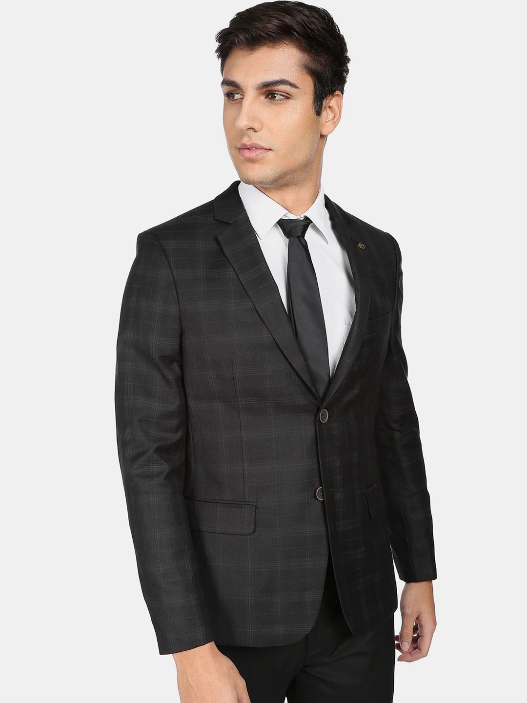 Black Checked Tailored Fit formal blazer, has a notched lapel, long sleeves, single-breasted with double button closure, two flap pockets, one welt pocket and a double-vented back hem
