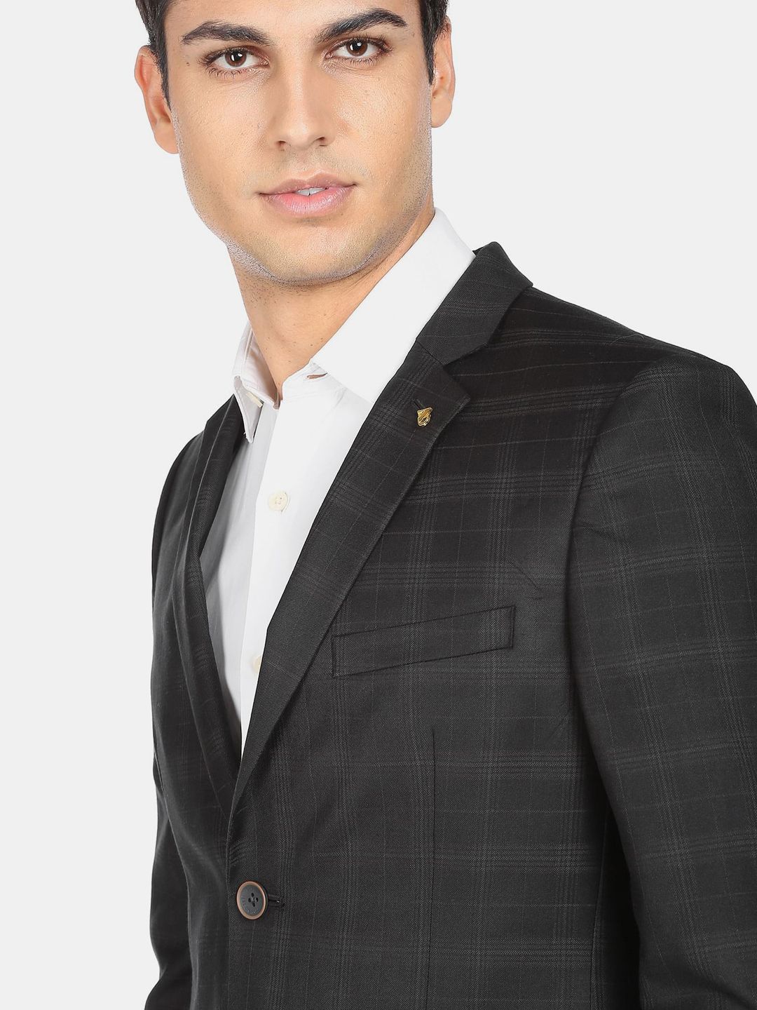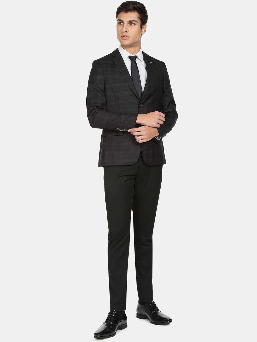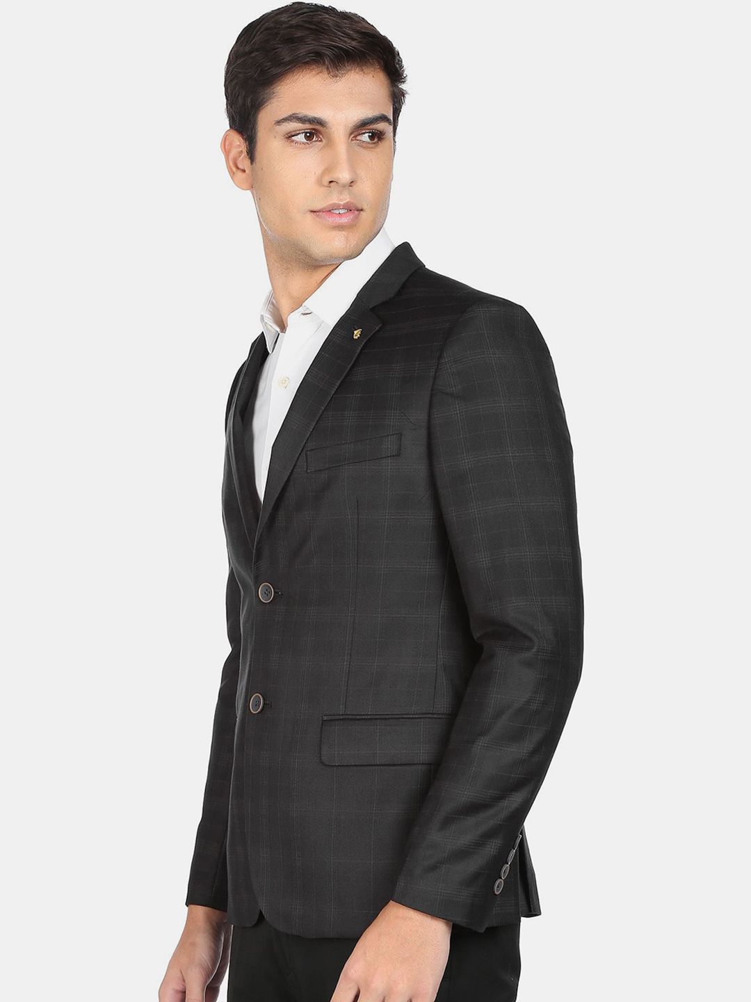 Black Checked Tailored Fit formal blazer, has a notched lapel, long sleeves, single-breasted with double button closure, two flap pockets, one welt pocket and a double-vented back hem