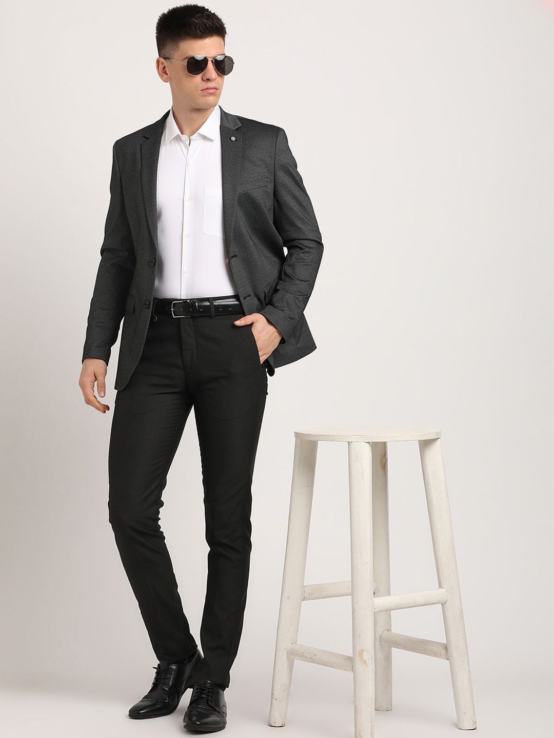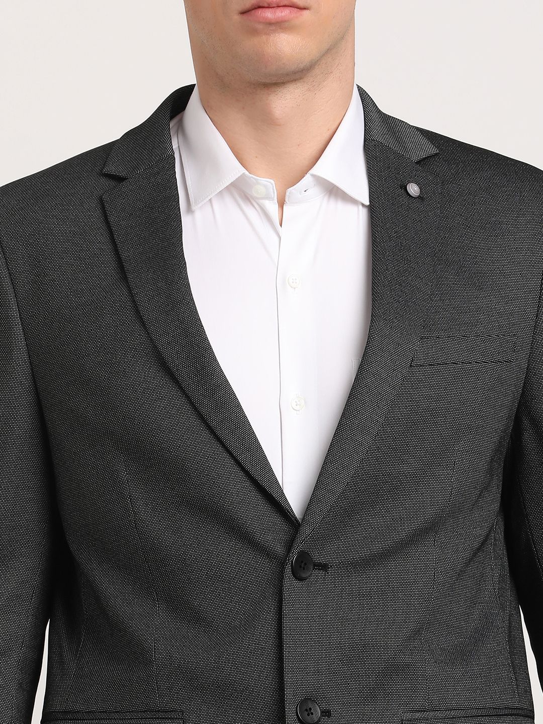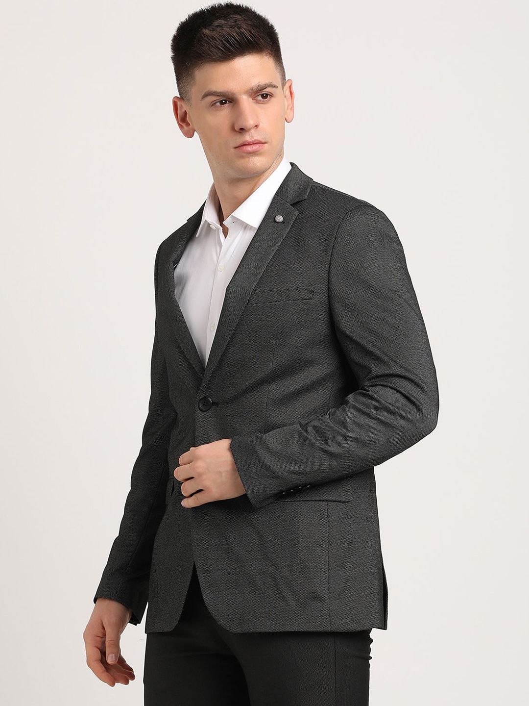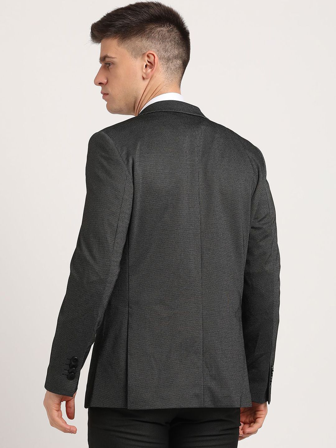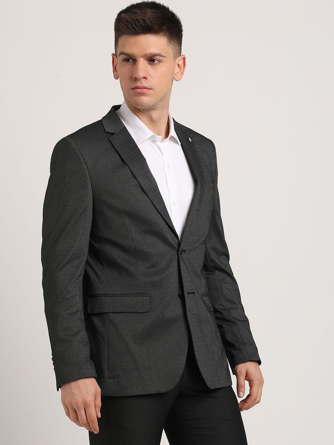 Black self designed regular-fit smart-casual blazer, has a notched lapel, long sleeves, single-breasted with double button closure, two flap pockets, one welt pocket and a double-vented back hem