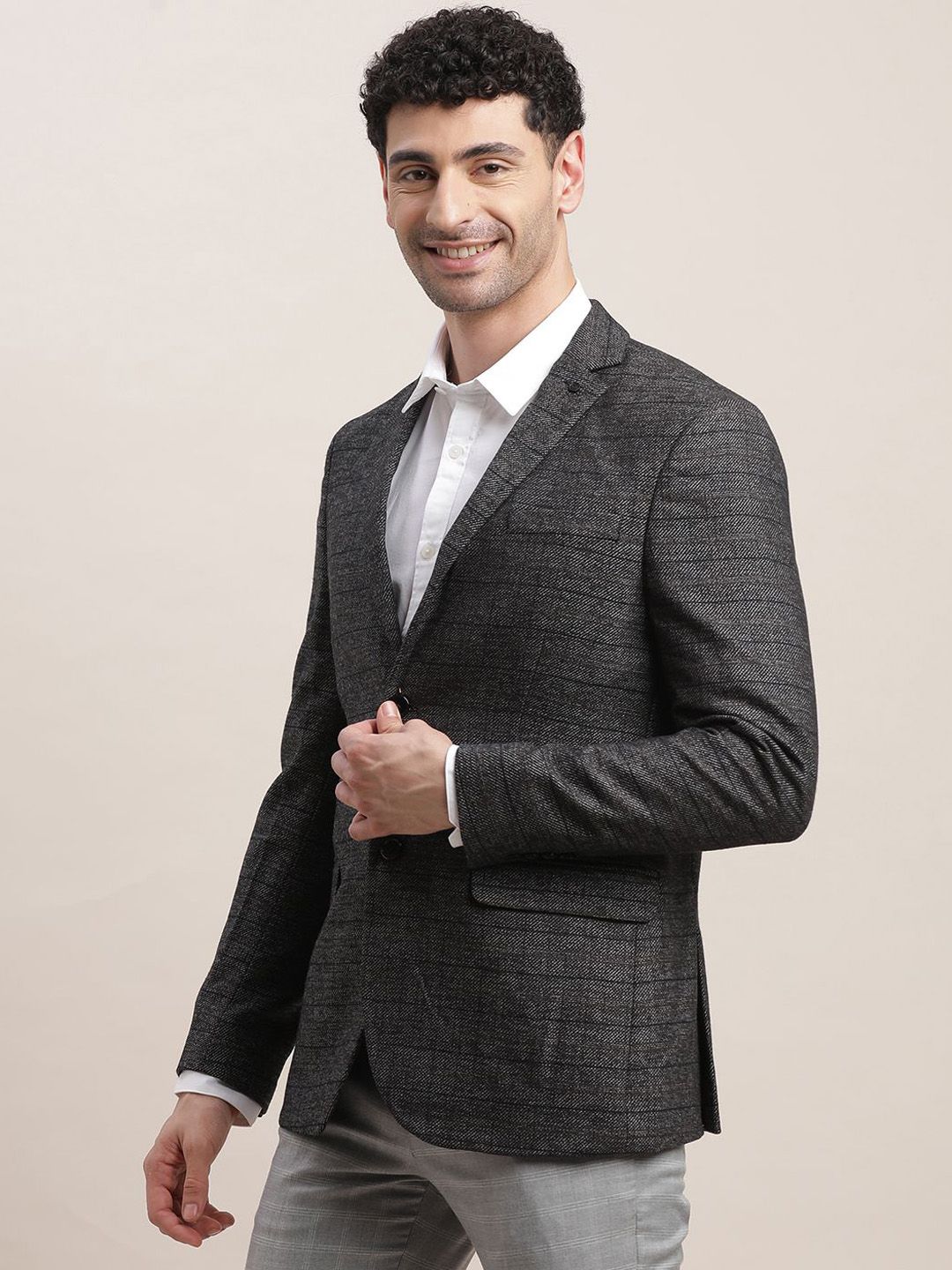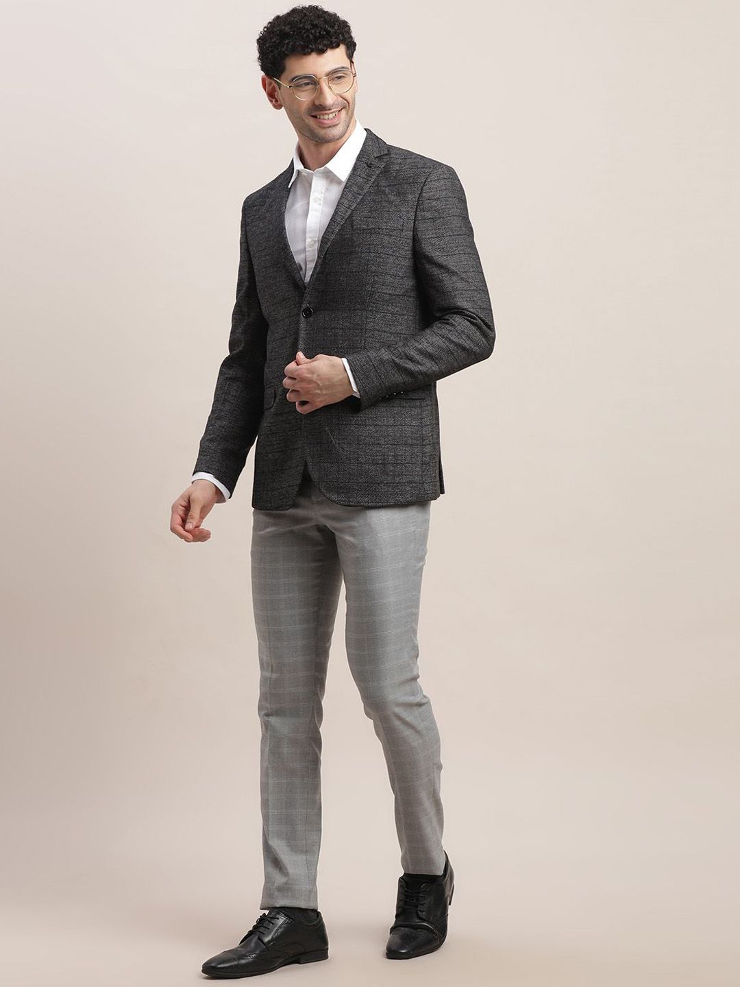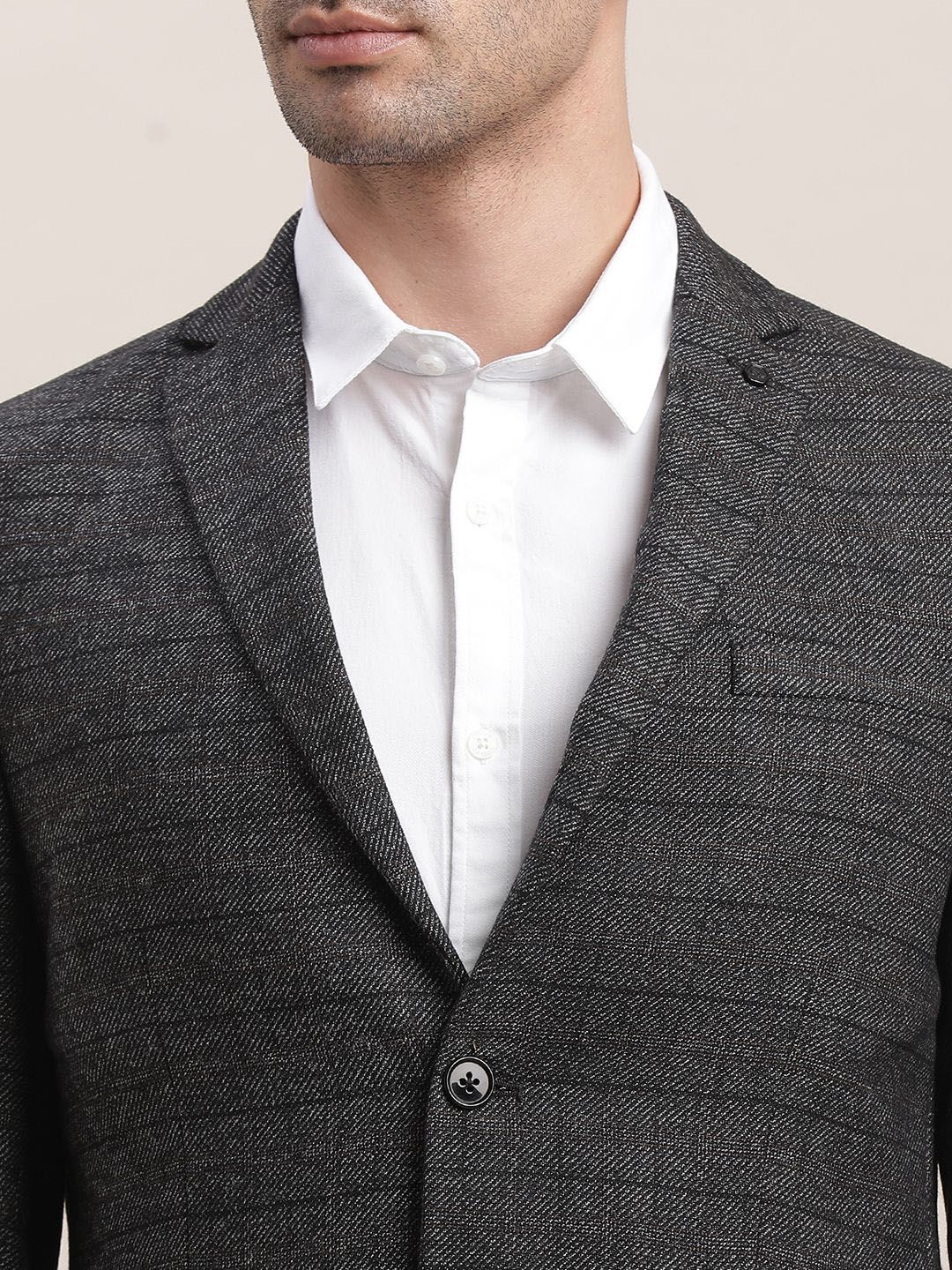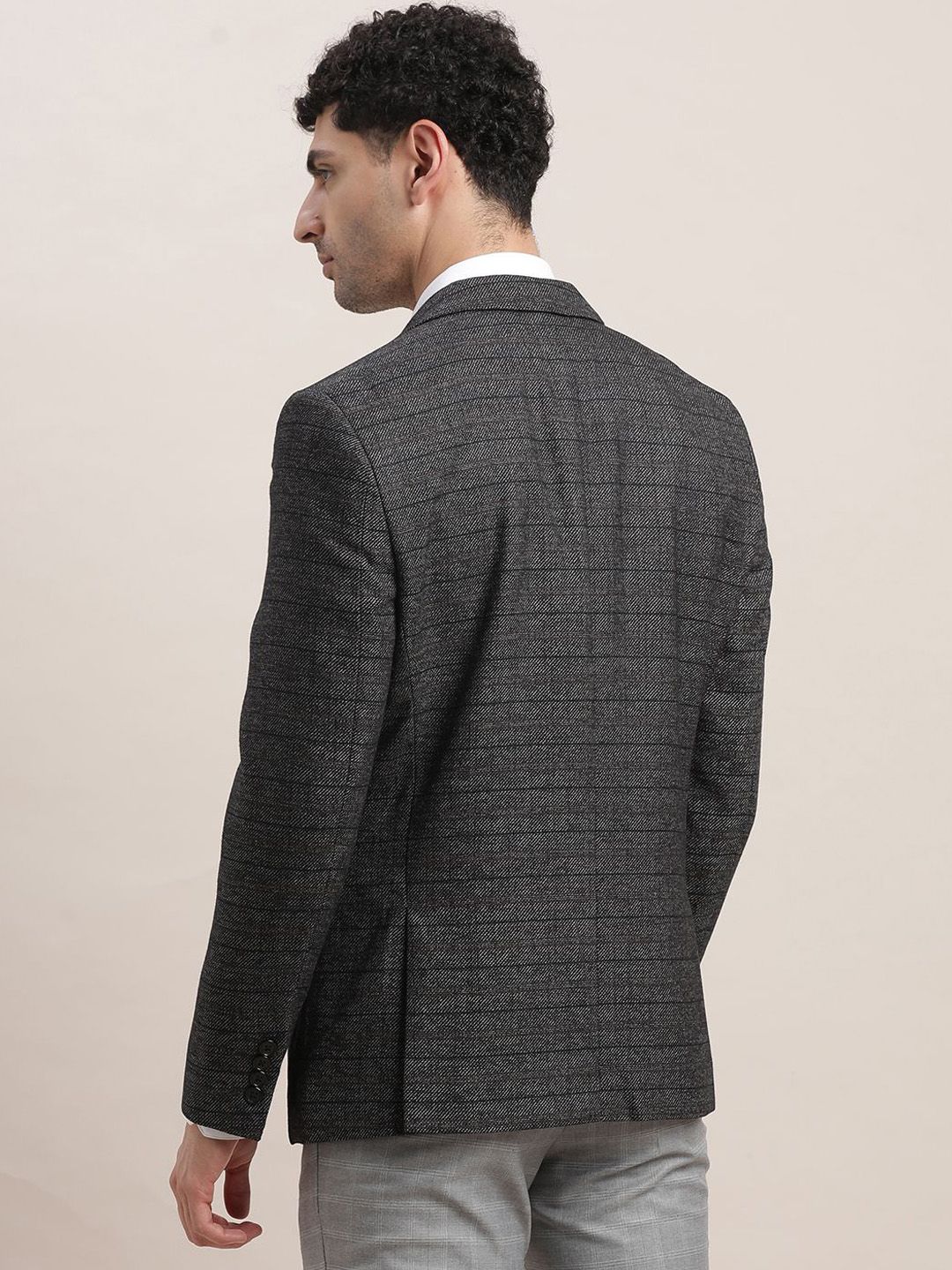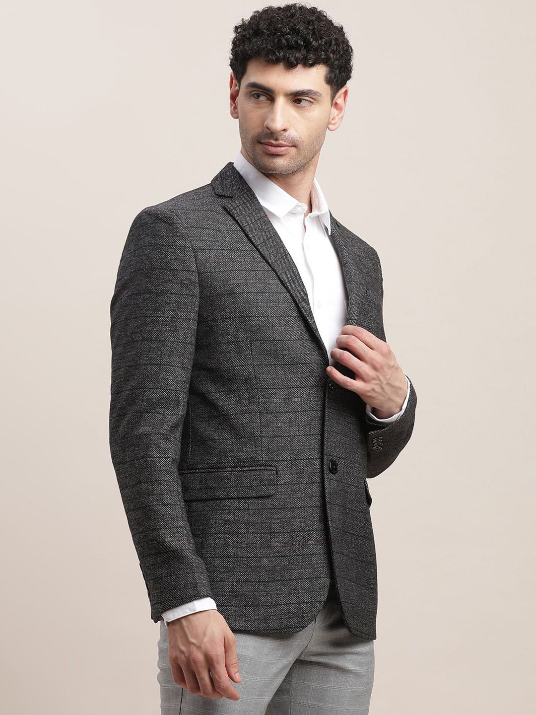 Charcoal Grey checked single-breasted blazer, has a notched lapel collar, long sleeves, 3 inner pockets, 2 front mock pockets, regular length, and an attached lining