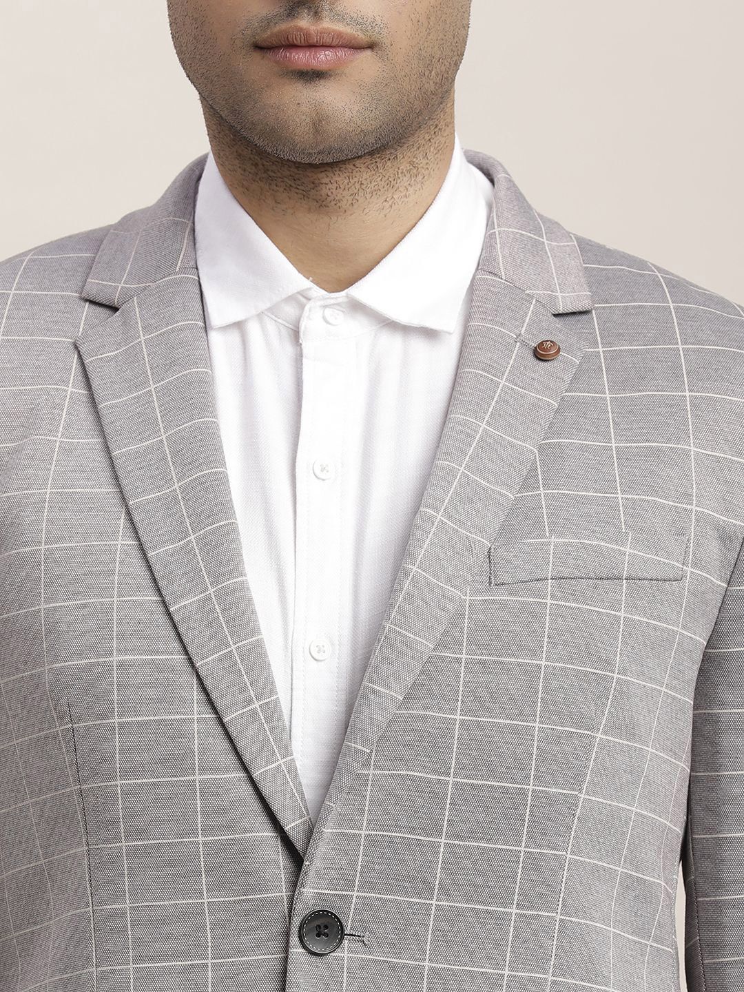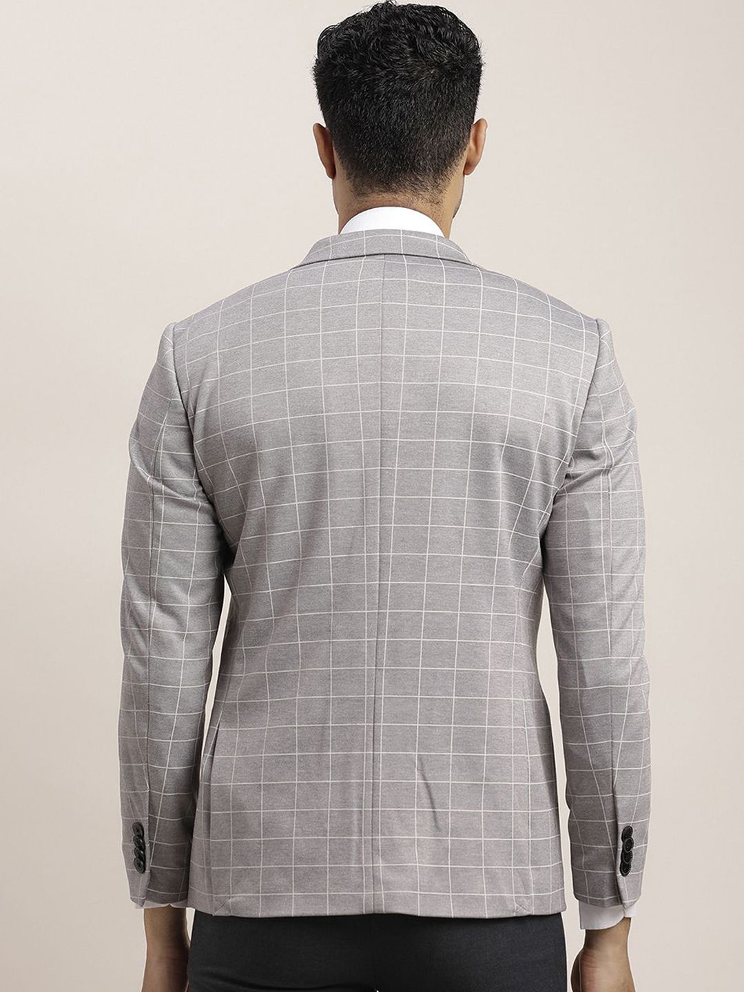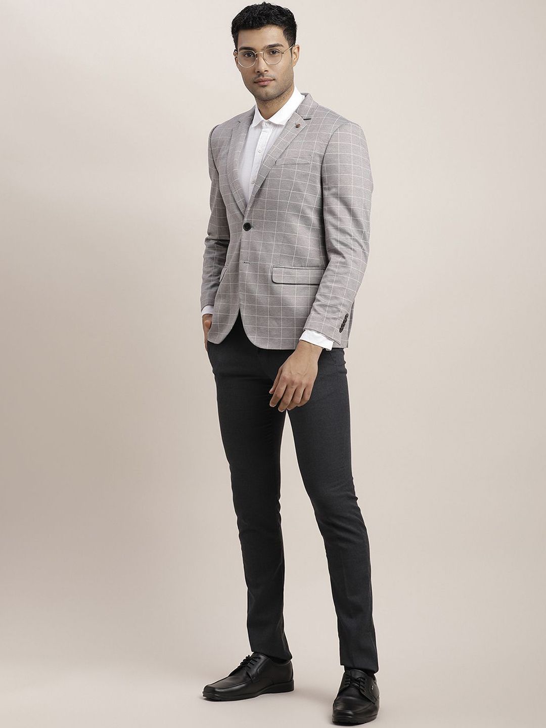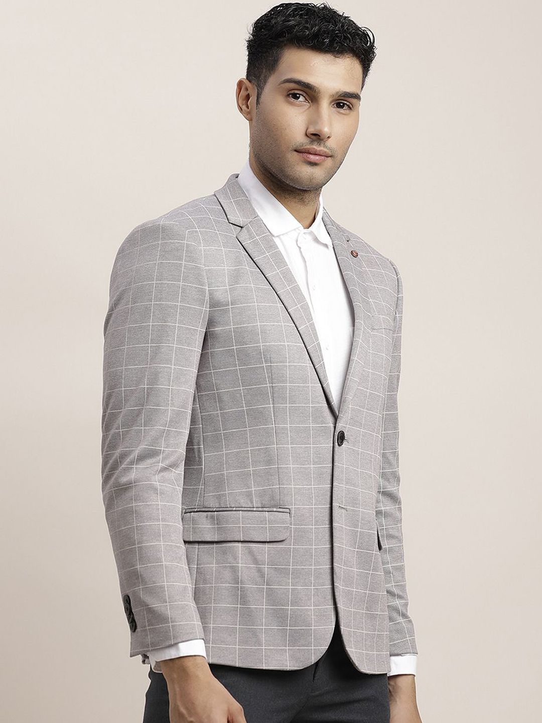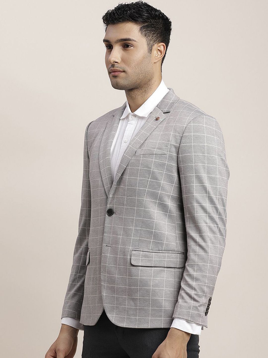 Grey melange checked regular-fit casual blazer, has a notched lapel, single-breasted with double button closures, long sleeves, three pockets