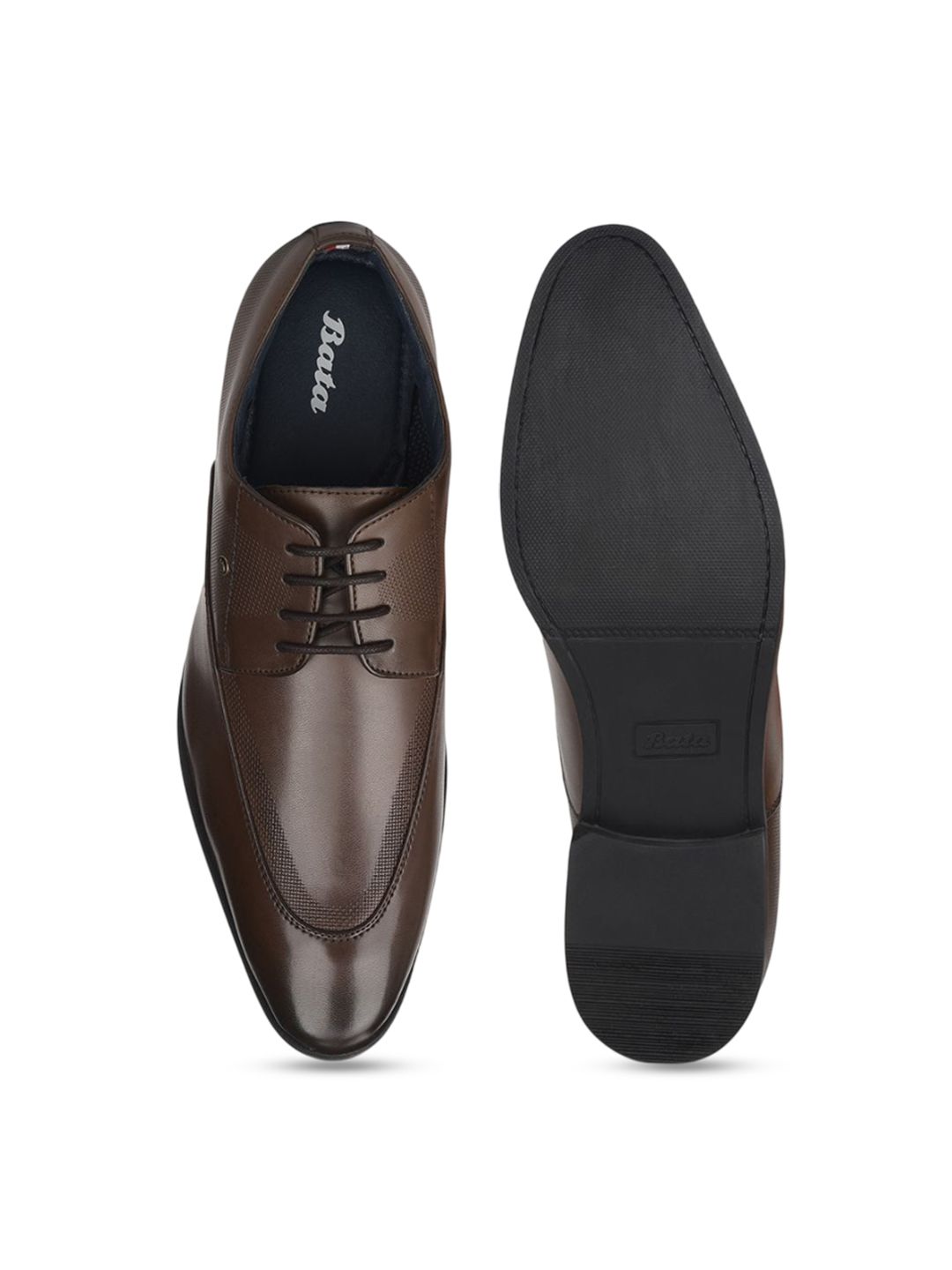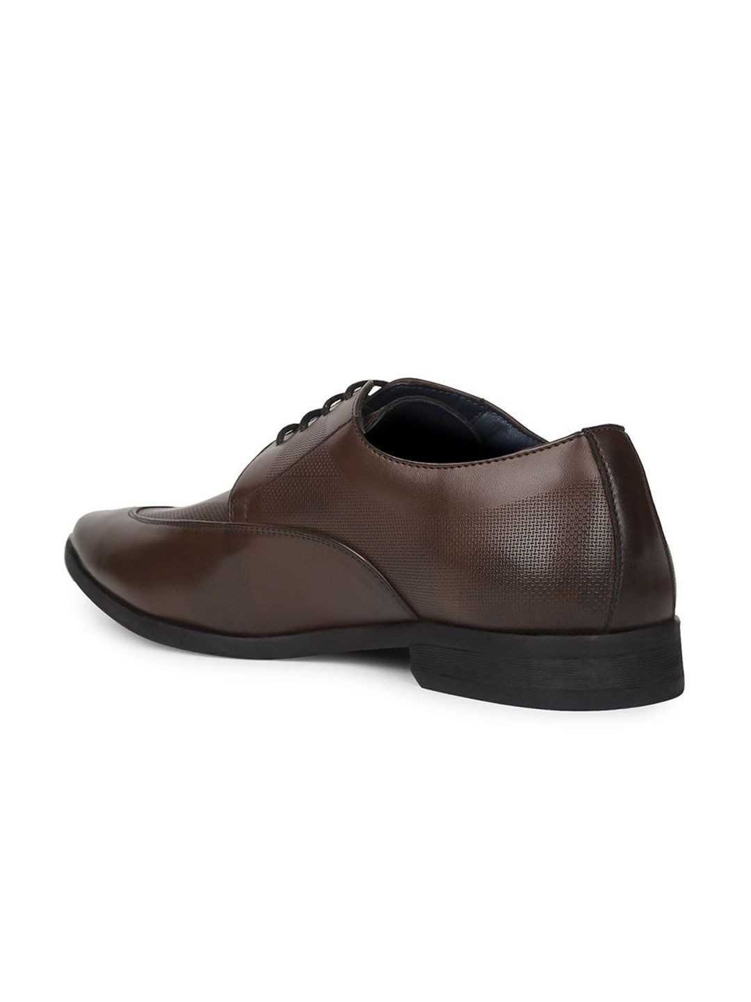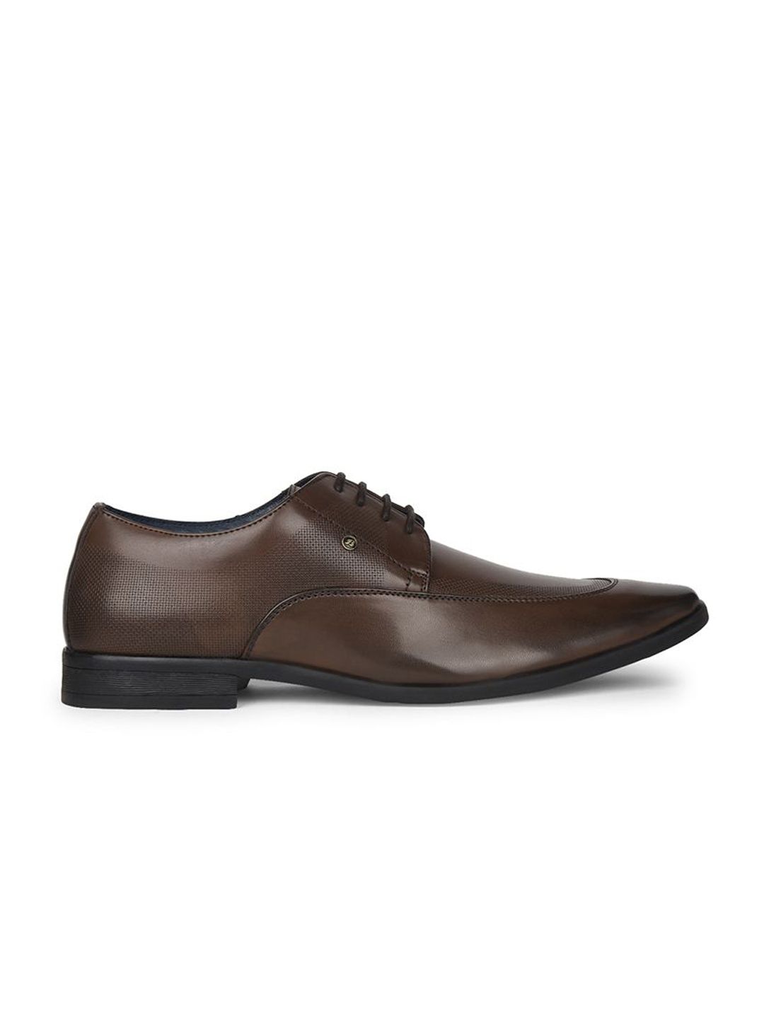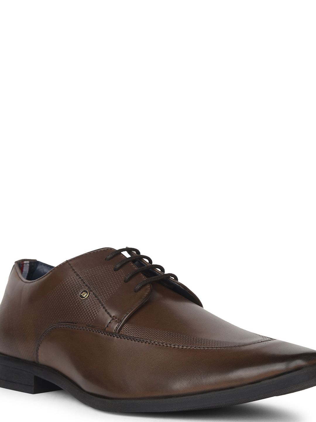 A pair of brown solid round-toe formal derbys with regular styling has a lace-up closureSynthetic Leather upperCushioned footbedTextured and patterned TPR outsole