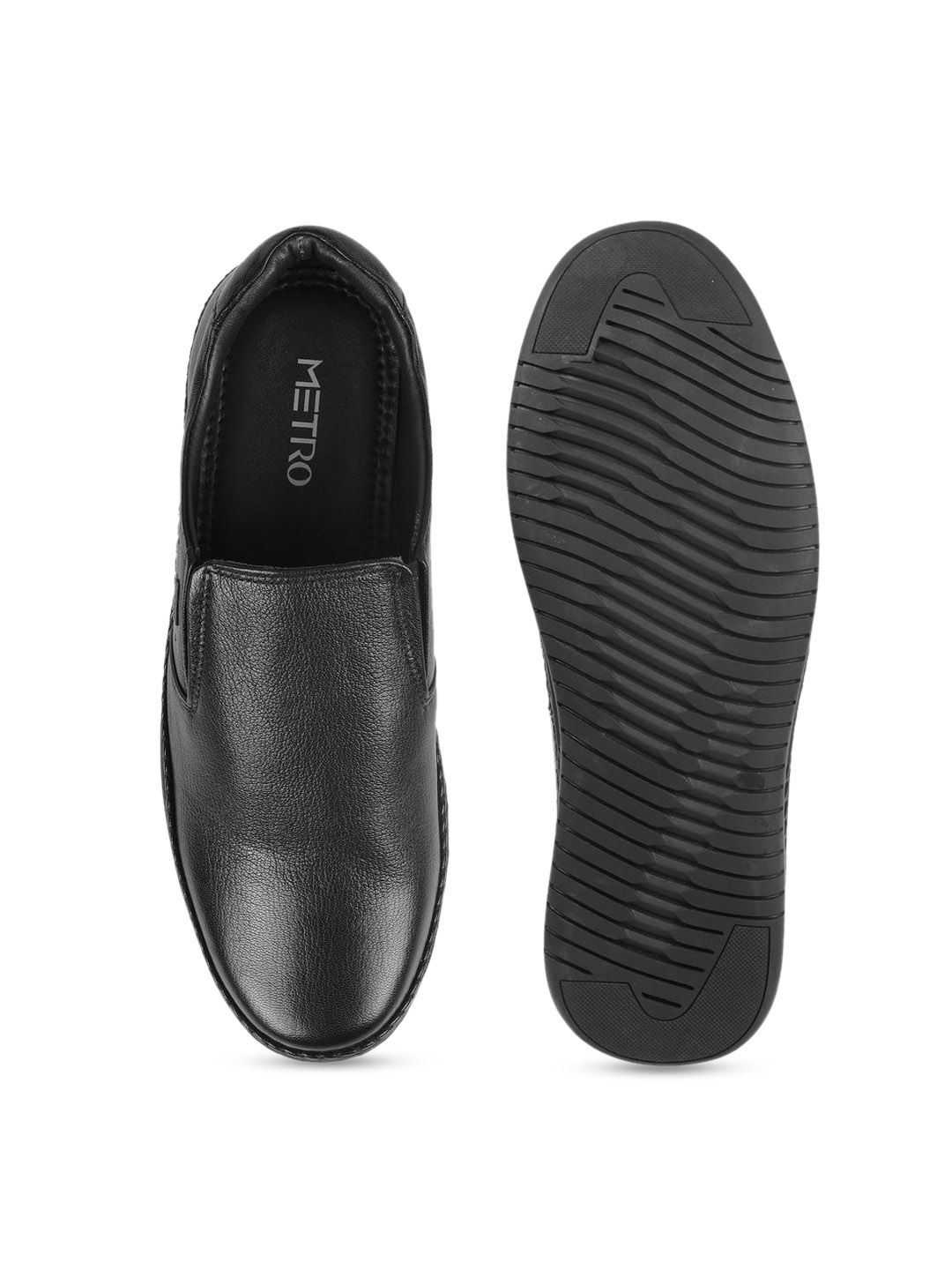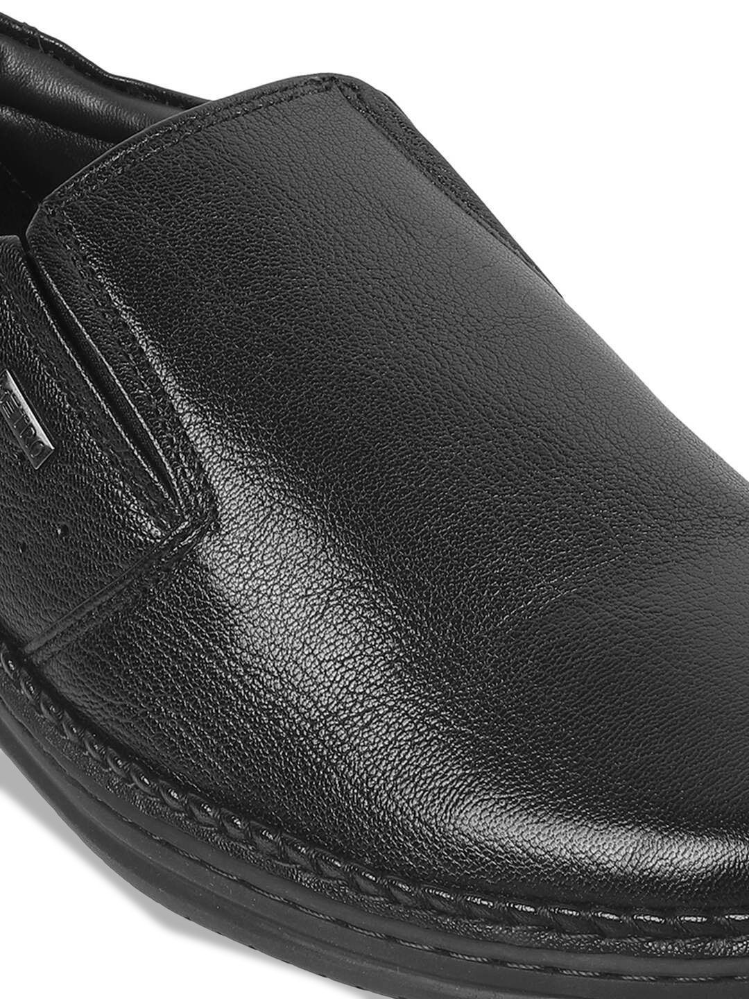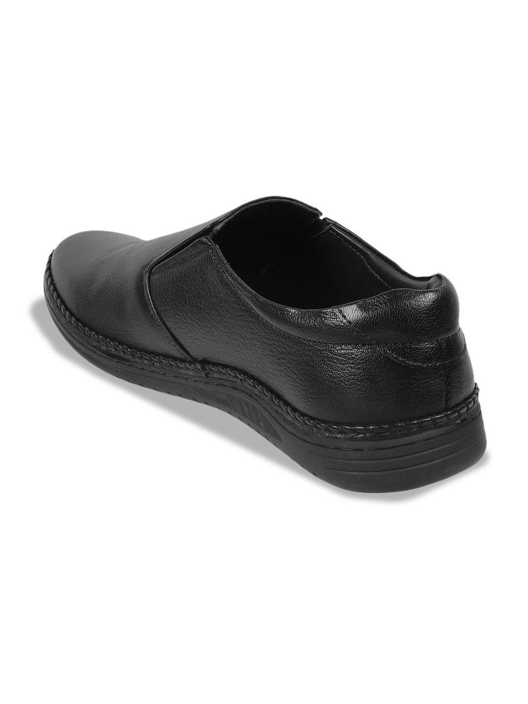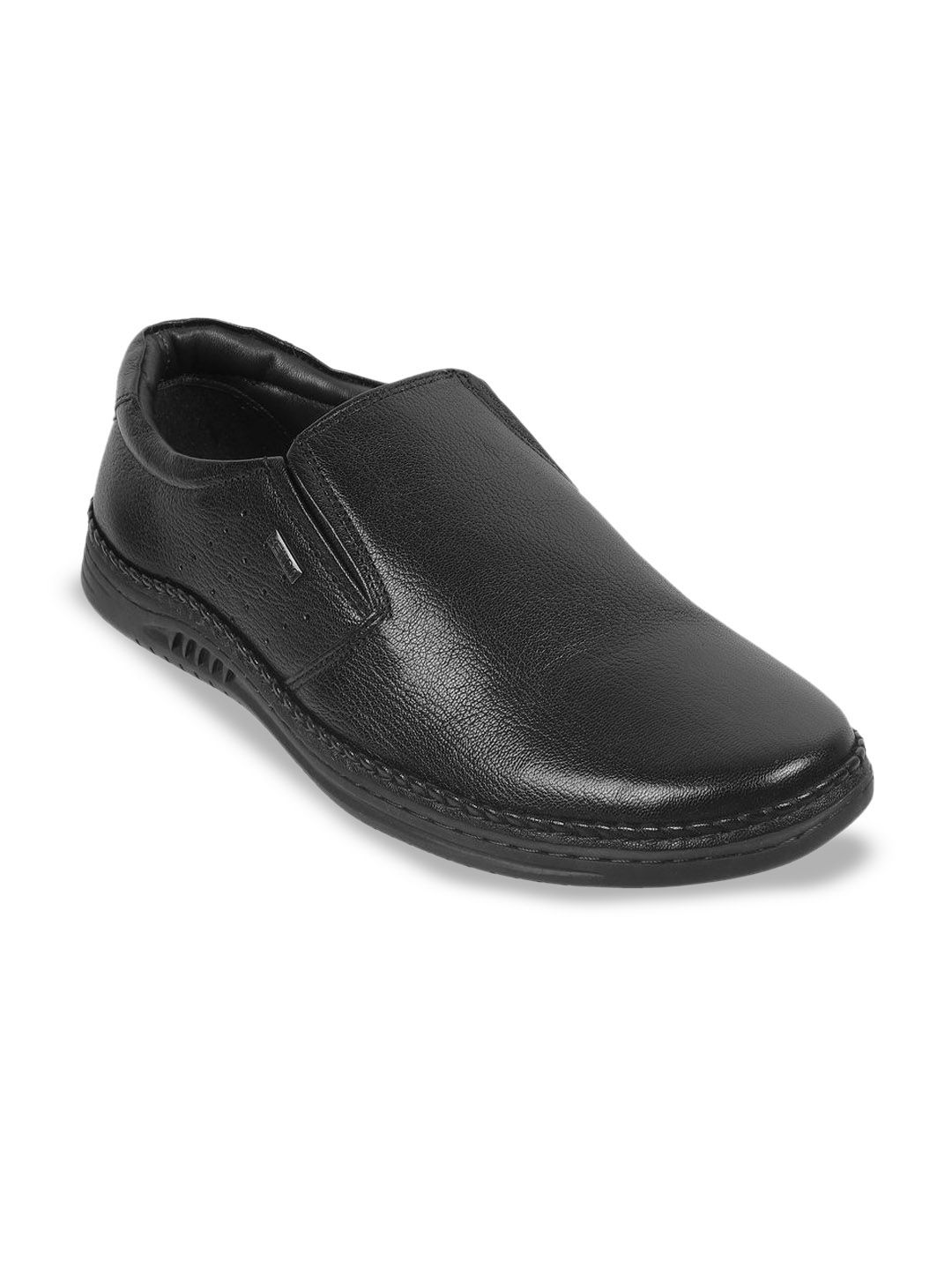 A pair of black solid round-toe formal slip-ons with regular styling has a slip-on closureLeather upperCushioned foot bedTextured and patterned Rubber outsoleWarranty: 1 MonthsWarranty provided by brand/manufacturer