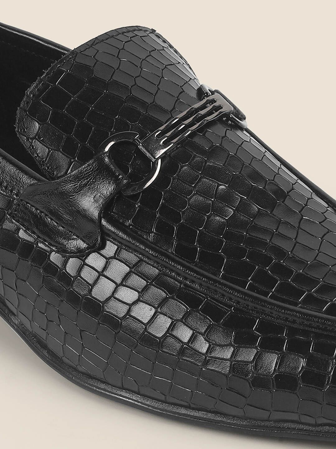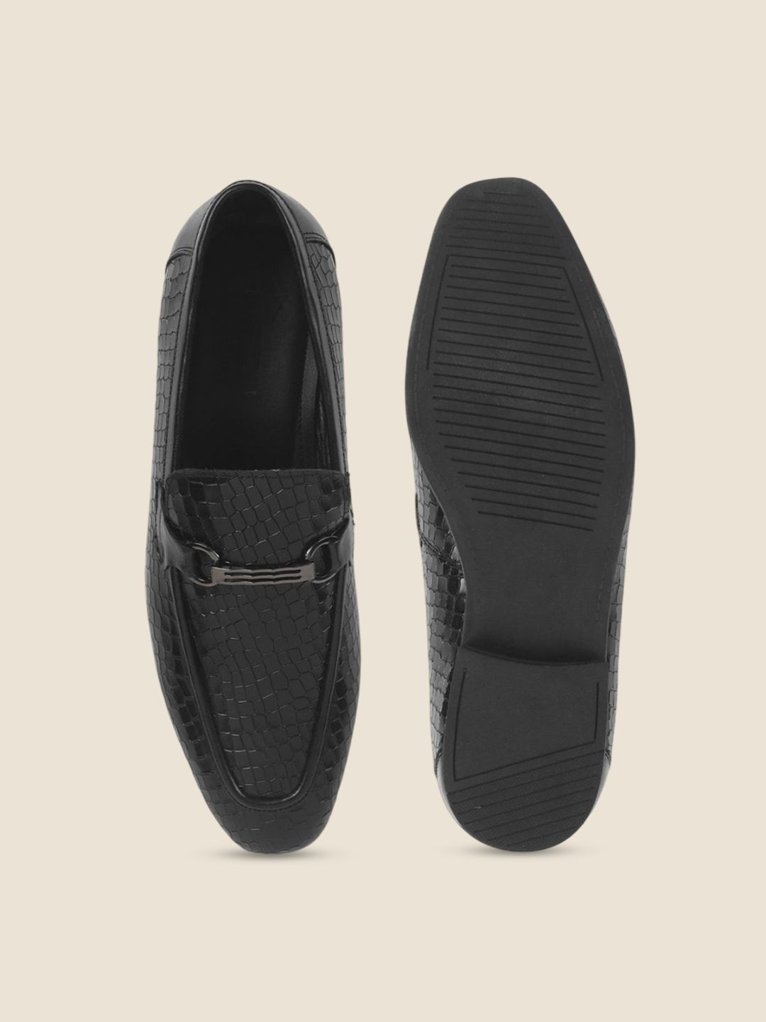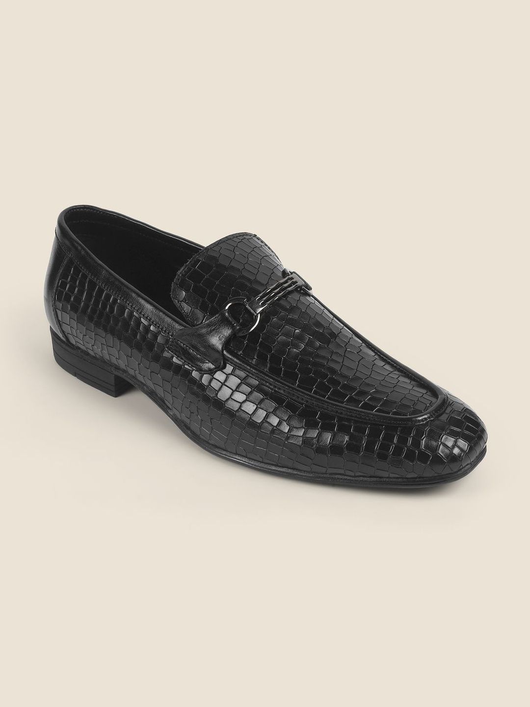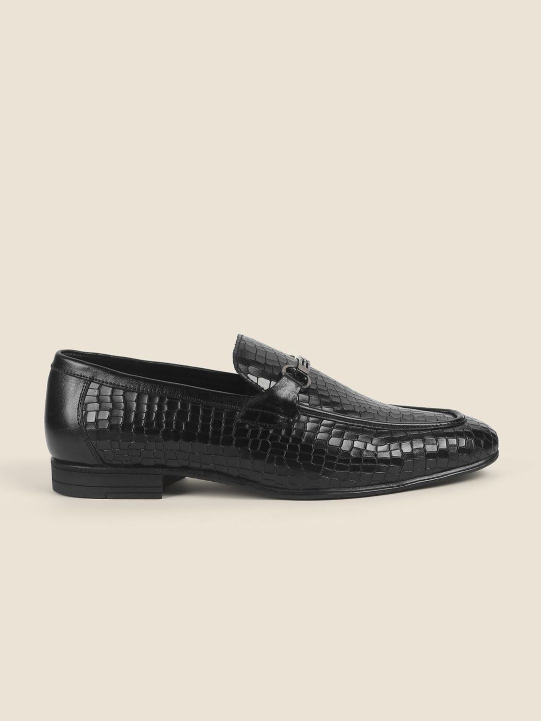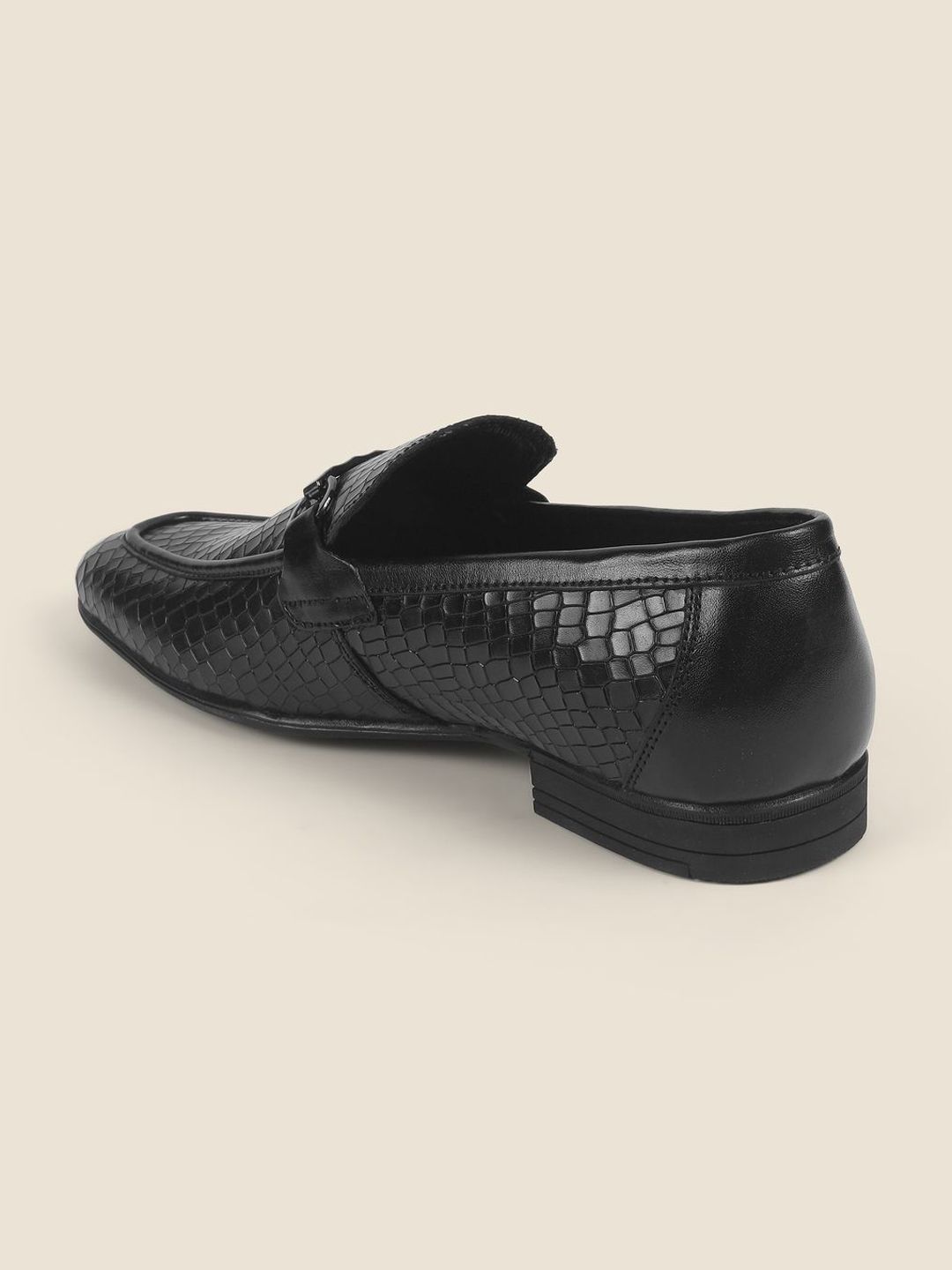 A pair of black textured round-toe formal loafers with regular styling has a slip-on closureLeather upperCushioned footbedTextured and patterned TPR outsoleWarranty: 1 MonthsWarranty provided by brand/manufacturer