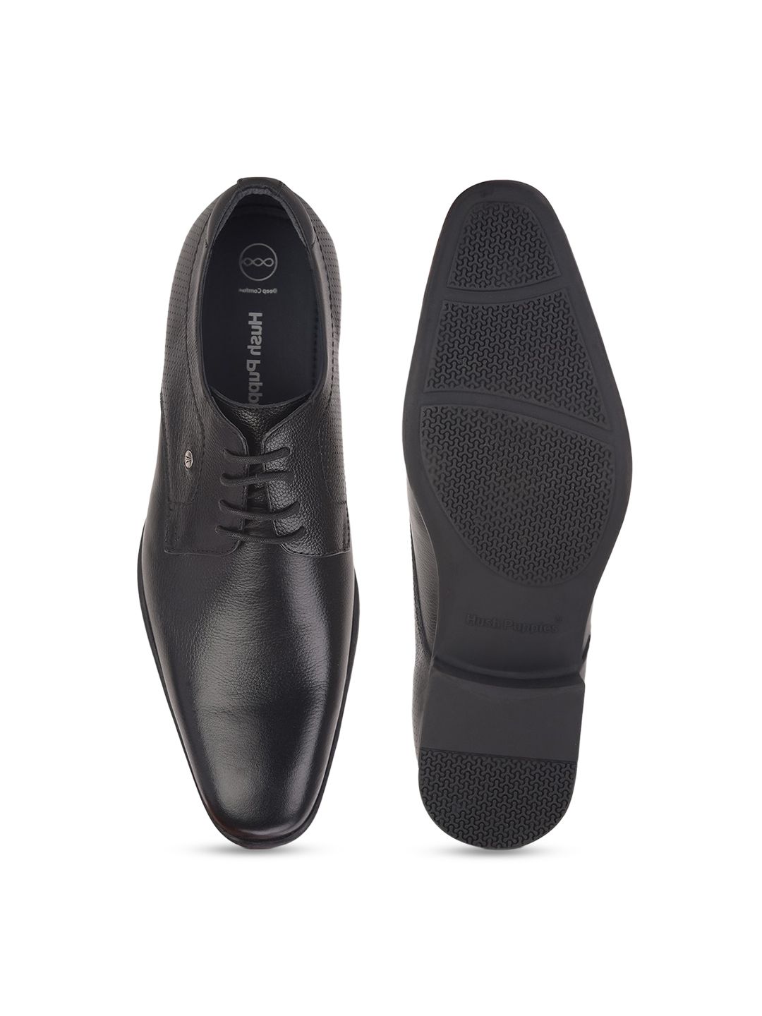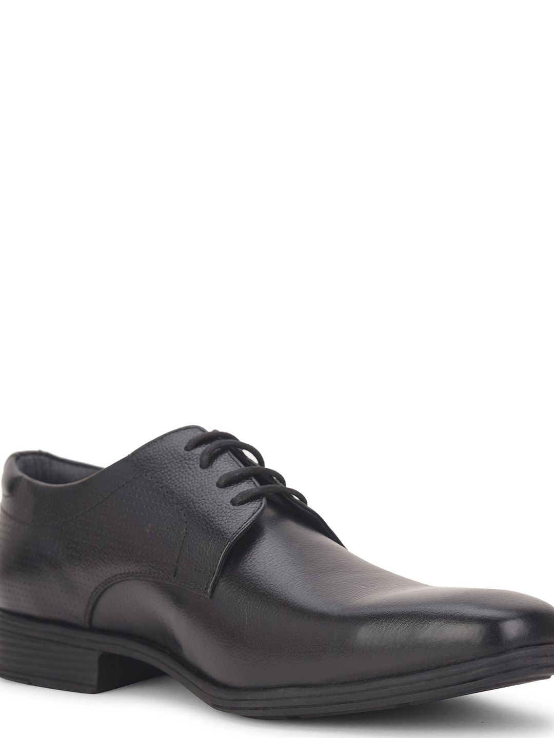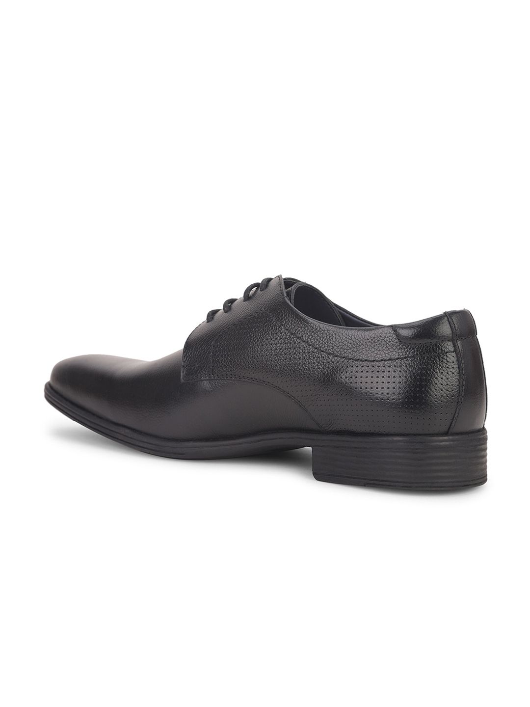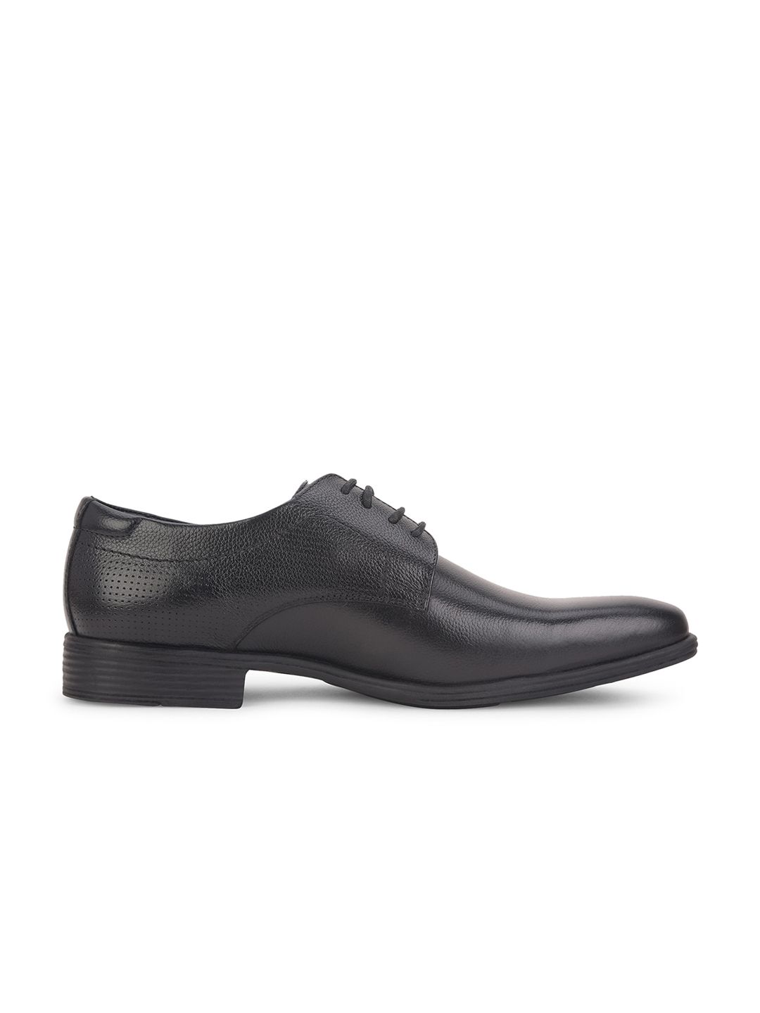A pair of black textured round-toe formal derbys with regular styling has a lace up closureLeather upperCushioned footbedTextured and patterned TPR outsole