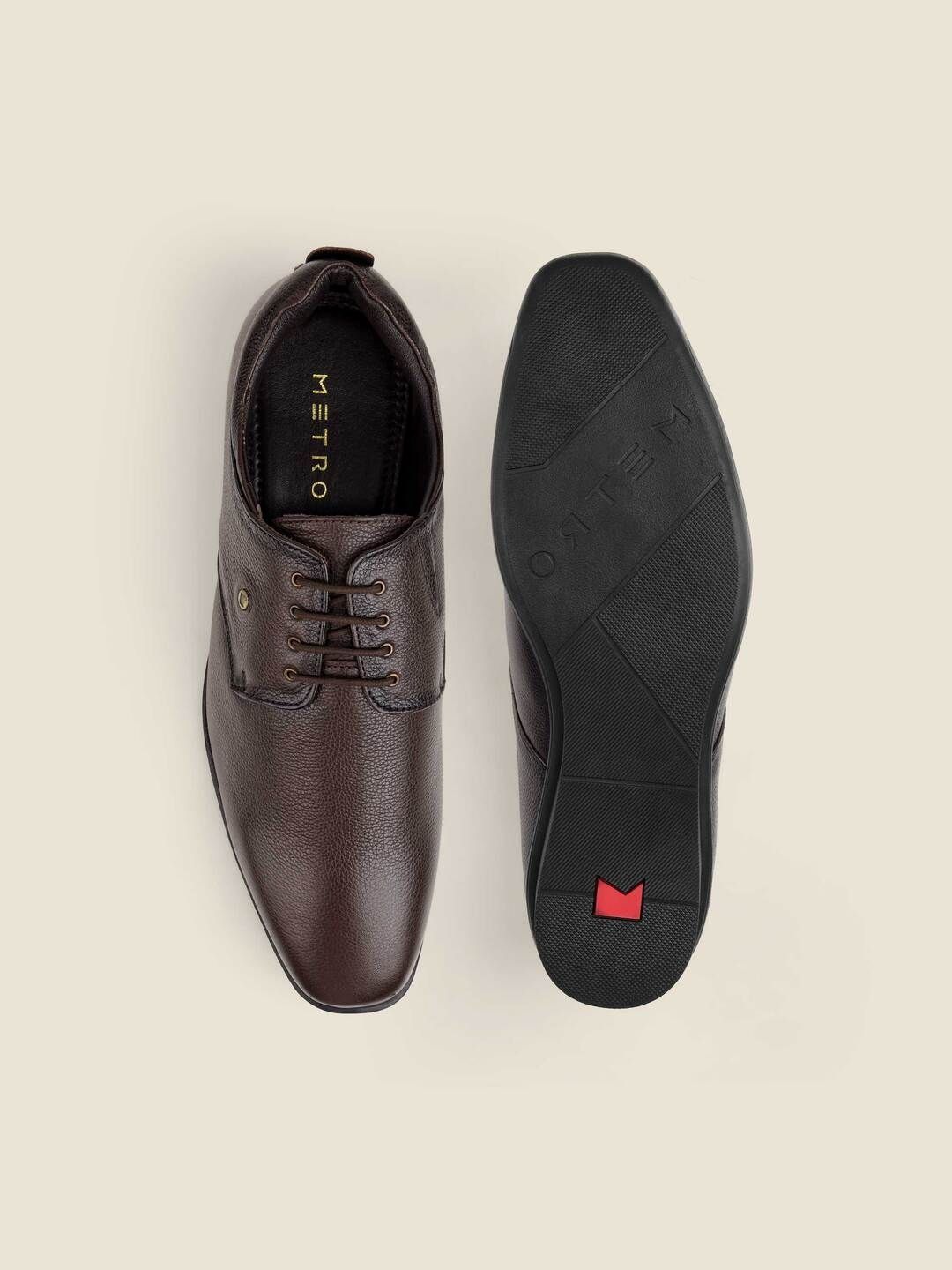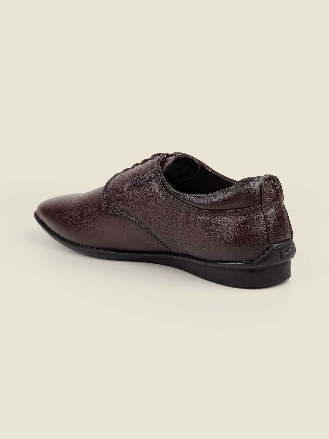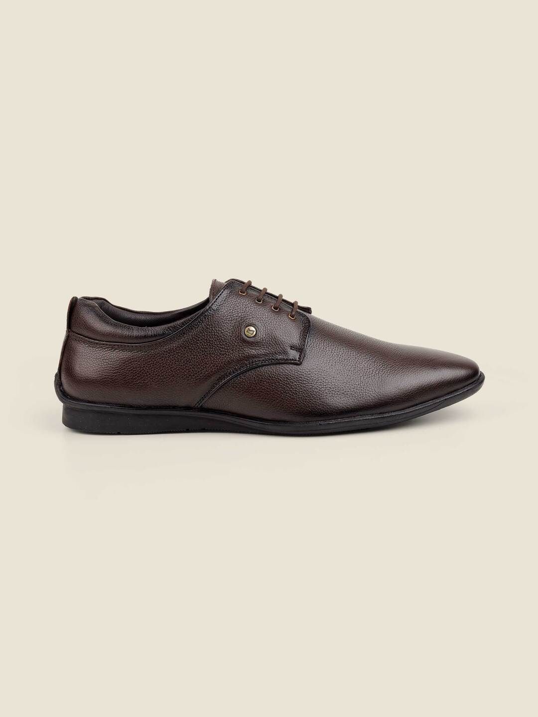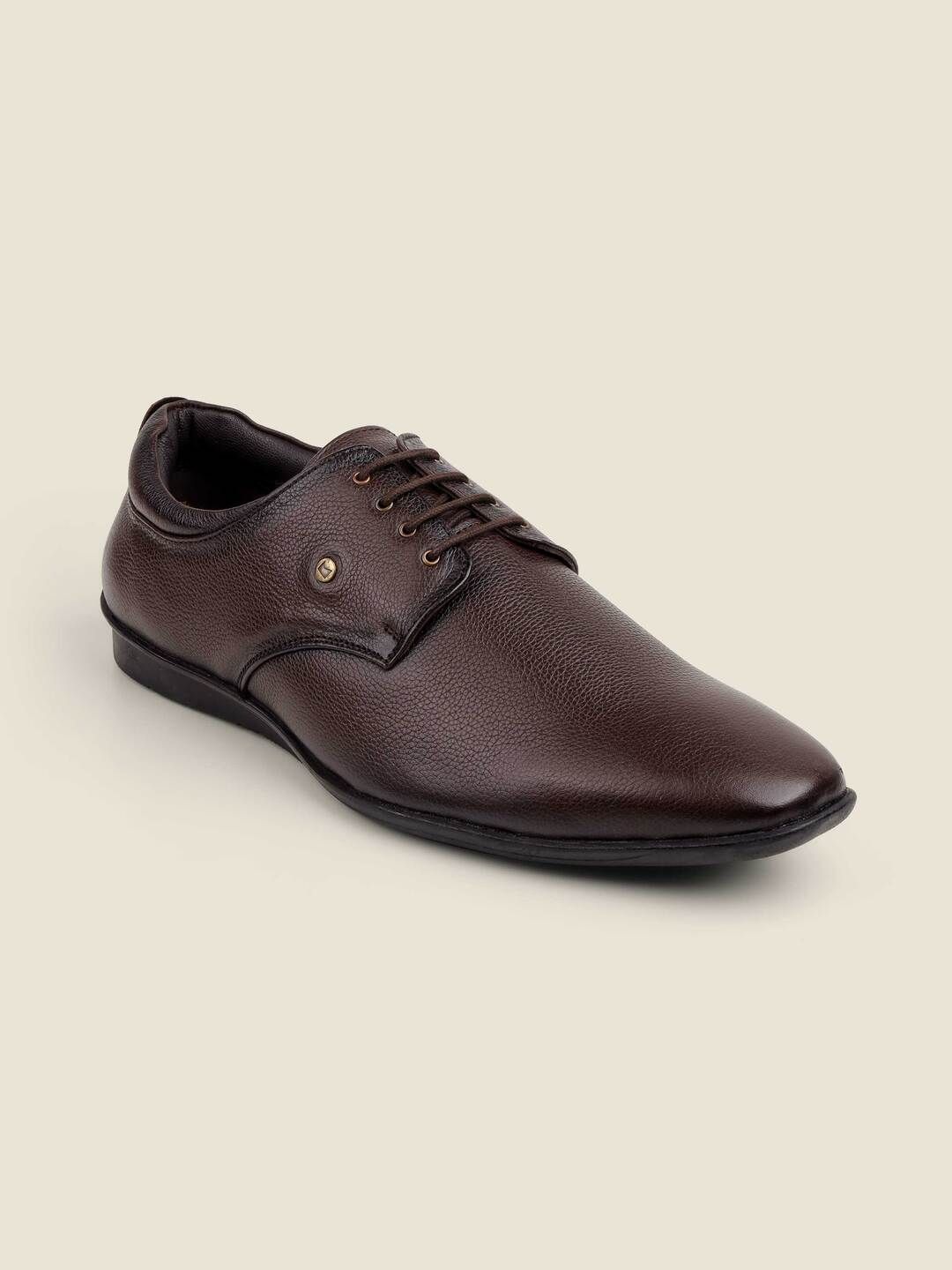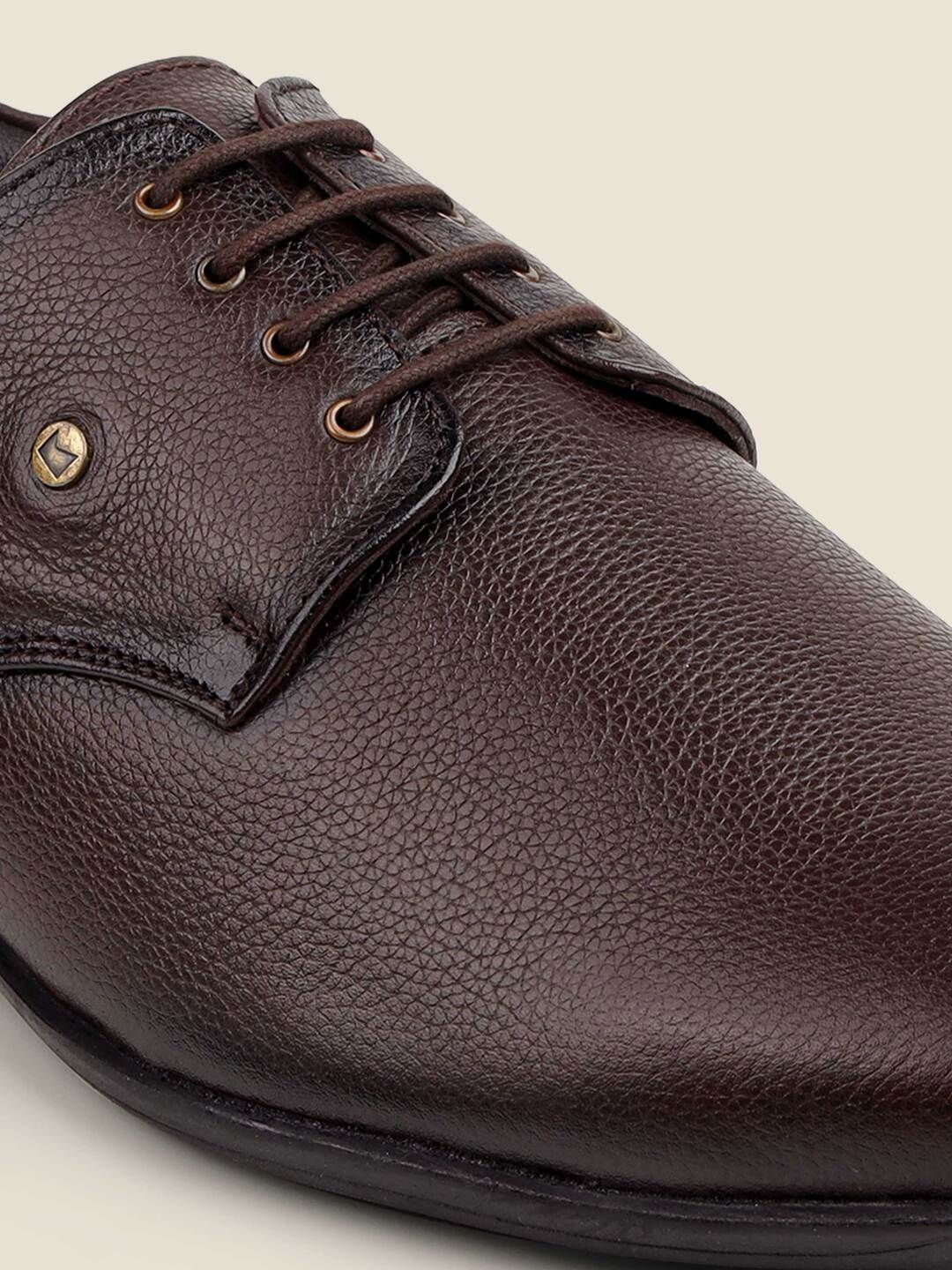 A pair of brown textured round-toe formal derbys with regular styling has a lace-up closureLeather upperCushioned footbedTextured and patterned TPR outsoleWarranty: 1 MonthWarranty provided by brand/manufacturer