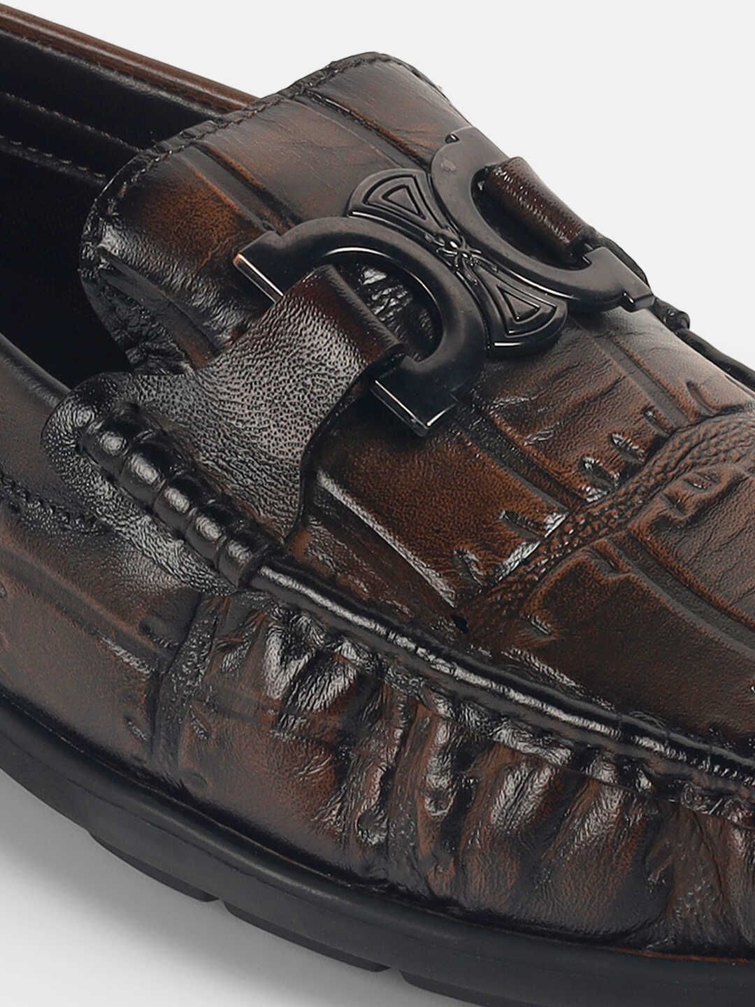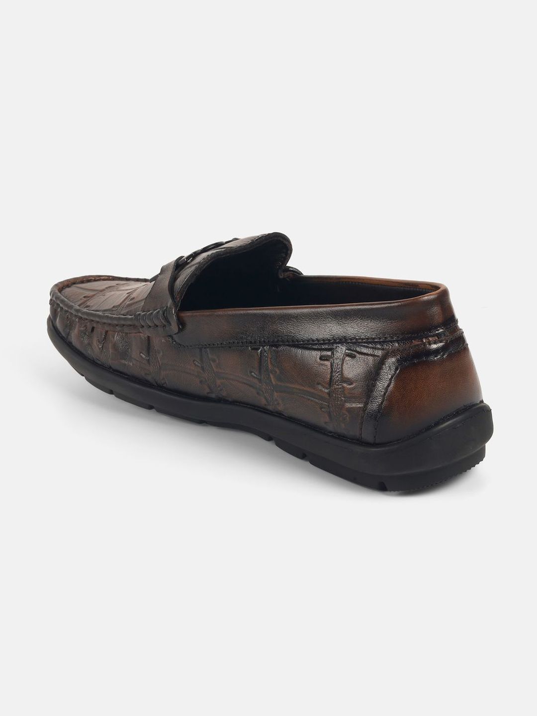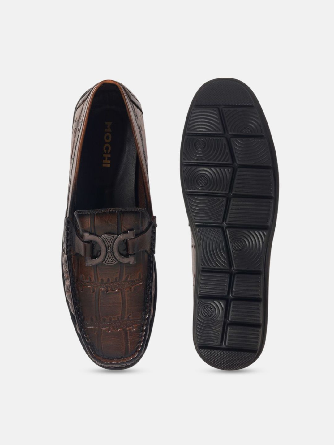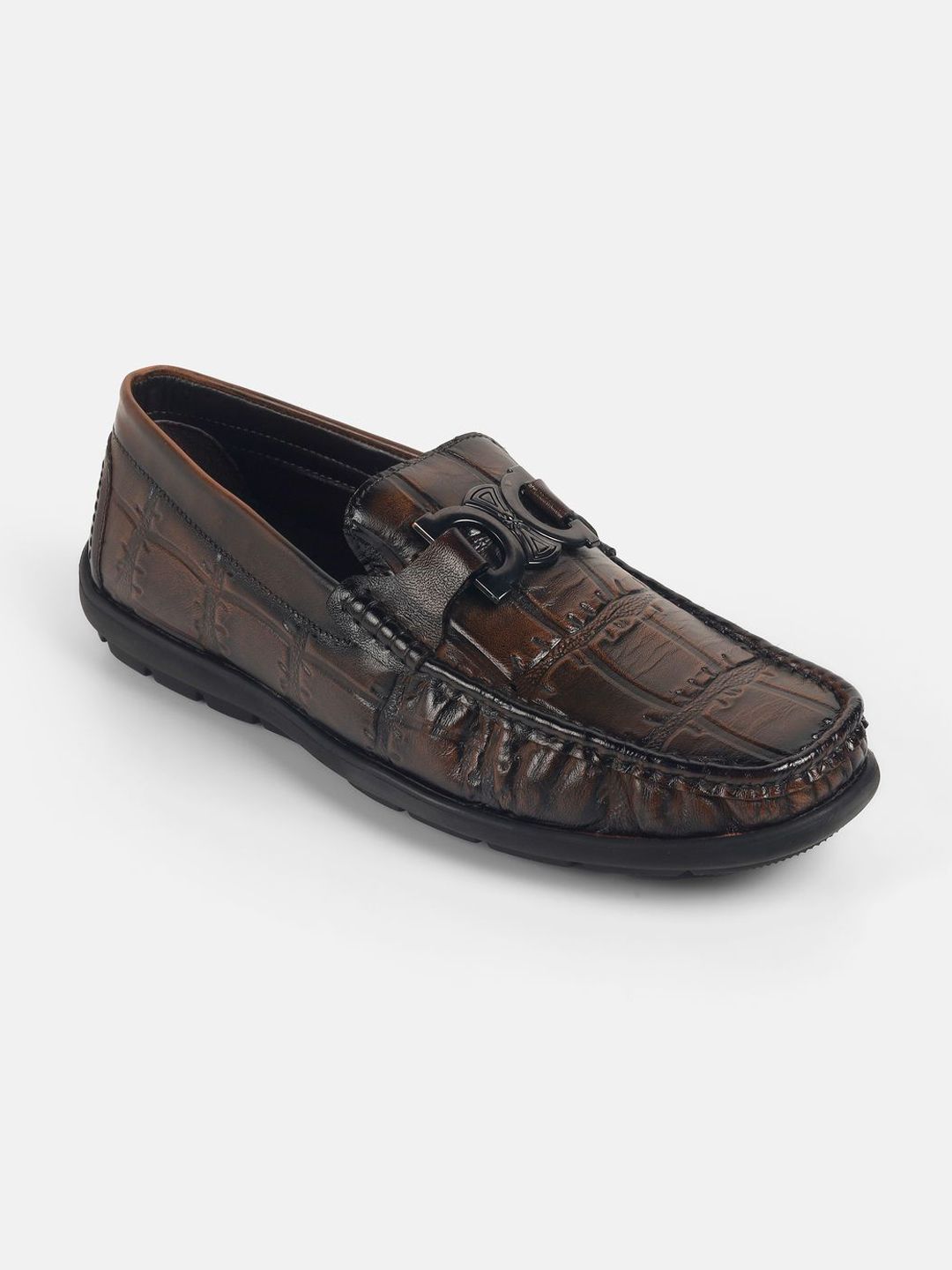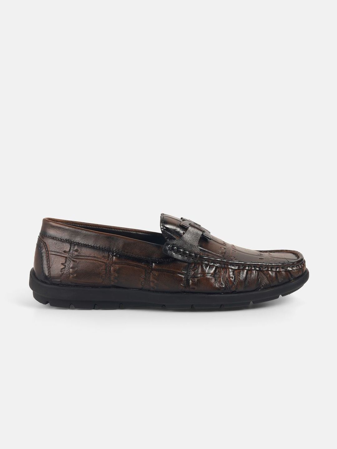 A pair of brown textured round-toe formal loafers with regular styling has a slip-on closureLeather upperCushioned footbedTextured and patterned TPR outsoleWarranty: 1 MonthWarranty provided by brand/manufacturer