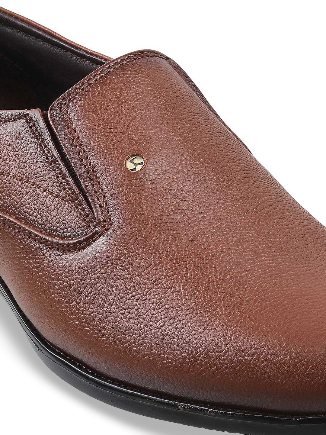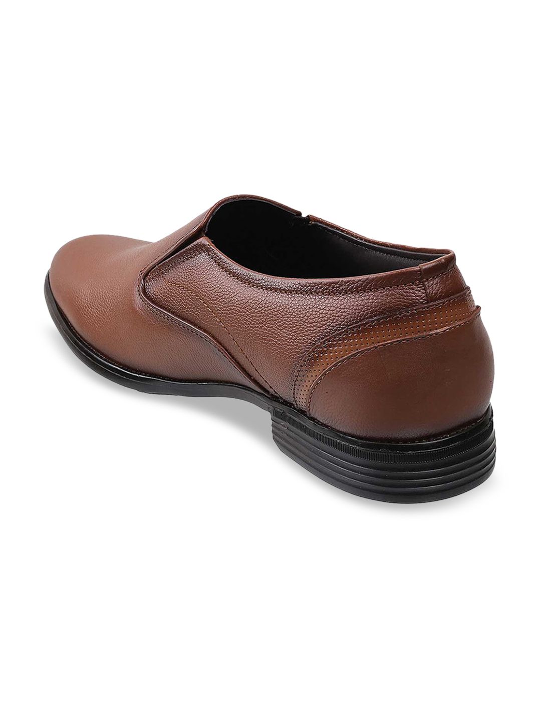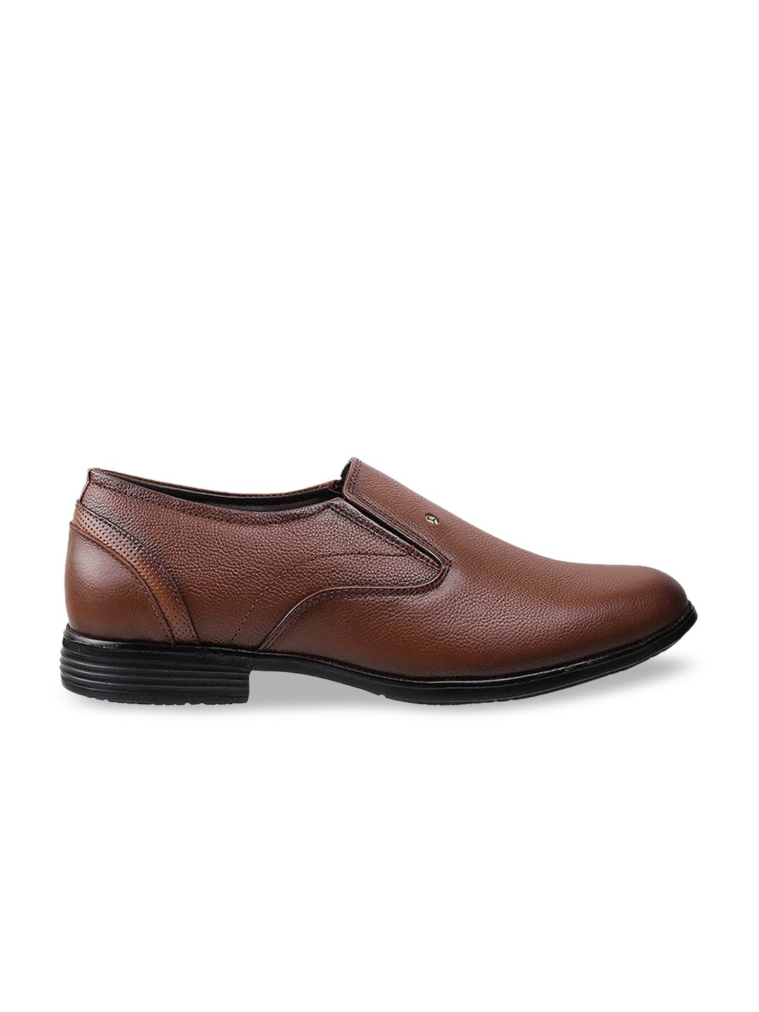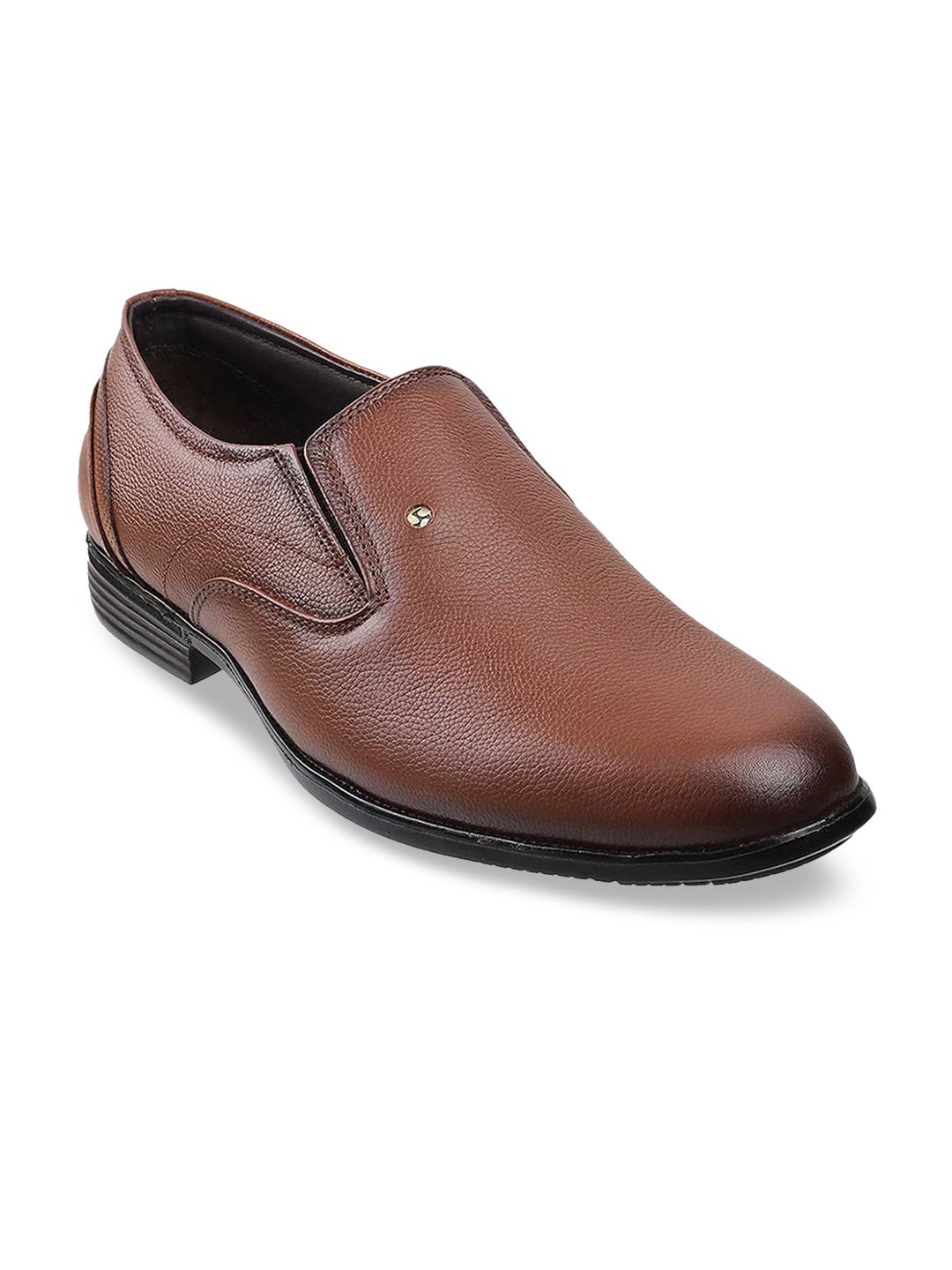 A pair of brown solid square-toe formal slip-ons, has elasticated gussets on both sidesLeather upper, has a regular stylingCushioned footbedTextured PU outsole, has a stacked heelWarranty: 1 month against manufacturing defectsWarranty provided by the brand owner / manufacturer