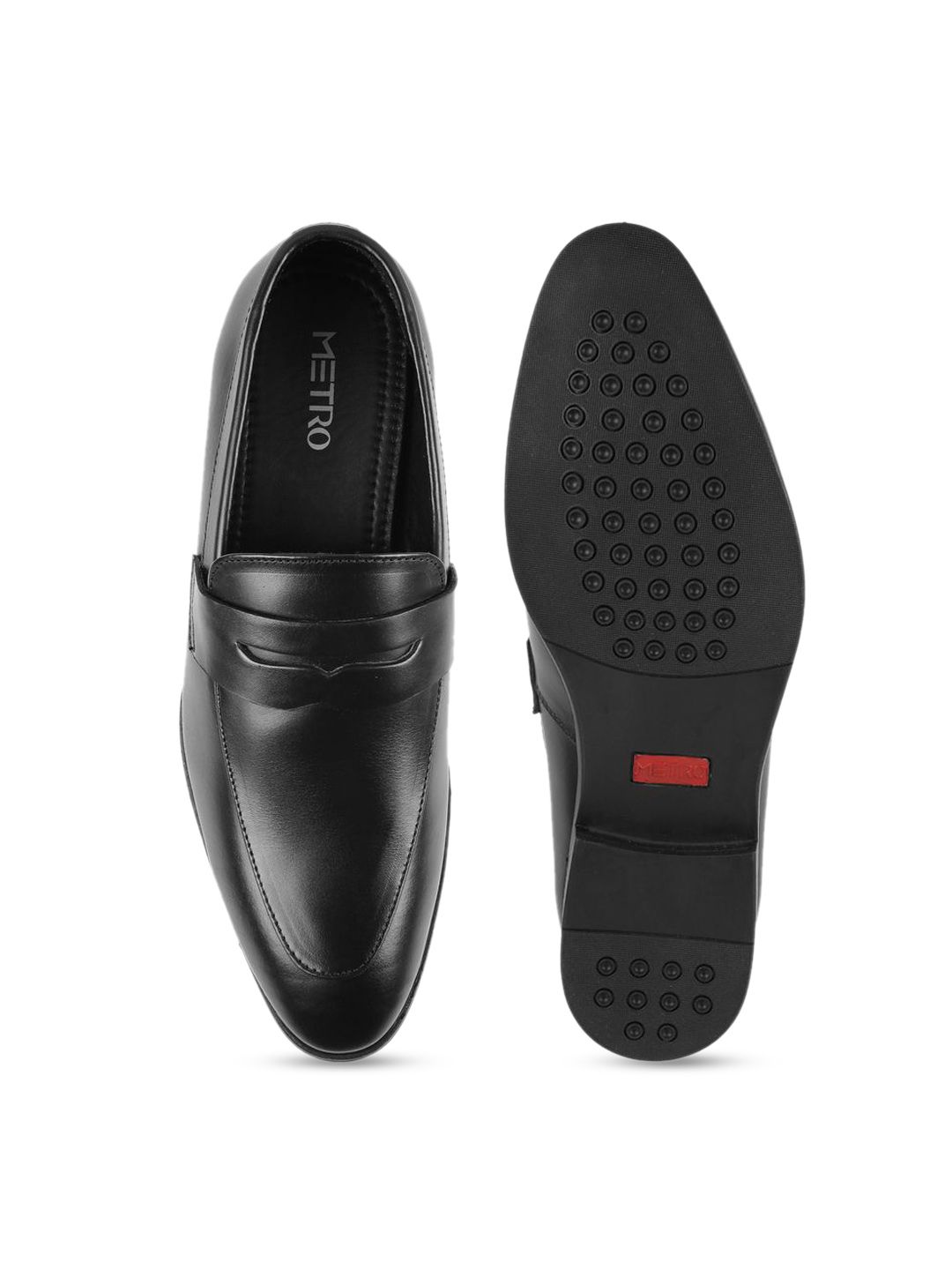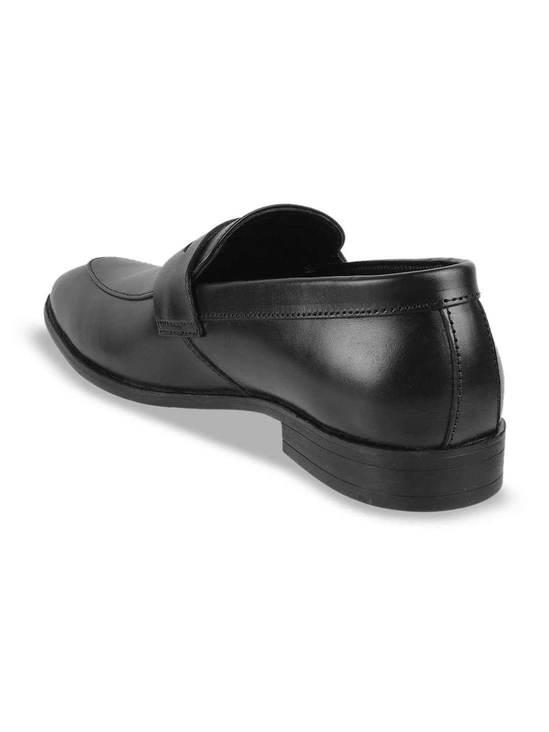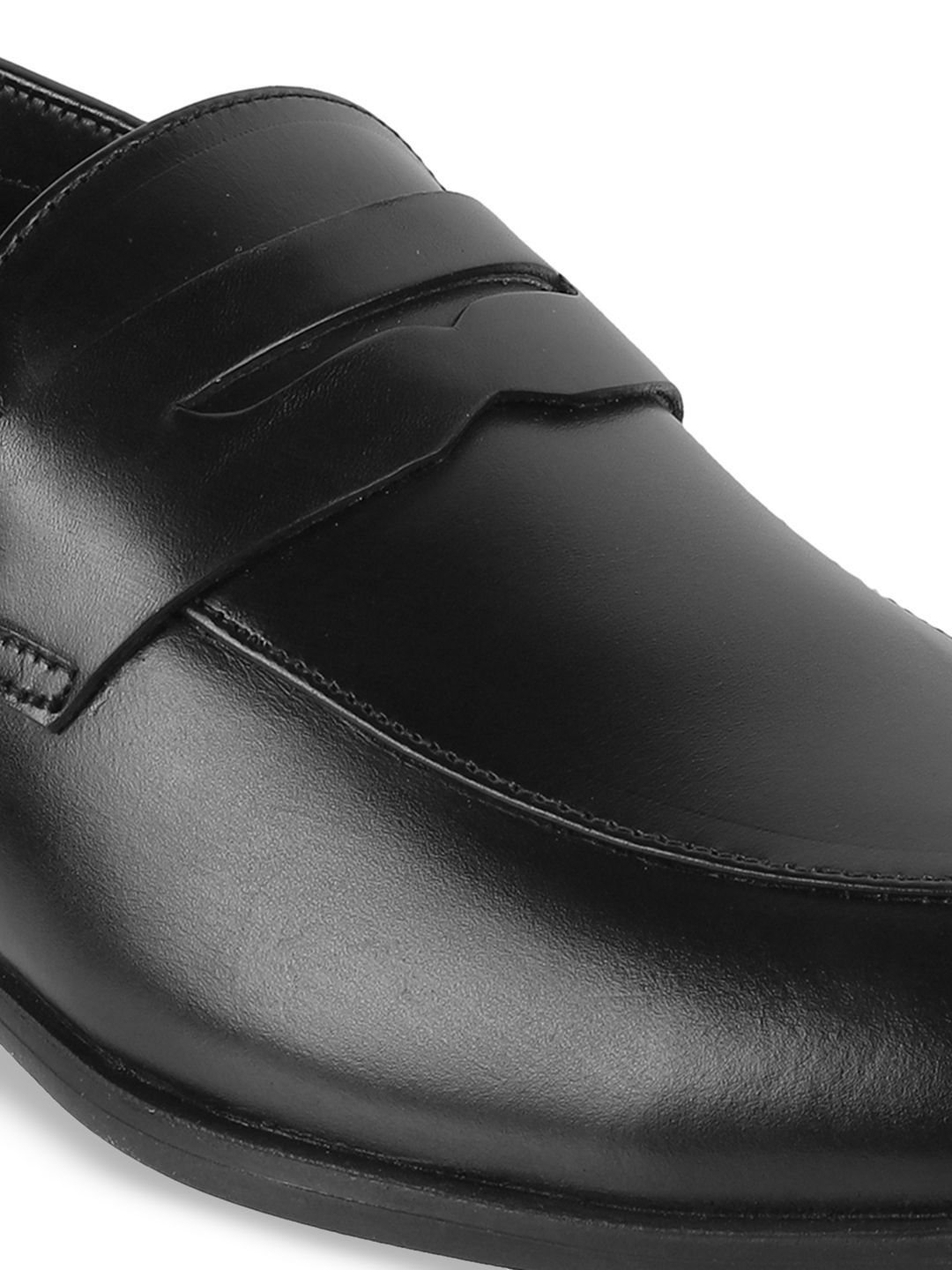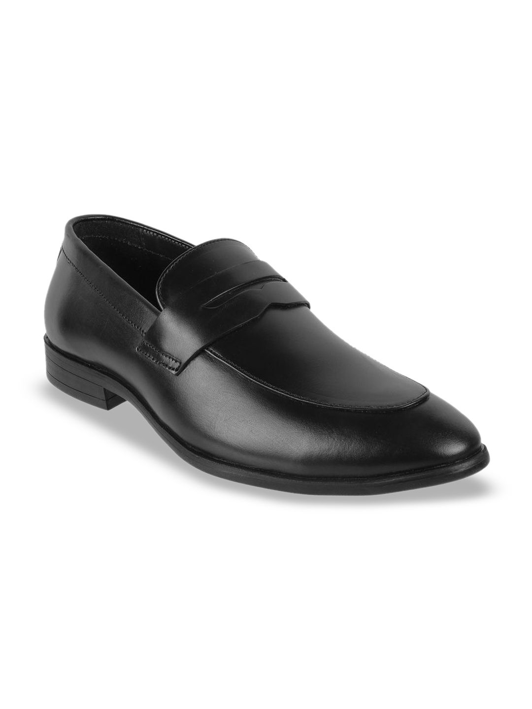 A pair of black solid round-toe formal slip-ons with regular styling has a slip-on closureLeather upperCushioned footbedTextured and patterned PVC outsoleWarranty: 1 MonthsWarranty provided by brand/manufacturer