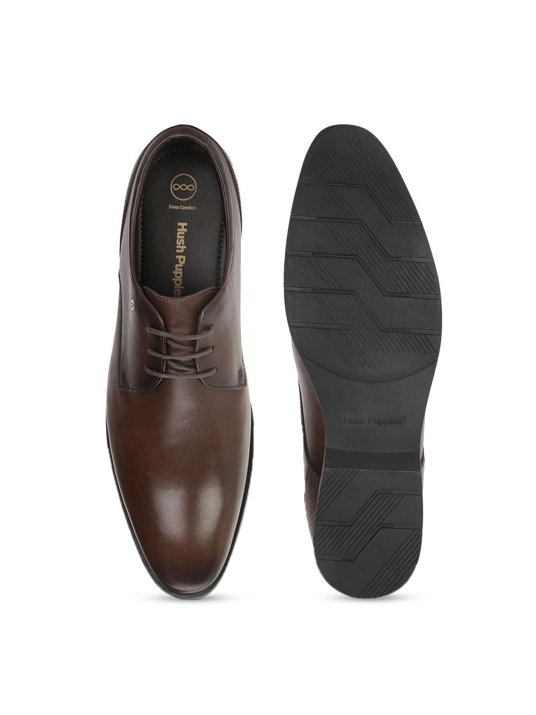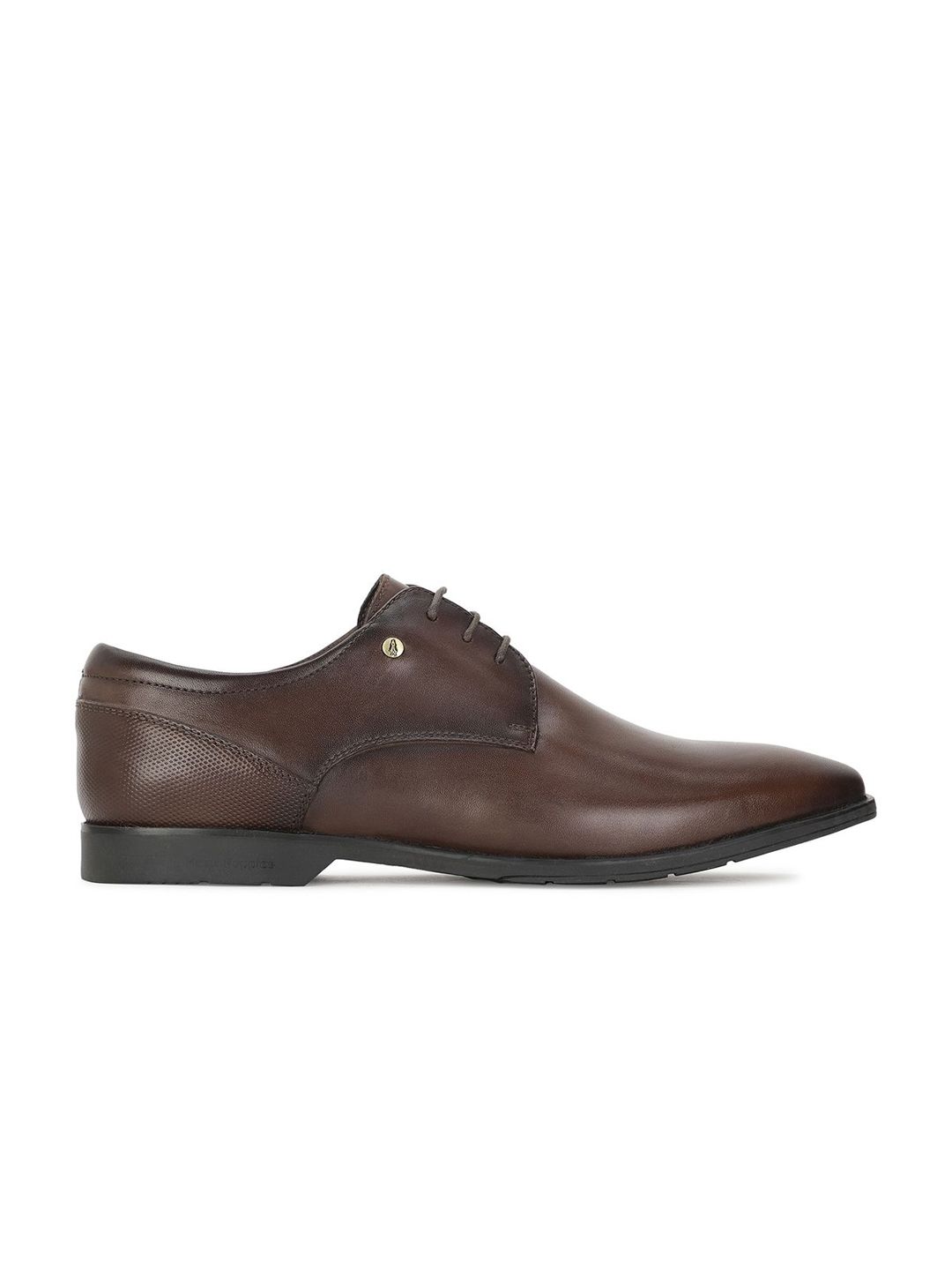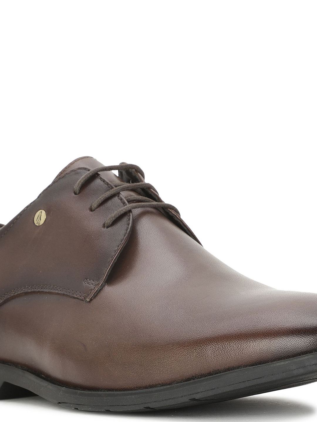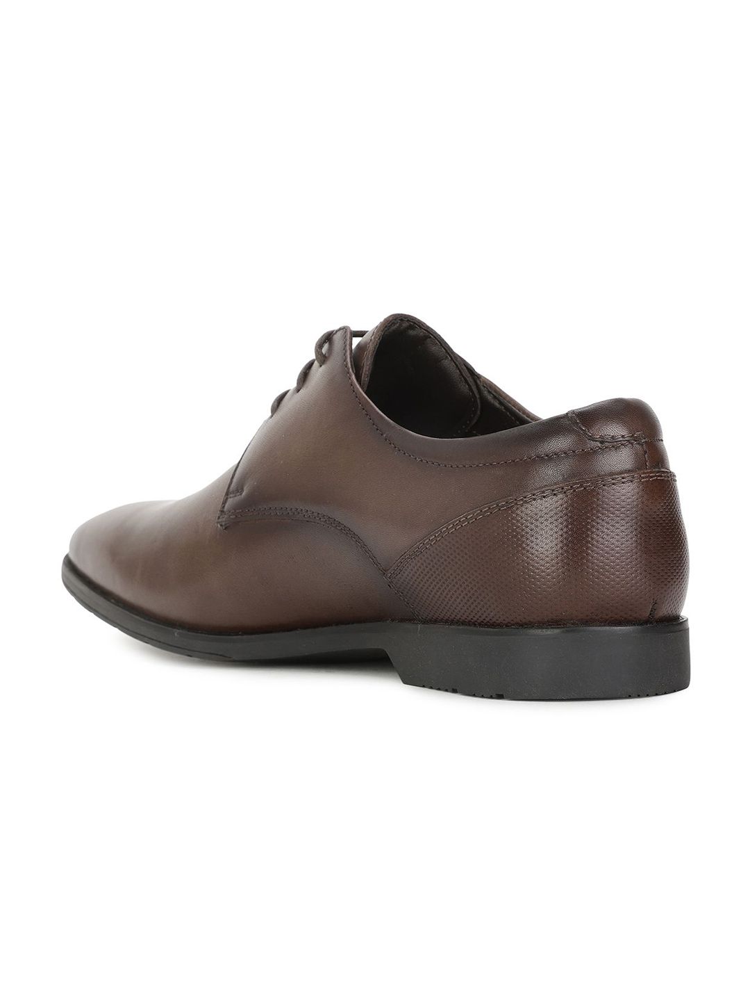 A pair of brown solid round-toe formal derbys with regular styling has a lace-up closureLeather upperCushioned footbedTextured and patterned TPR outsole
