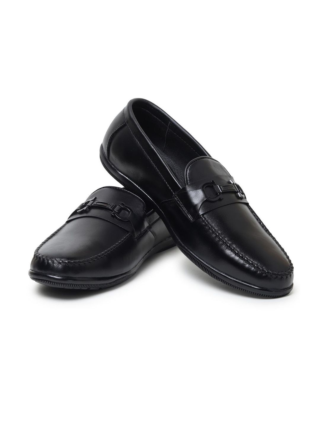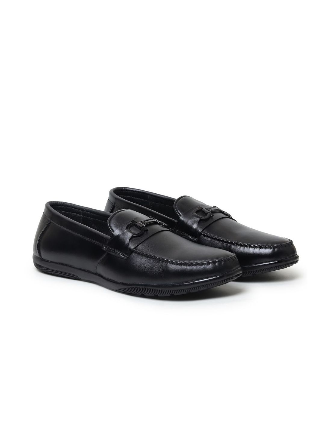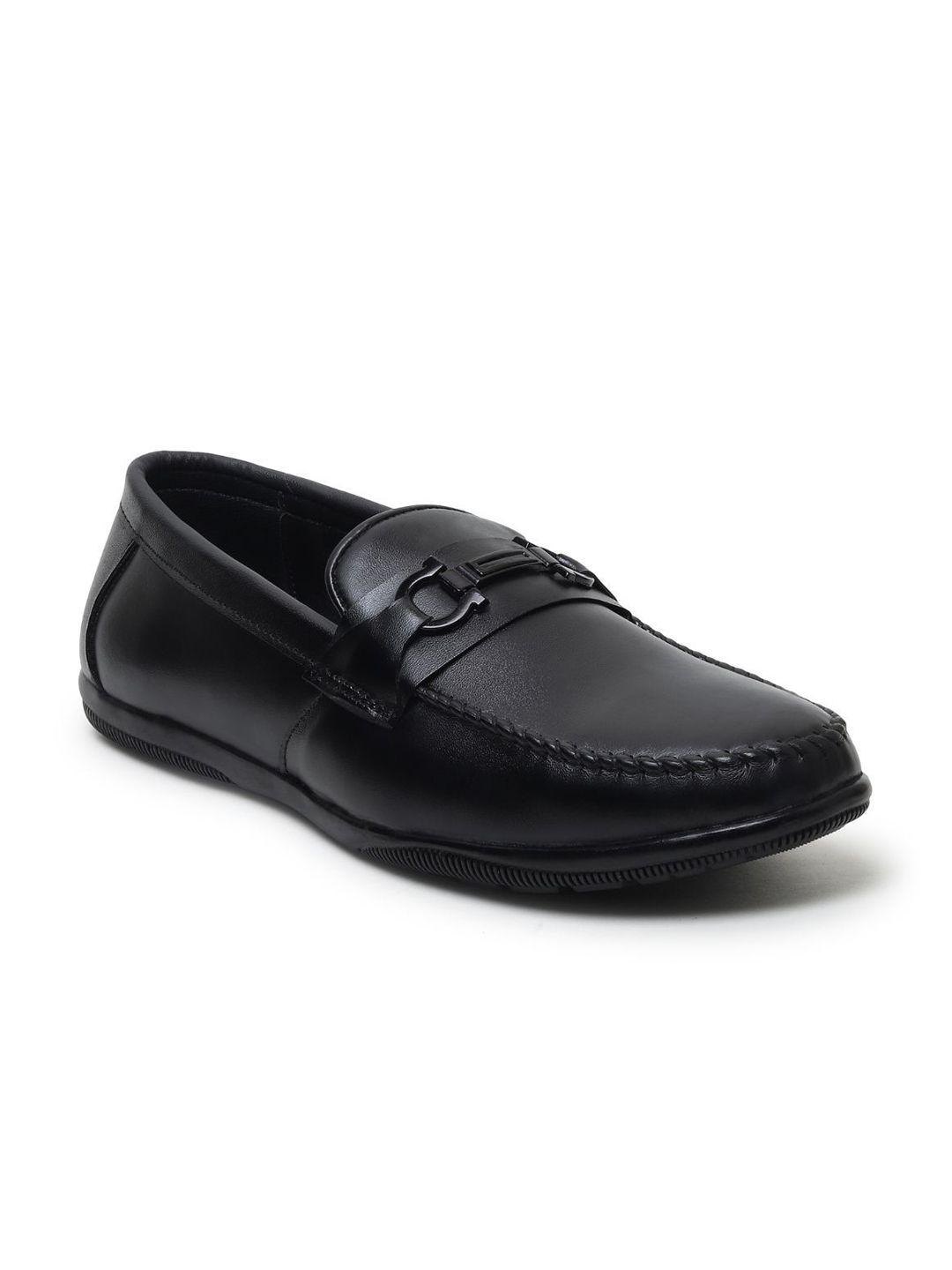 A pair of black solid square-toe formal loafers with regular styling has a slip-on closureLeather upperCushioned footbedTextured and patterned leather outsole