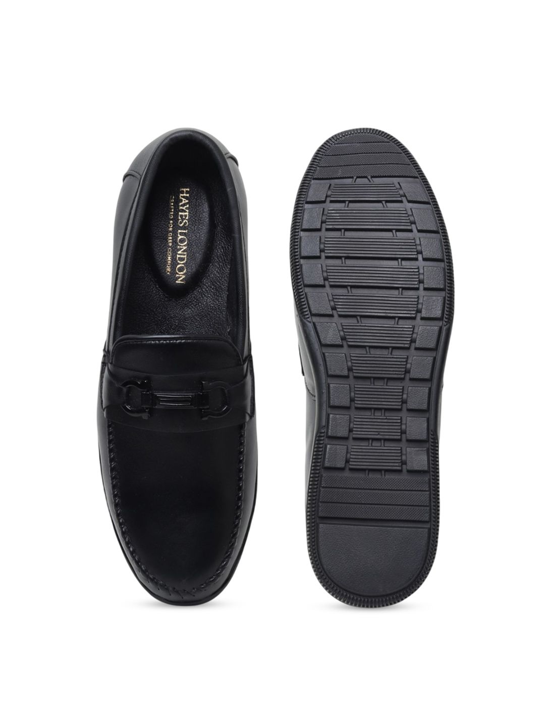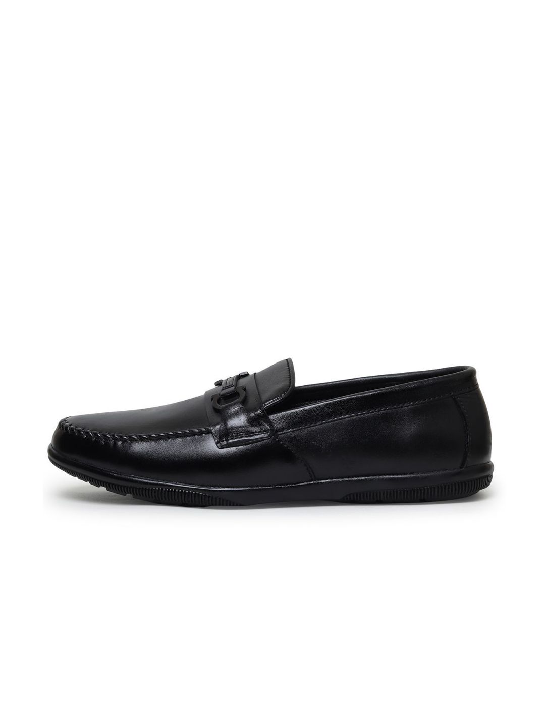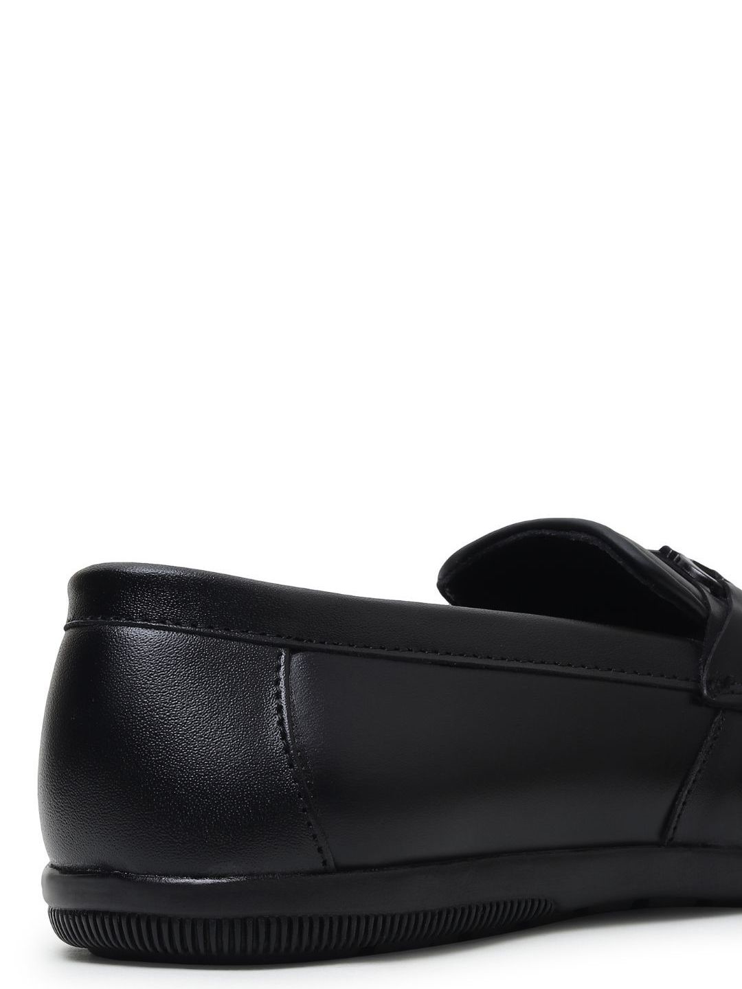 A pair of black solid square-toe formal loafers with regular styling has a slip-on closureLeather upperCushioned footbedTextured and patterned leather outsole