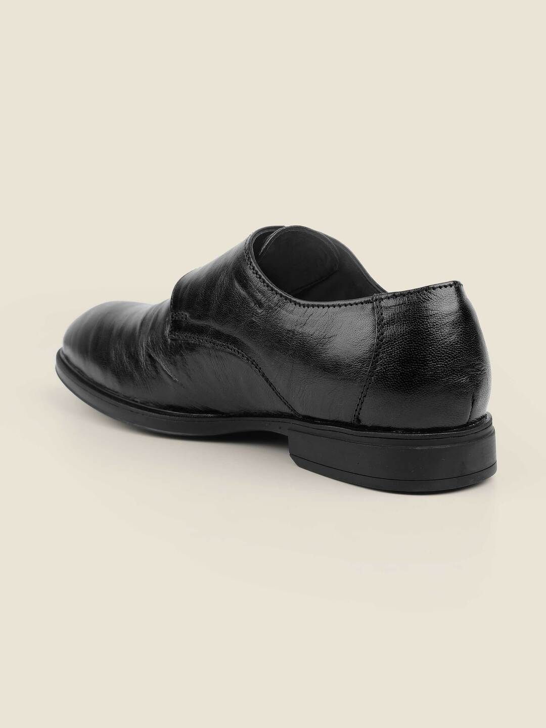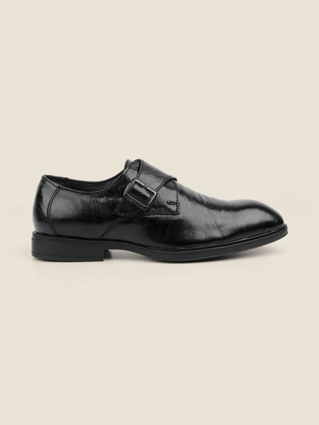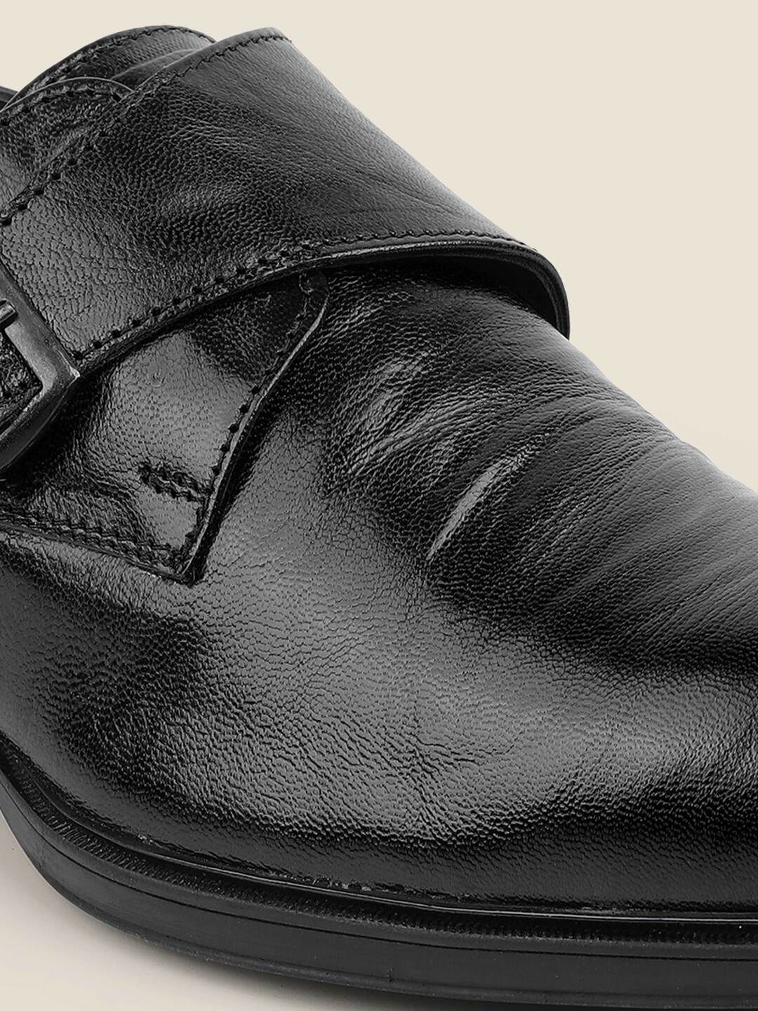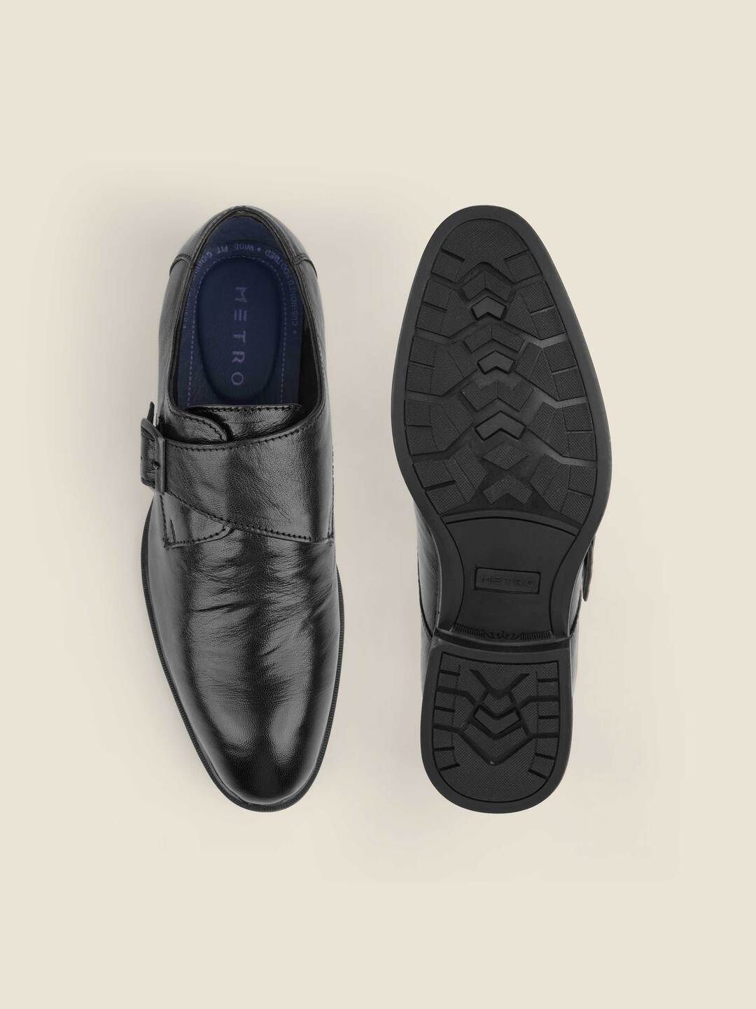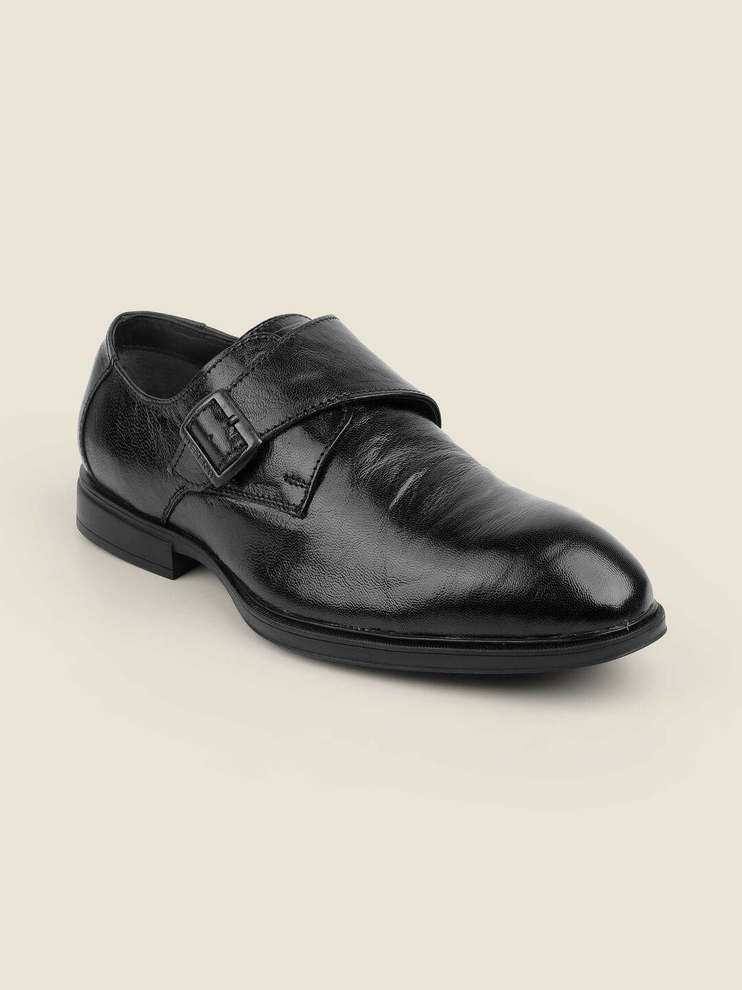 A pair of black solid round-toe formal monks with regular styling has a buckle closureLeather upperCushioned footbedTextured and patterned Rubber outsoleWarranty: 1 MonthWarranty provided by brand/manufacturer