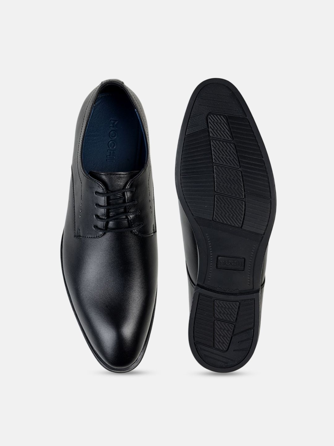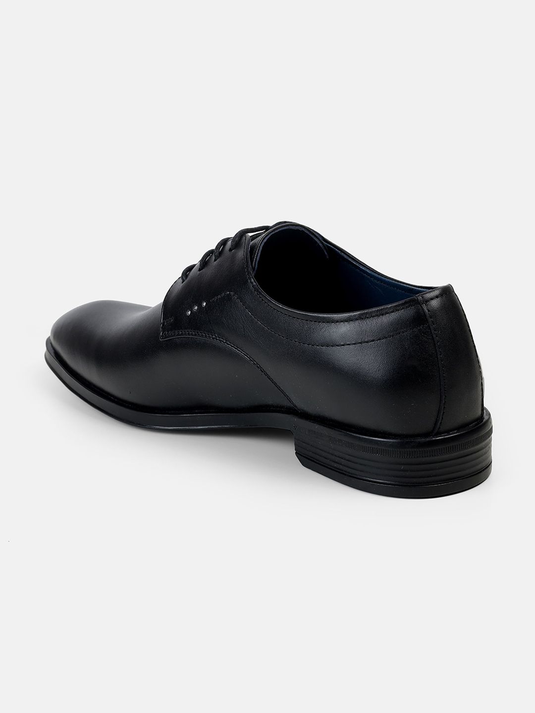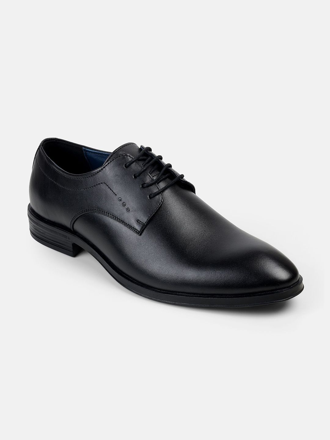 A pair of black solid round-toe formal derbys with regular styling has a lace-up closureLeather upperCushioned footbedTextured and patterned TPR outsoleWarranty: 1 MonthWarranty provided by brand/manufacturer