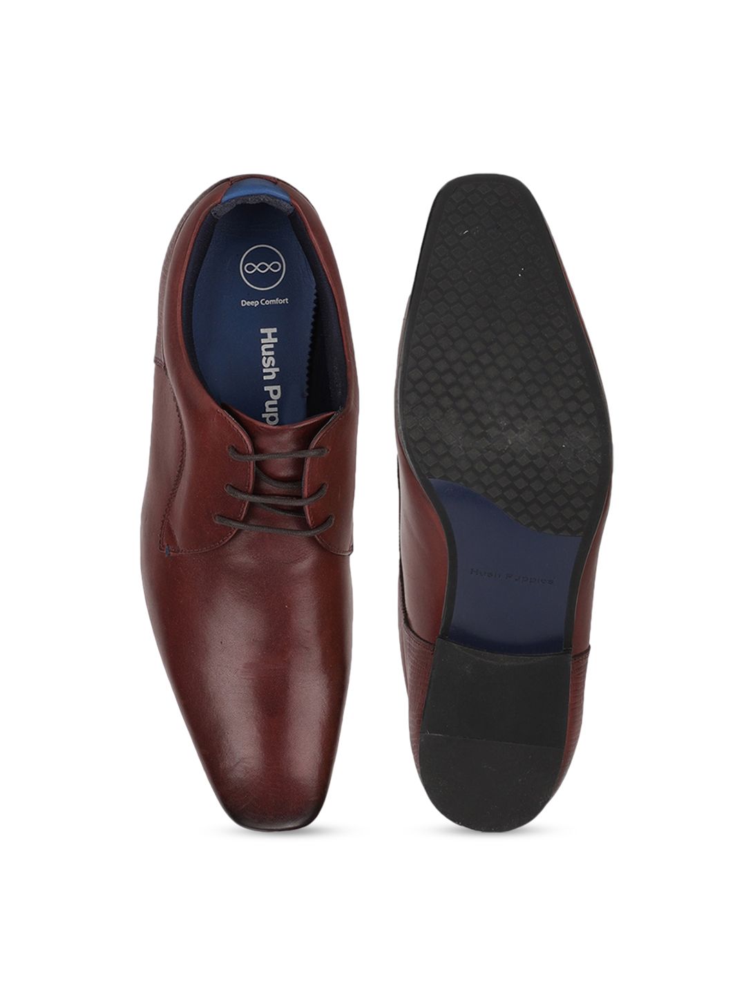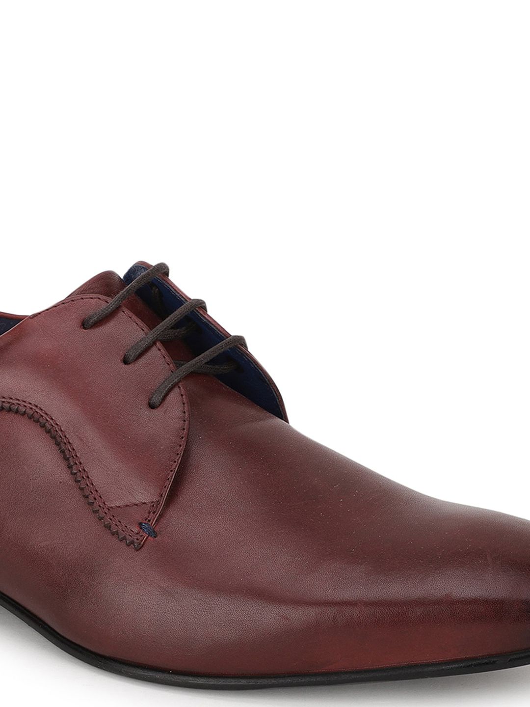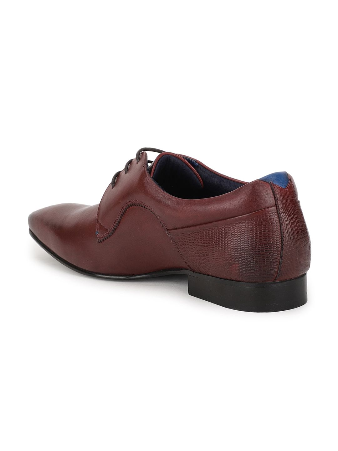 A pair of brown textured round-toe formal derbys with regular styling has a lace up closureLeather upperCushioned footbedTextured and patterned TPR outsole