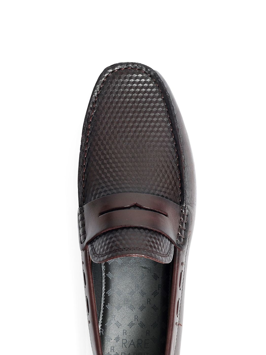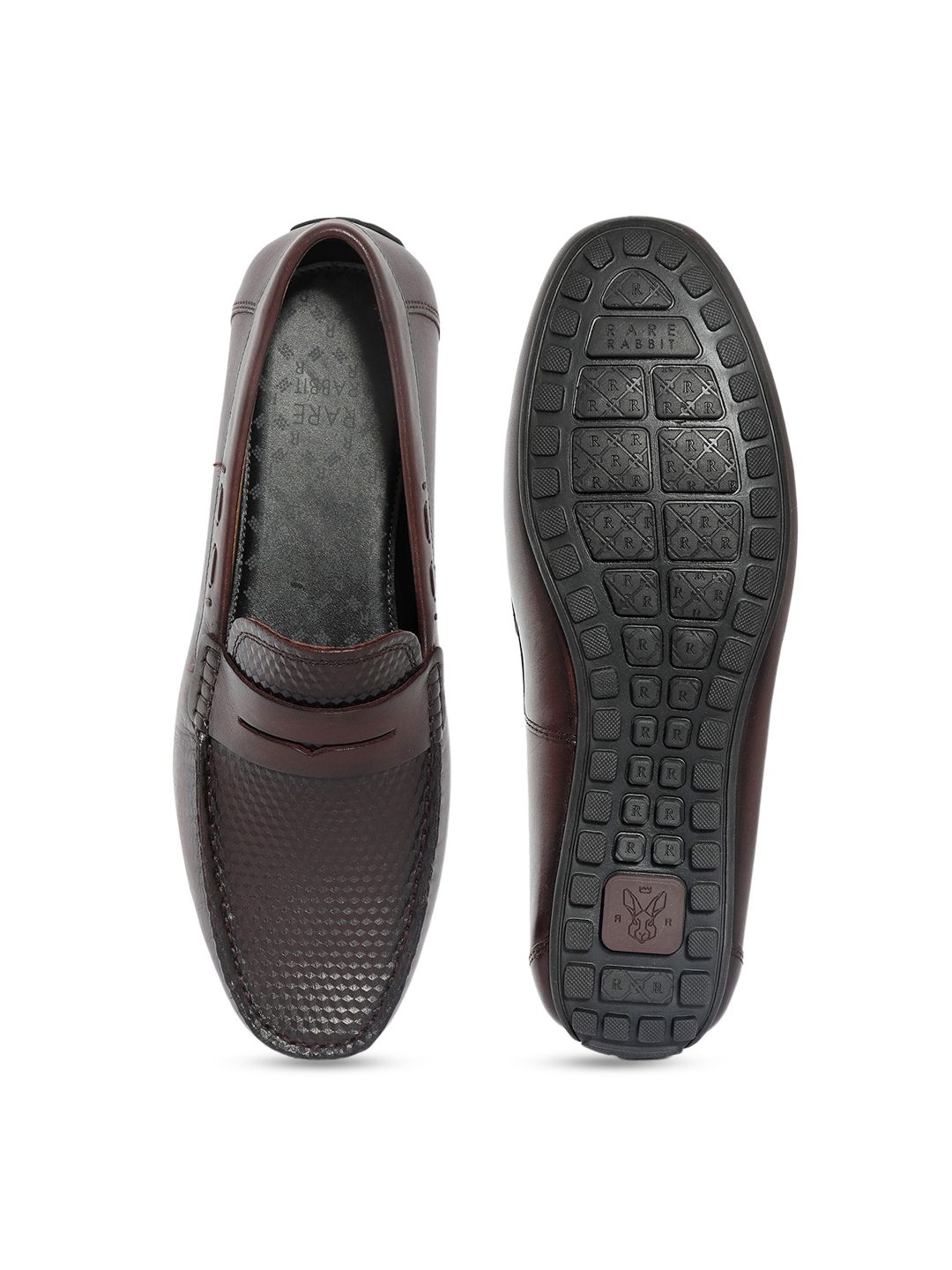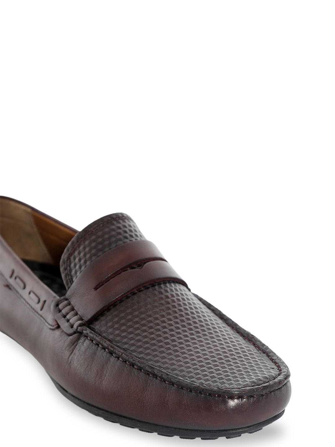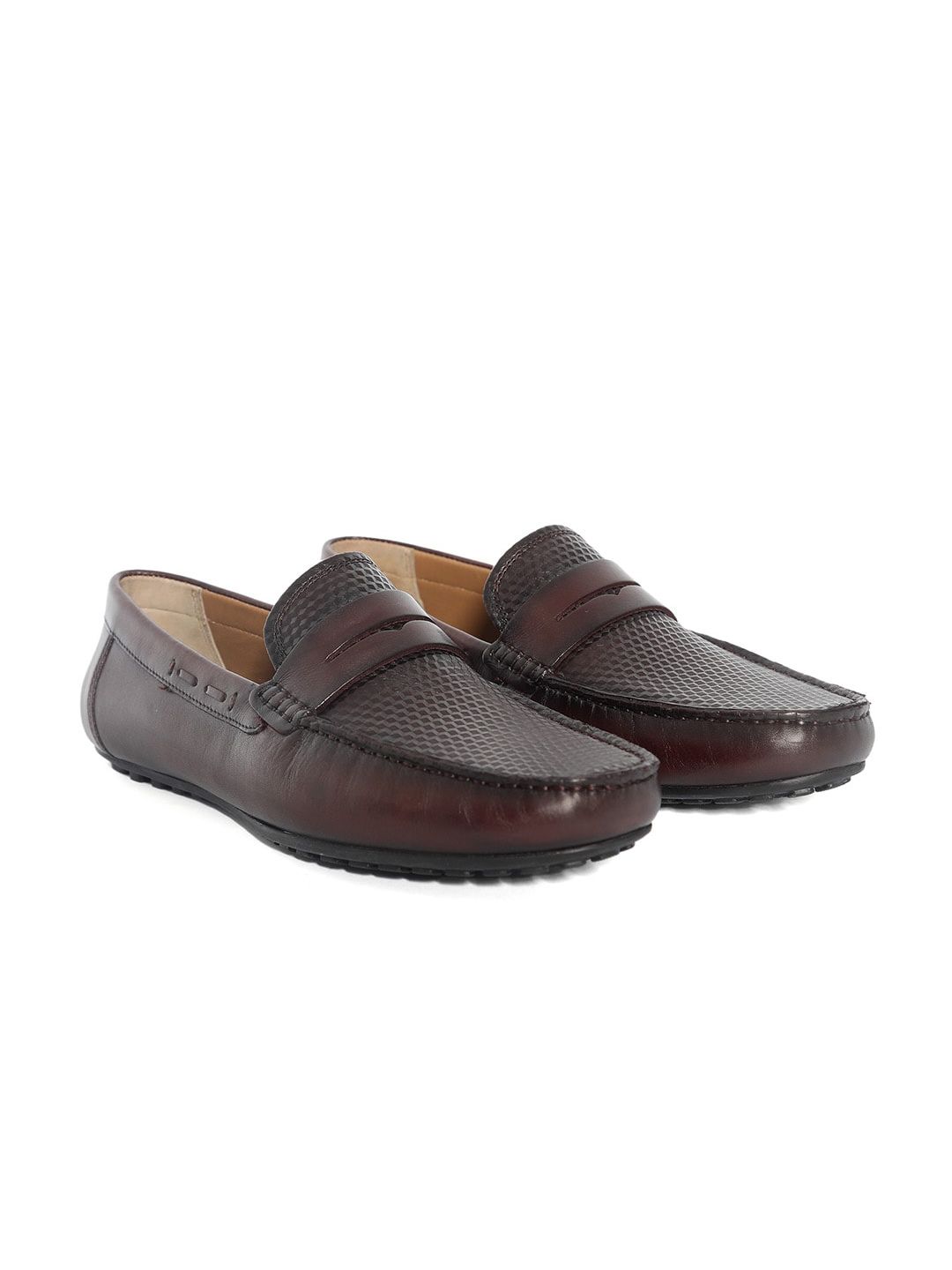 A pair of burgundy textured round-toe formal loafers with regular styling has a slip-on closureLeather upperCushioned footbedTextured and patterned TPR outsole