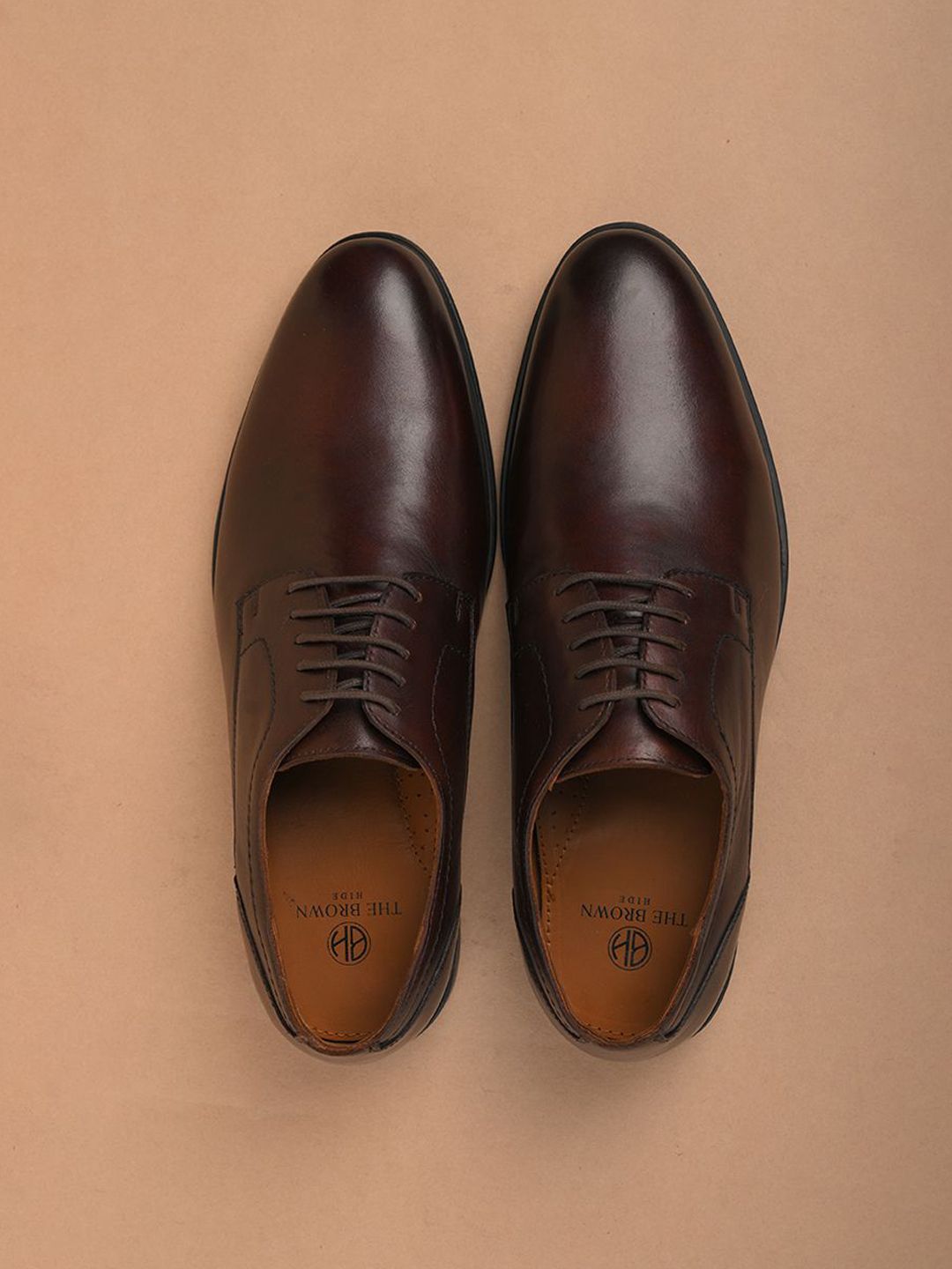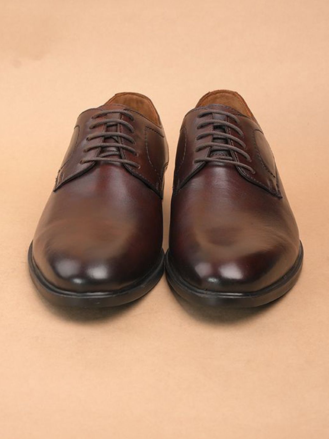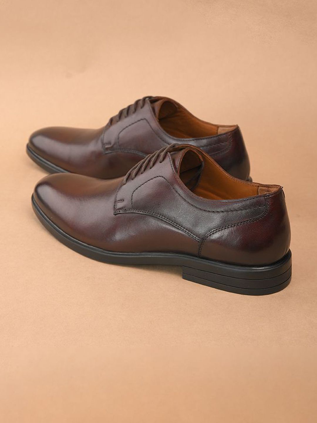 A pair of brown solid round-toe formal derbys with regular styling has a lace-up closureLeather upperCushioned footbedTextured and patterned TPR outsoleWarranty: 6 MonthsWarranty provided by brand/manufacturer